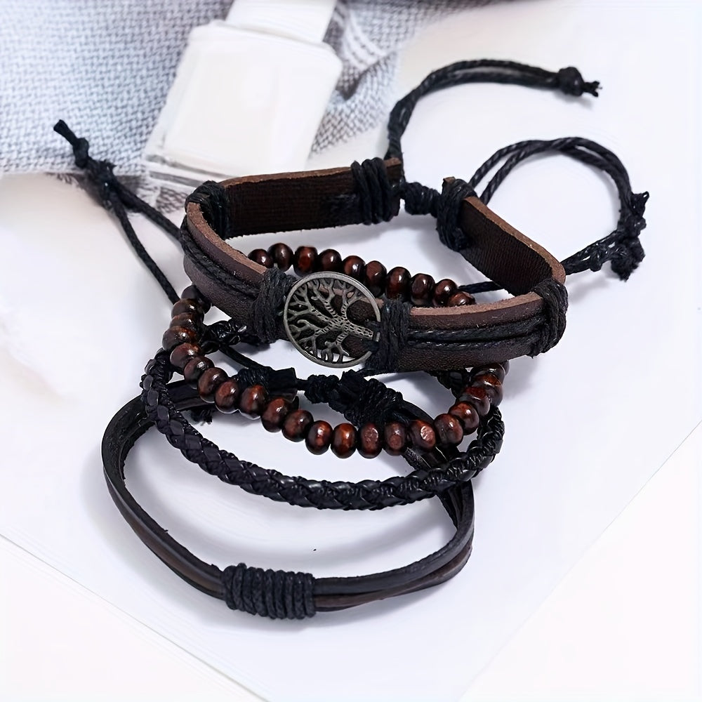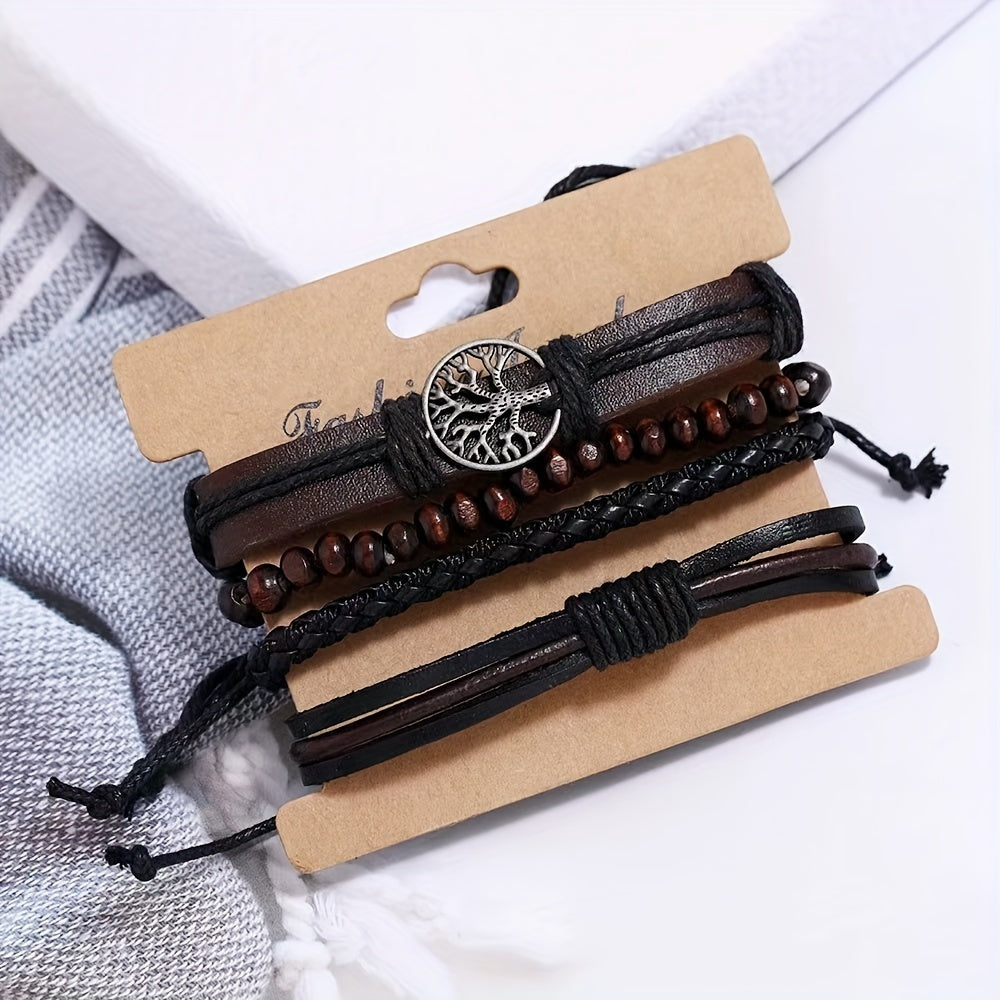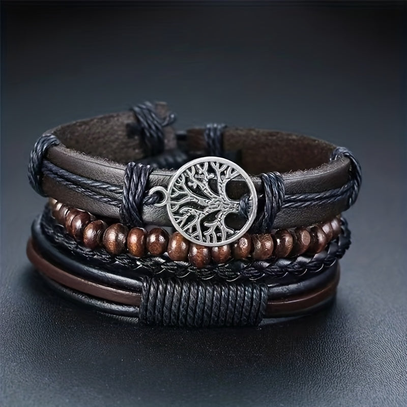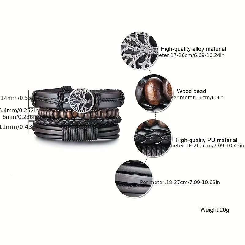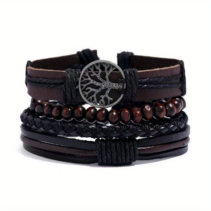 Add a touch of ethnic style to your wrist with this 4-piece set of braided leather men's bangle. Each bangle features a unique vintage life tree rudder charm and wooden bead for a tribal look.