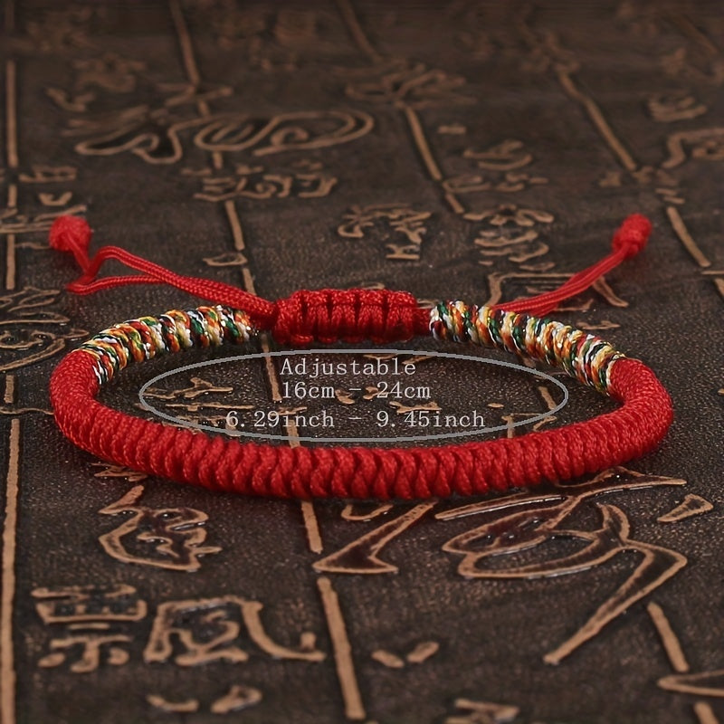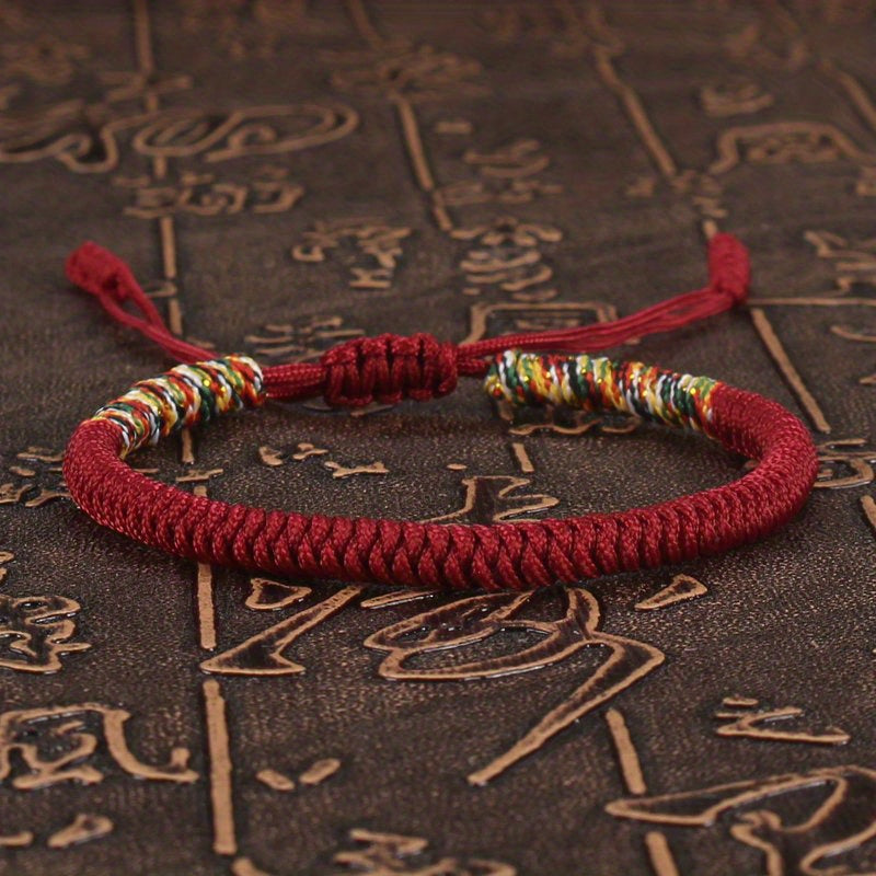 This adjustable Buddhism bracelet features a colorful rope design with a lucky red accent. It is perfect for men looking to add a touch of spirituality to their style.