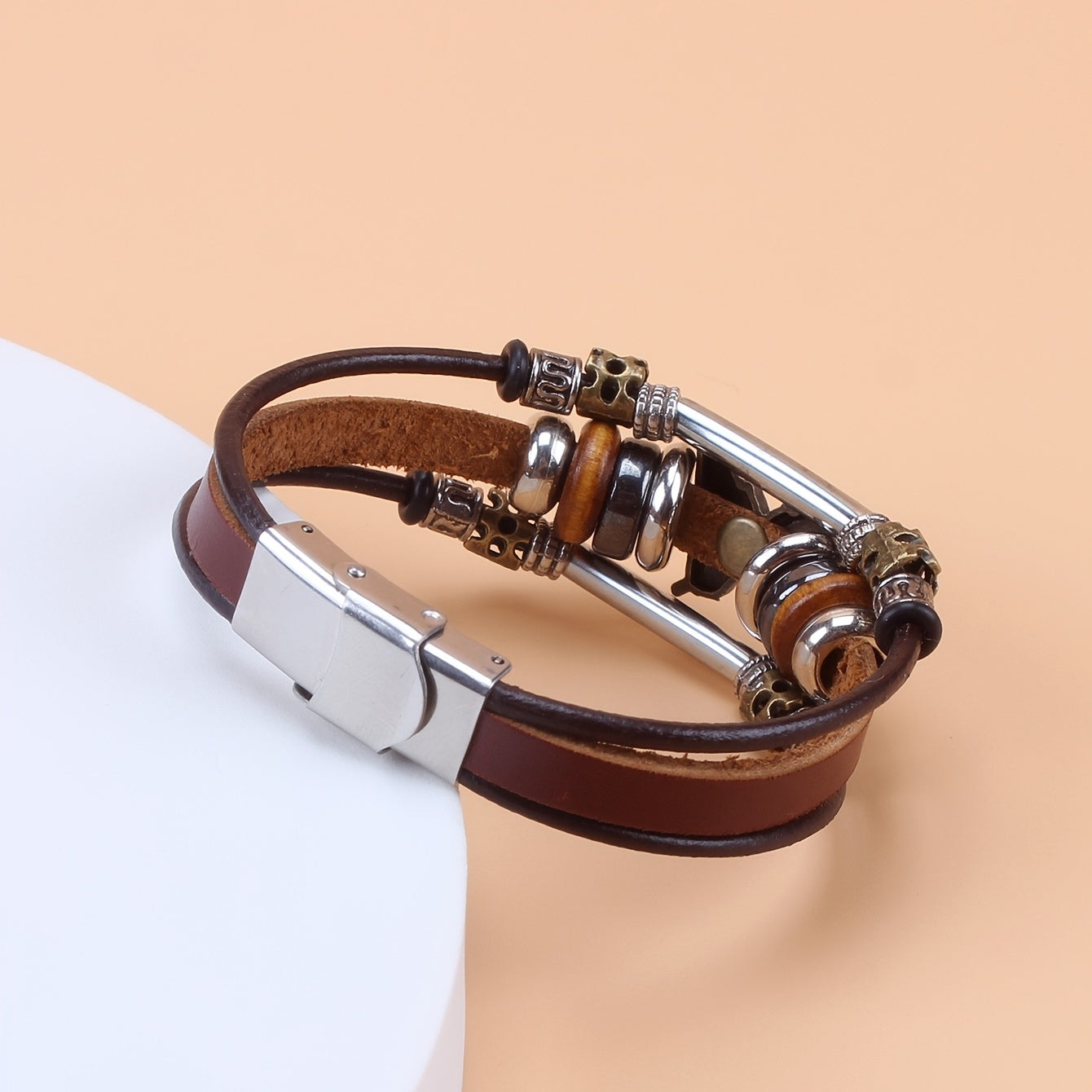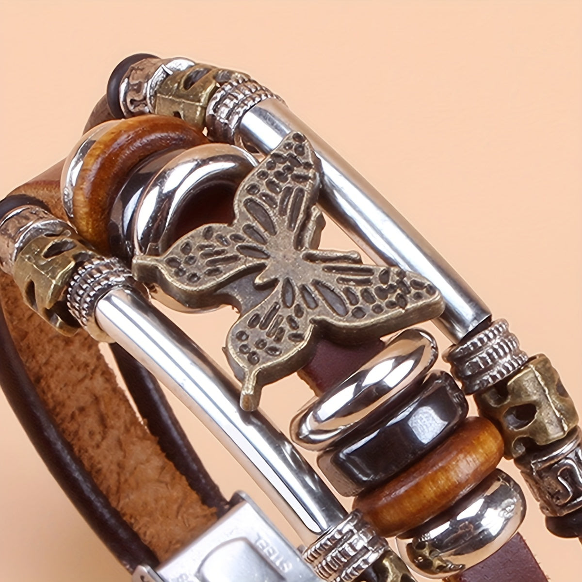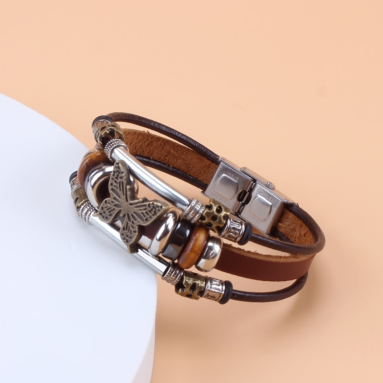 This vintage style bracelet features a butterfly design on a PU leather band with a stainless steel buckle.