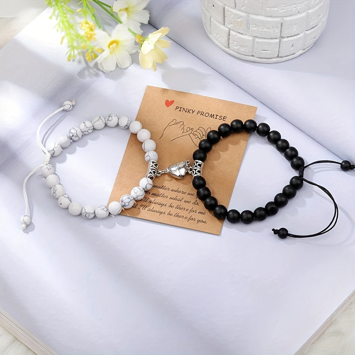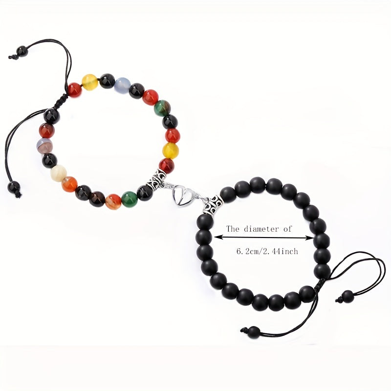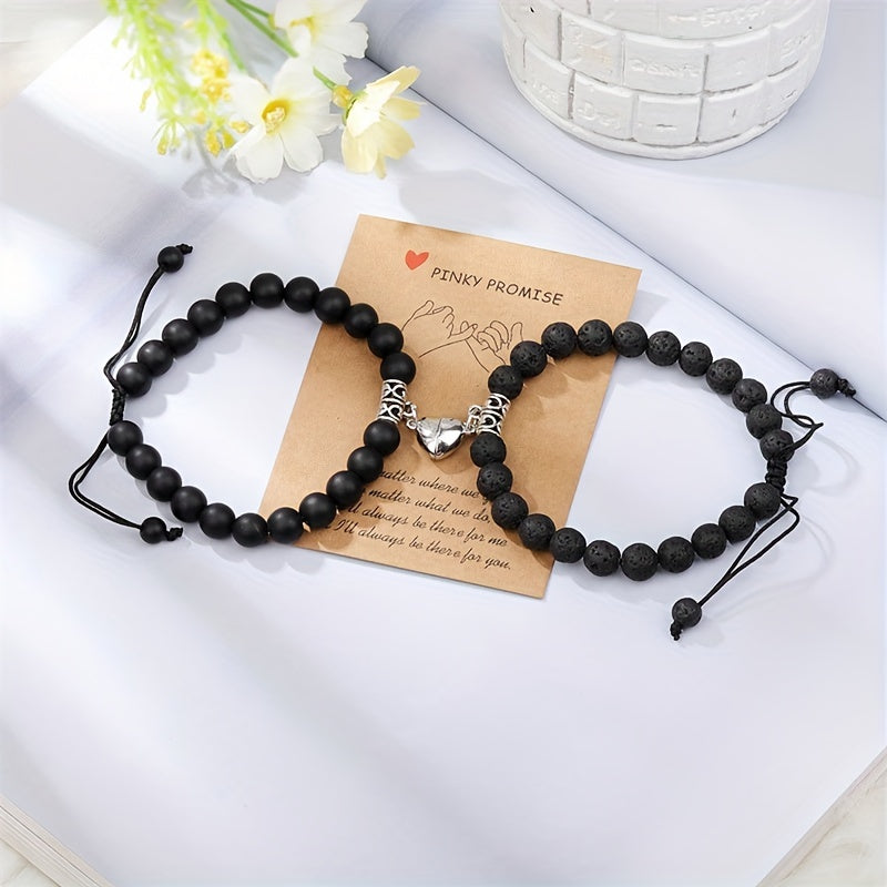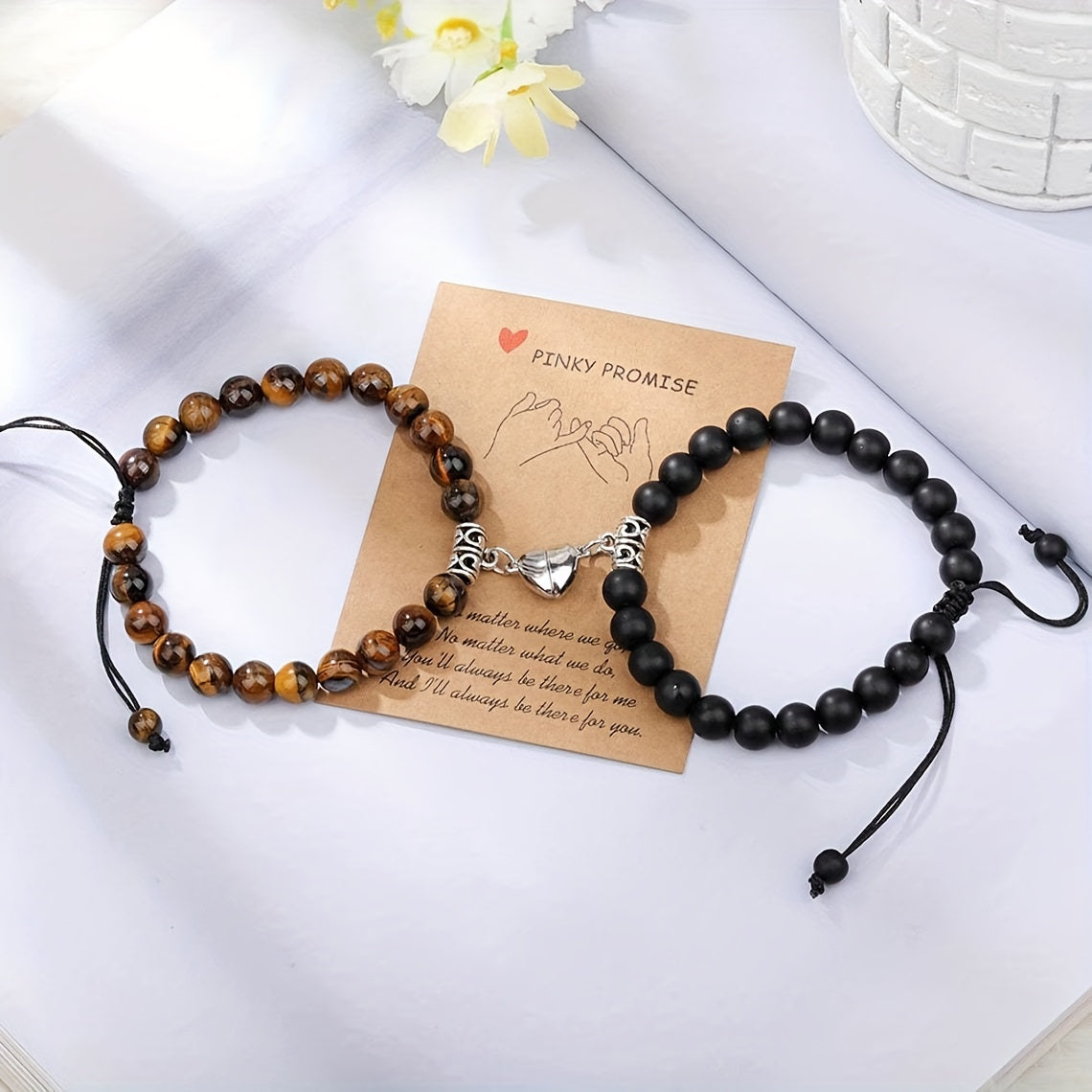 Get these trendy magnetic couple bracelets featuring tiger eye stone and volcanic stone beads. Adjustable design for a perfect fit.