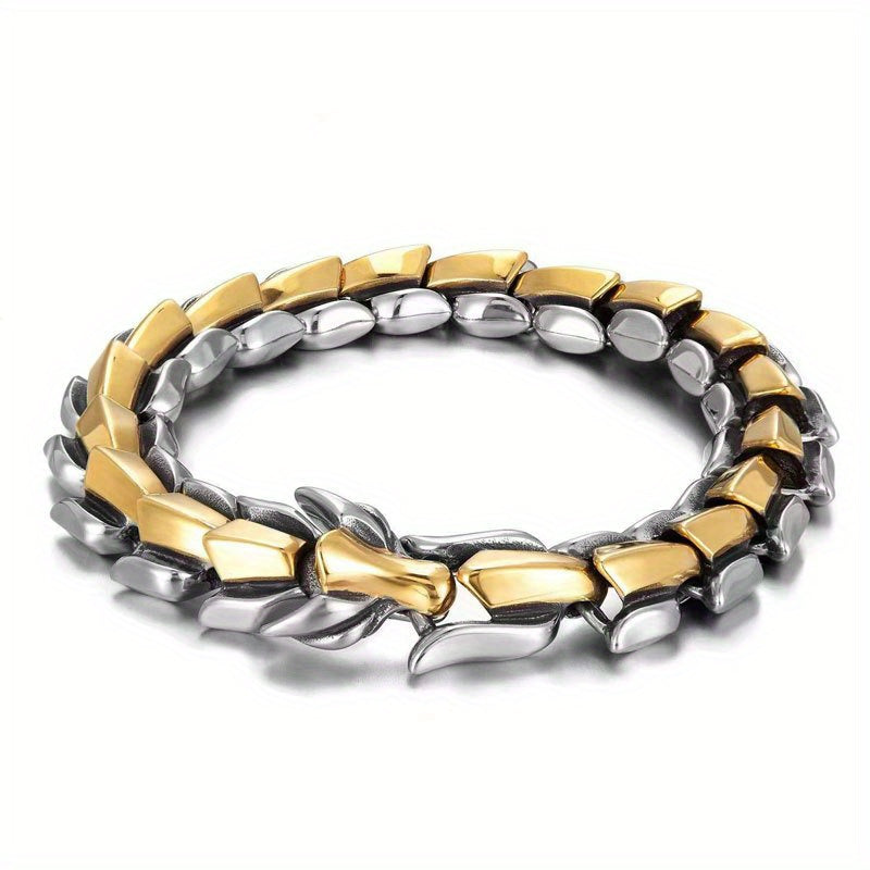 This hip hop hand jewelry features a dragon head design with a vintage dragon monogram and dragon bone details. The bracelet is silver plated and designed to make a bold statement.