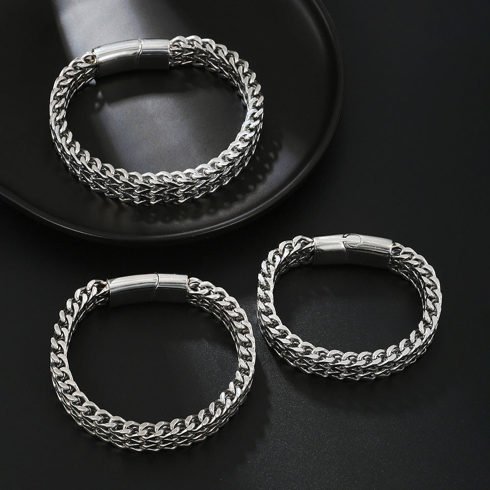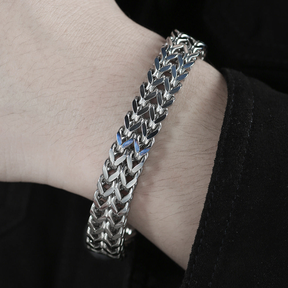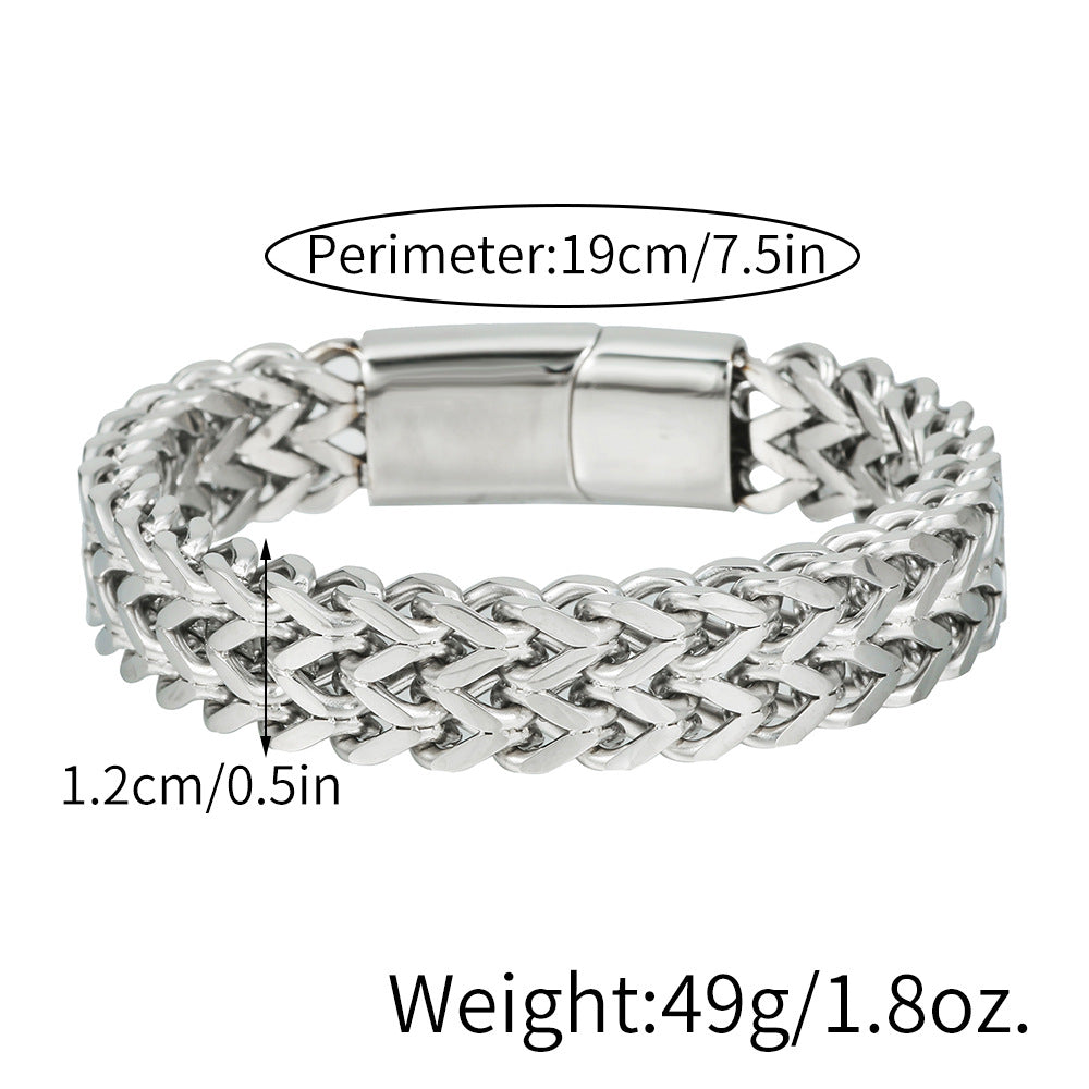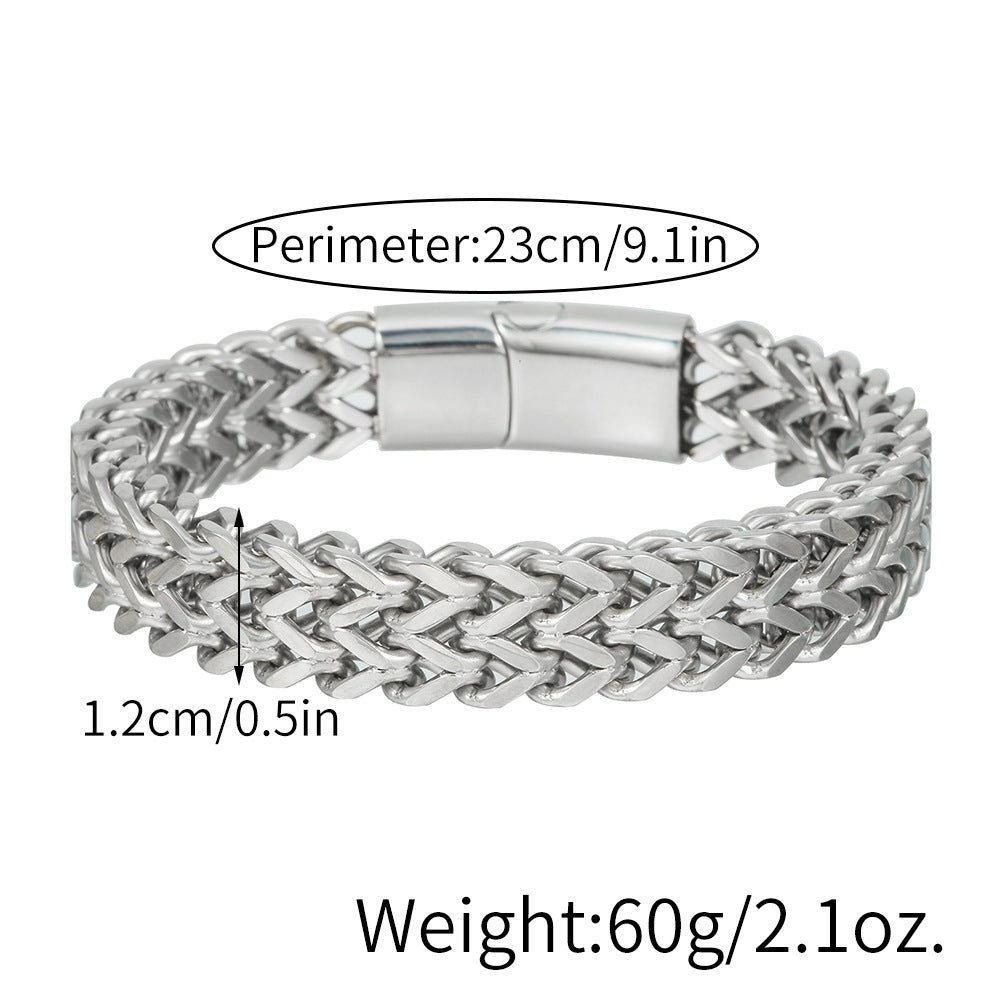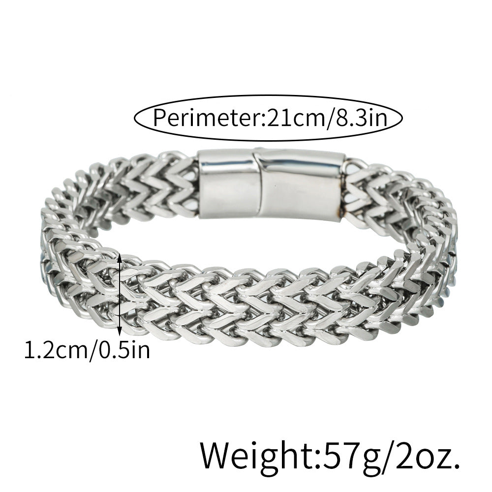 This stainless steel bracelet features a braided design with a positive reverse dragon bone pattern. It has a magnet buckle for easy wear and is made of durable titanium steel.