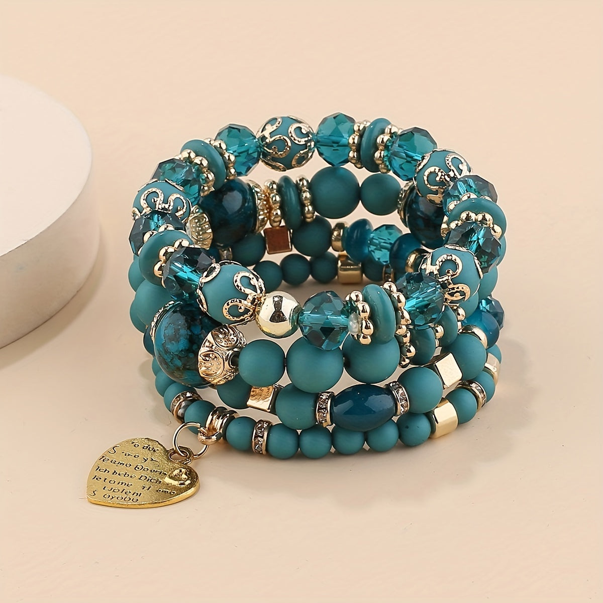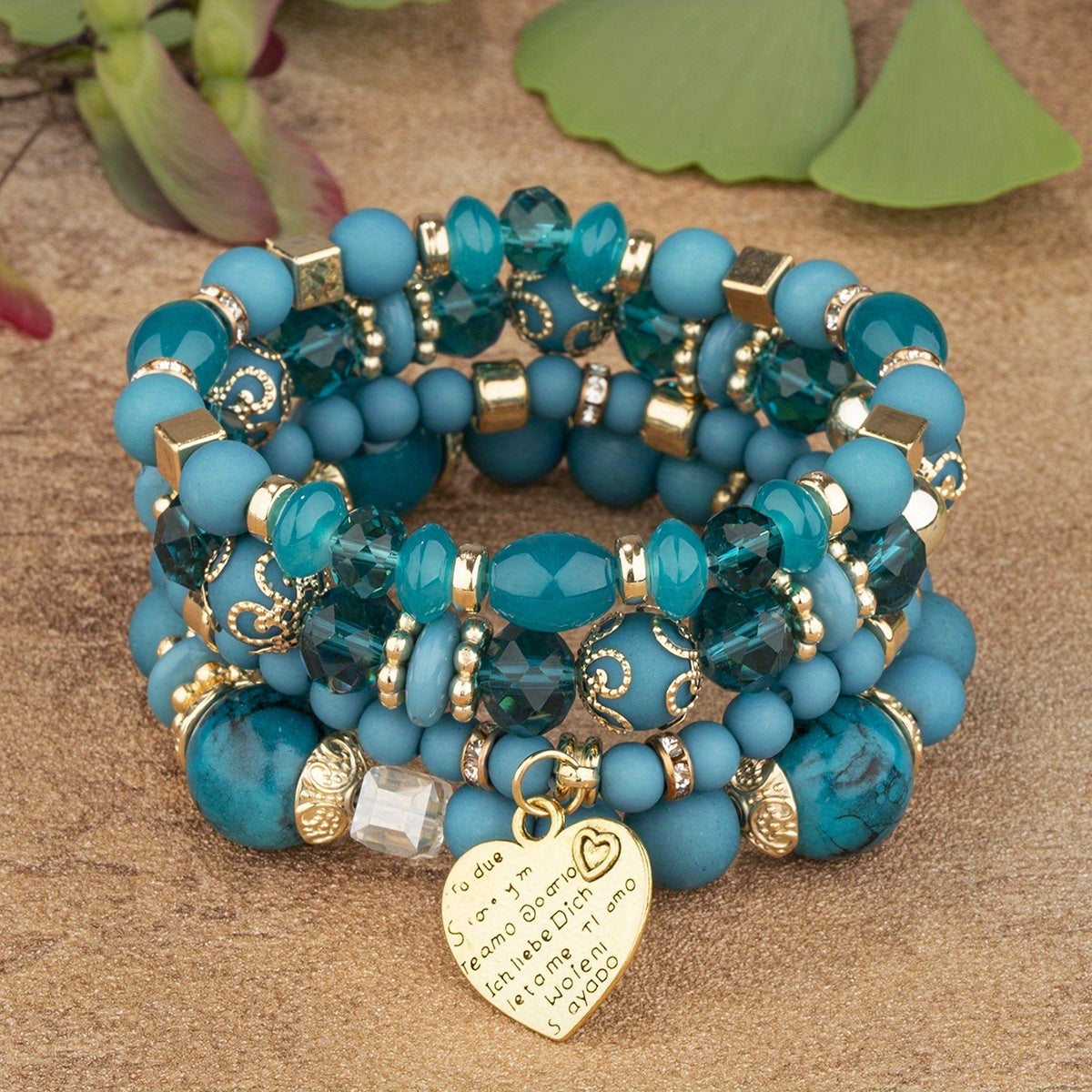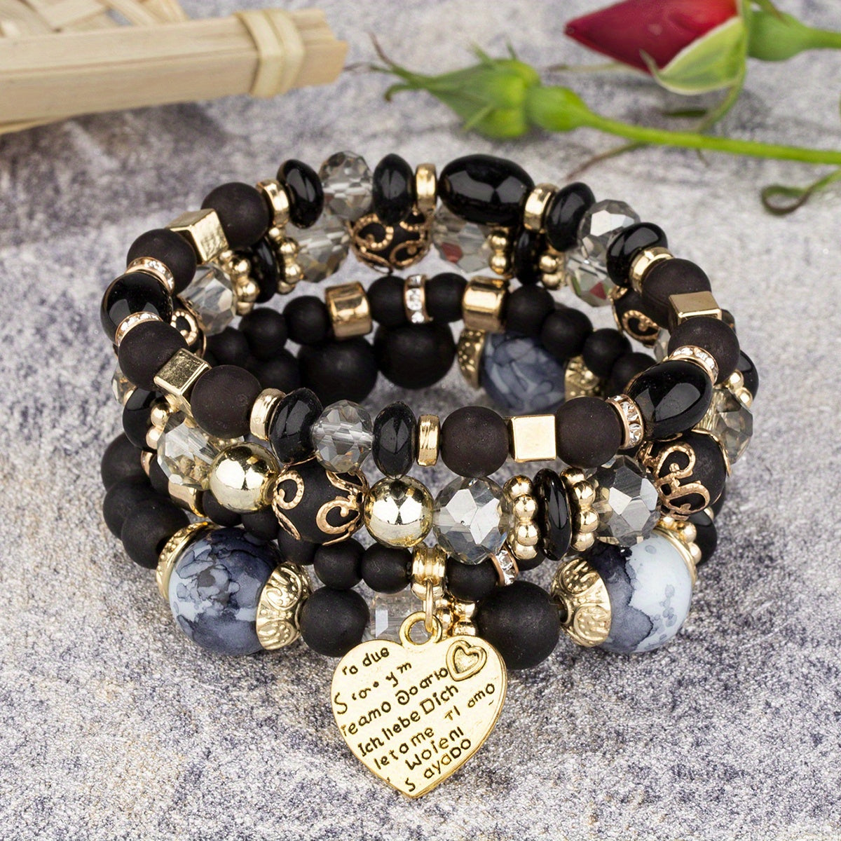 Heart Charm Beads Layered Bracelet Set Vintage Jewelry Gift
