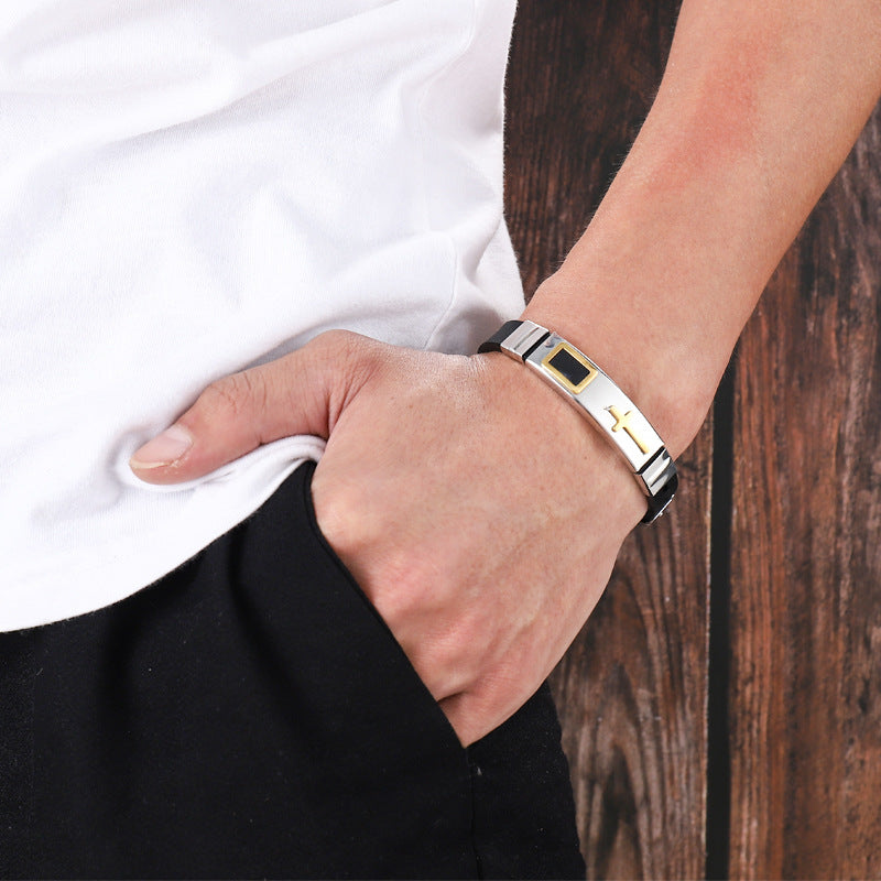 This hip hop bracelet features a stylish cross design made of titanium steel with a silicone band.