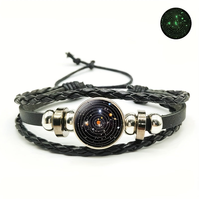 This unique PU leather braided bracelet features a mesmerizing starry sky pattern, with a time gemstone accent. Perfect for adding a touch of celestial charm to your accessories.