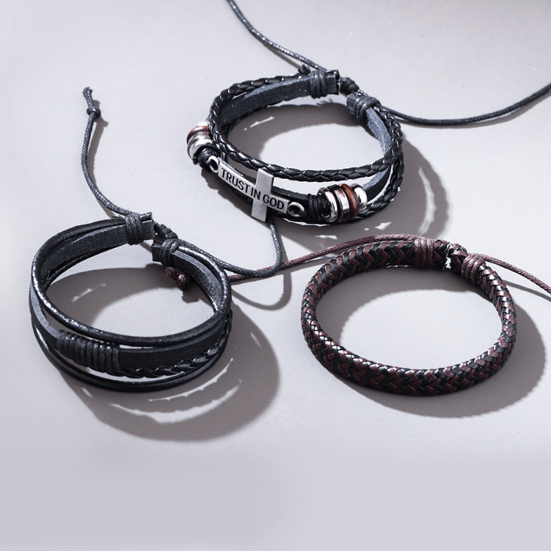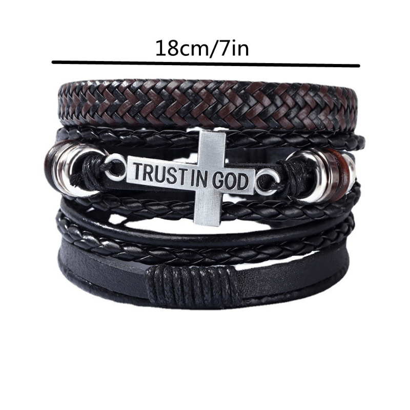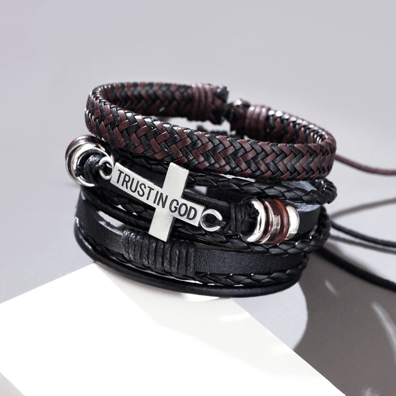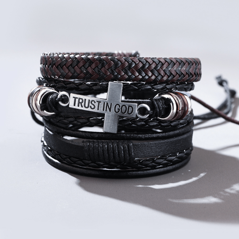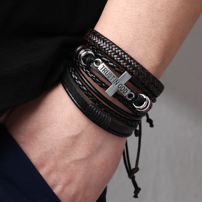 This set includes a combination of hand-knit braided bracelets with a cross pendant. A great accessory for men's fashion.