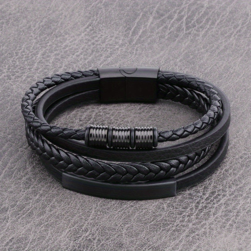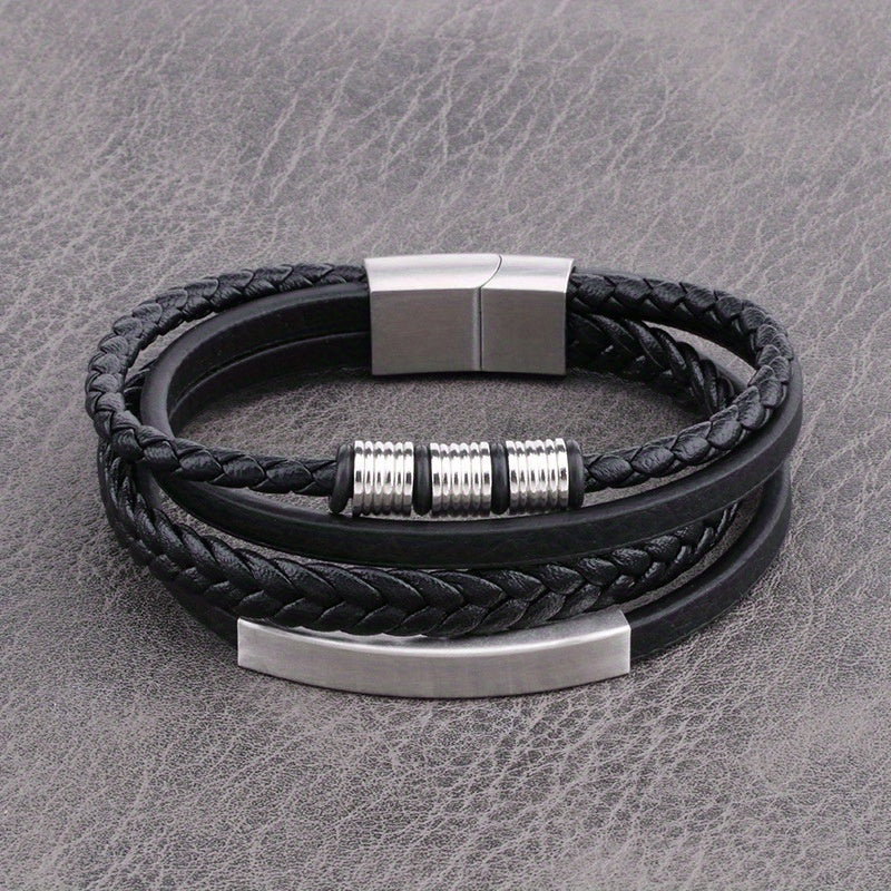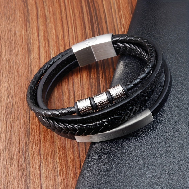 This creative leather rope bracelet features a layered design for a stylish look. Hand-woven with high-quality leather, this bracelet is perfect for casual or dressy occasions.