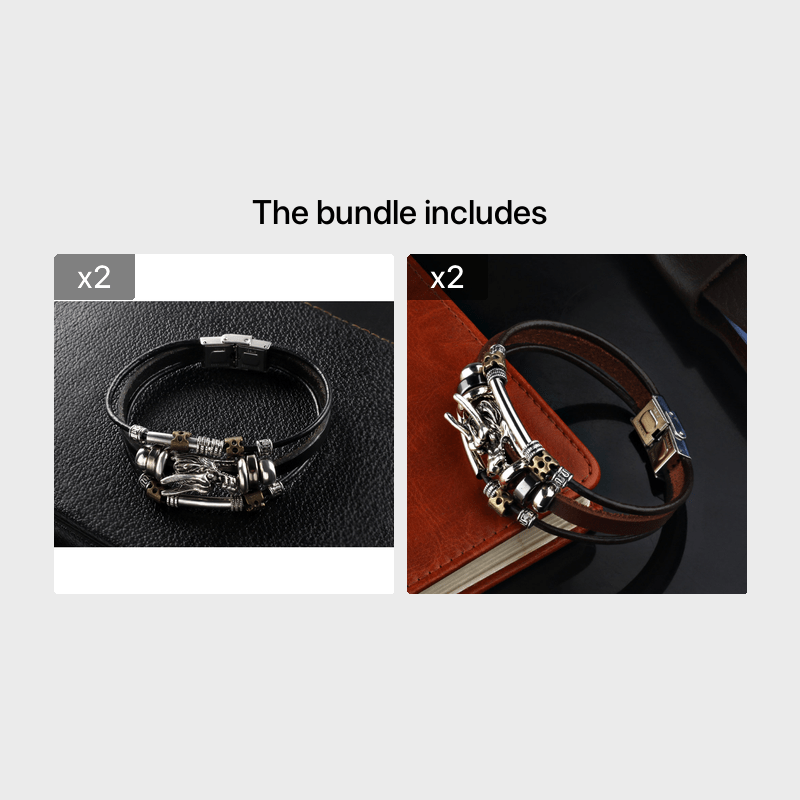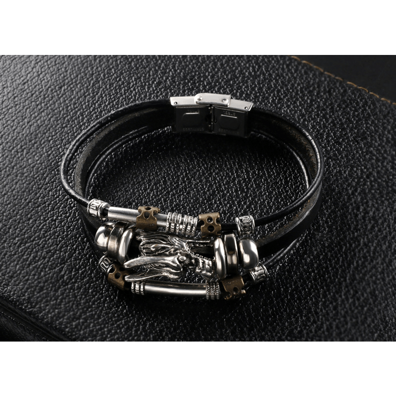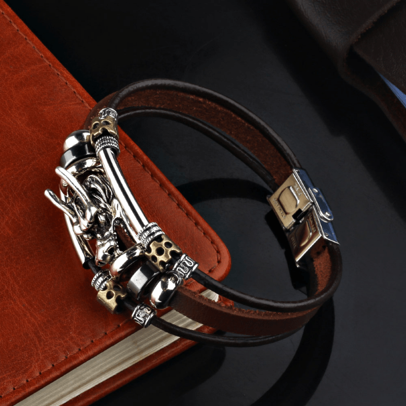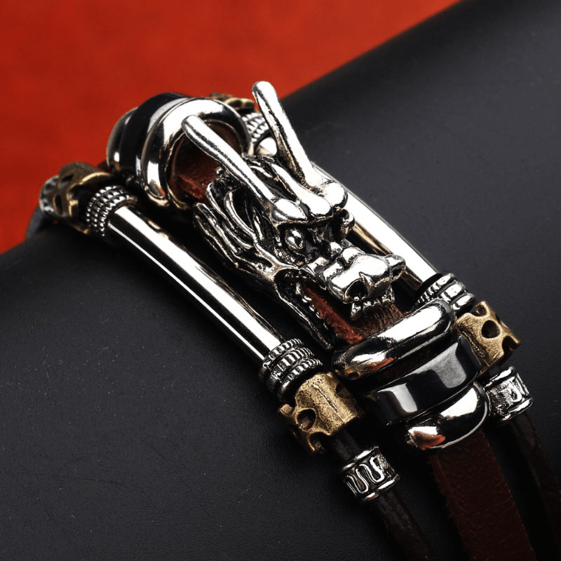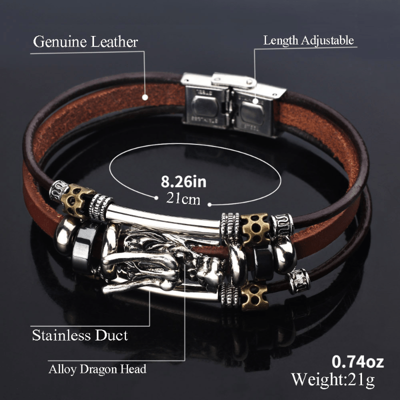 This men's bracelet features a leading dragon design with PU leather and leather rope for a retro style.