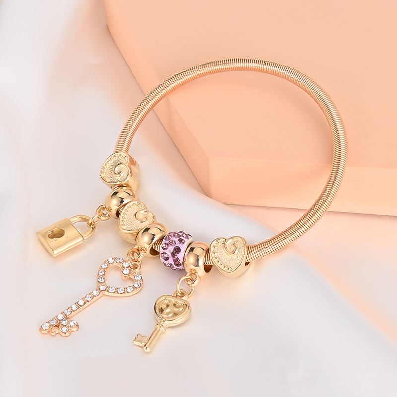 Men's Rhinestone Key Lock Pendant Bracelet Golden Bangle