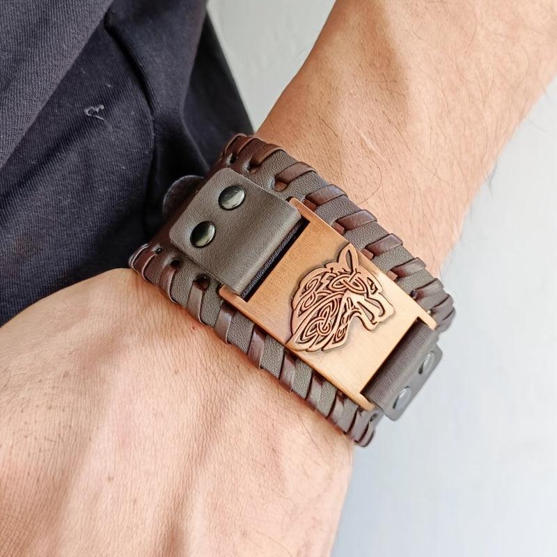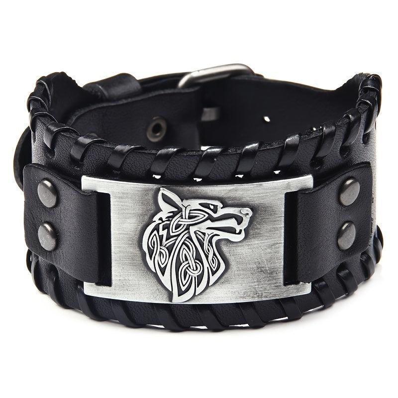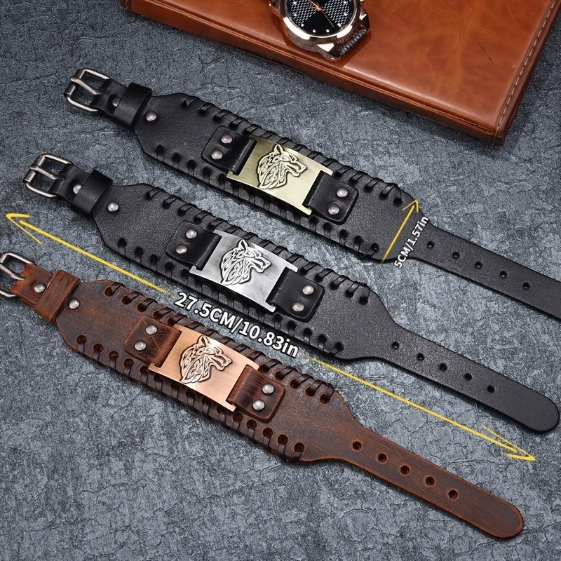Add a touch of rugged style with this wolf head leather bracelet. Made of stainless steel and wide leather band, this bracelet is a sleek accessory.
