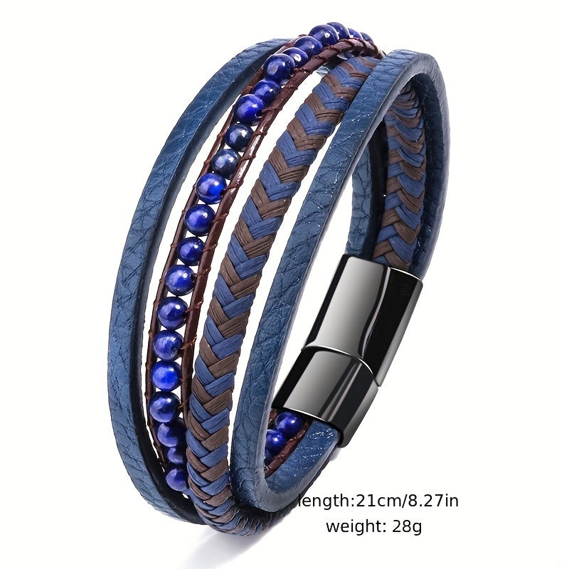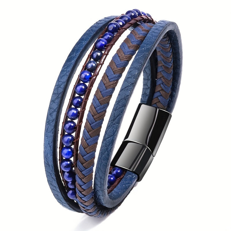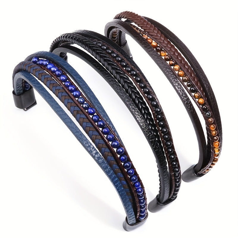 Elevate your style with this woven natural stone leather bracelet featuring a stainless steel buckle. Perfect for adding a touch of rugged sophistication to any outfit.