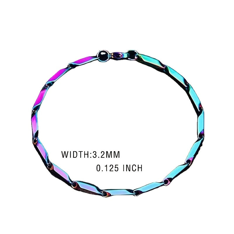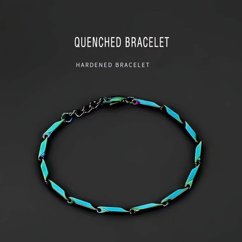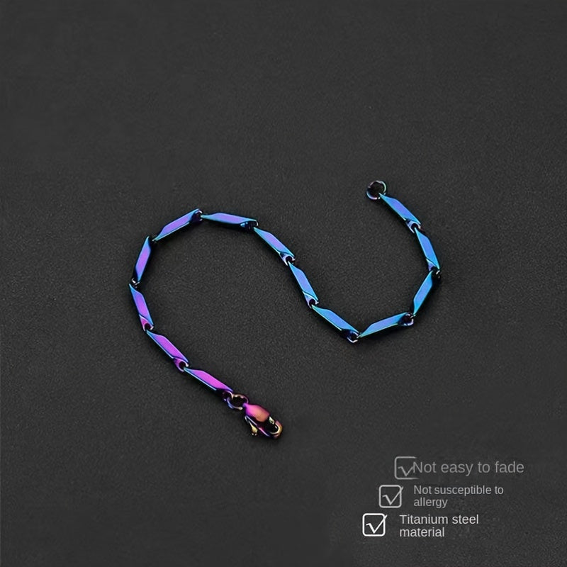 This men's bracelet features a quenched bamboo leaf chain design made from titanium steel with a mesmerizing rainbow finish.