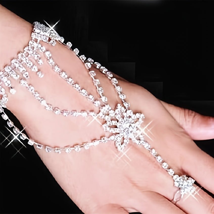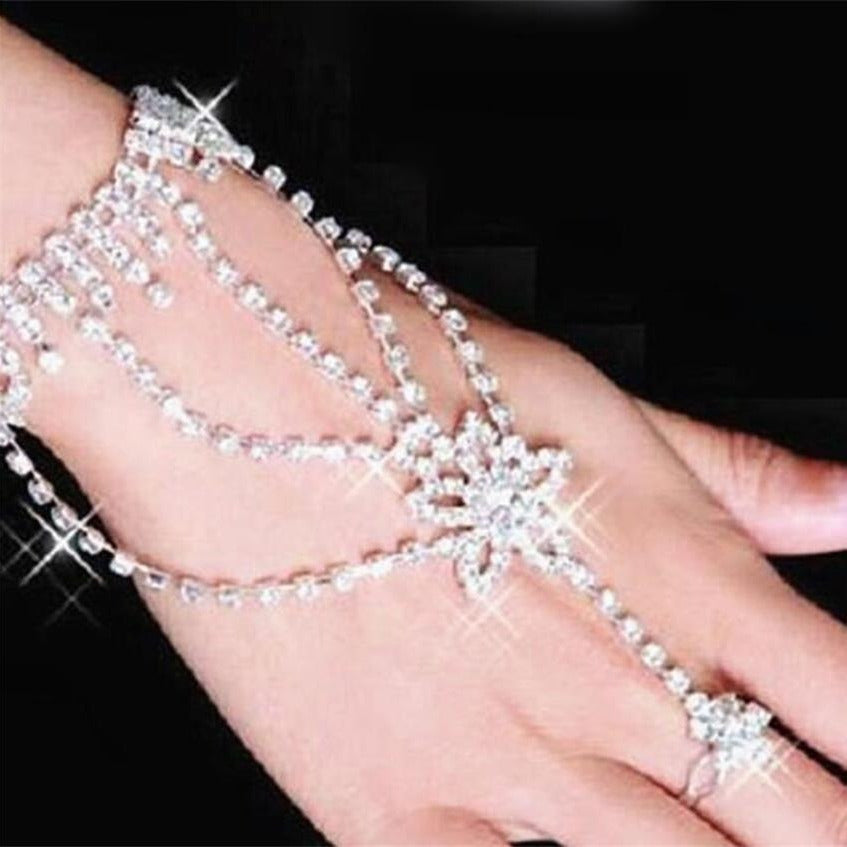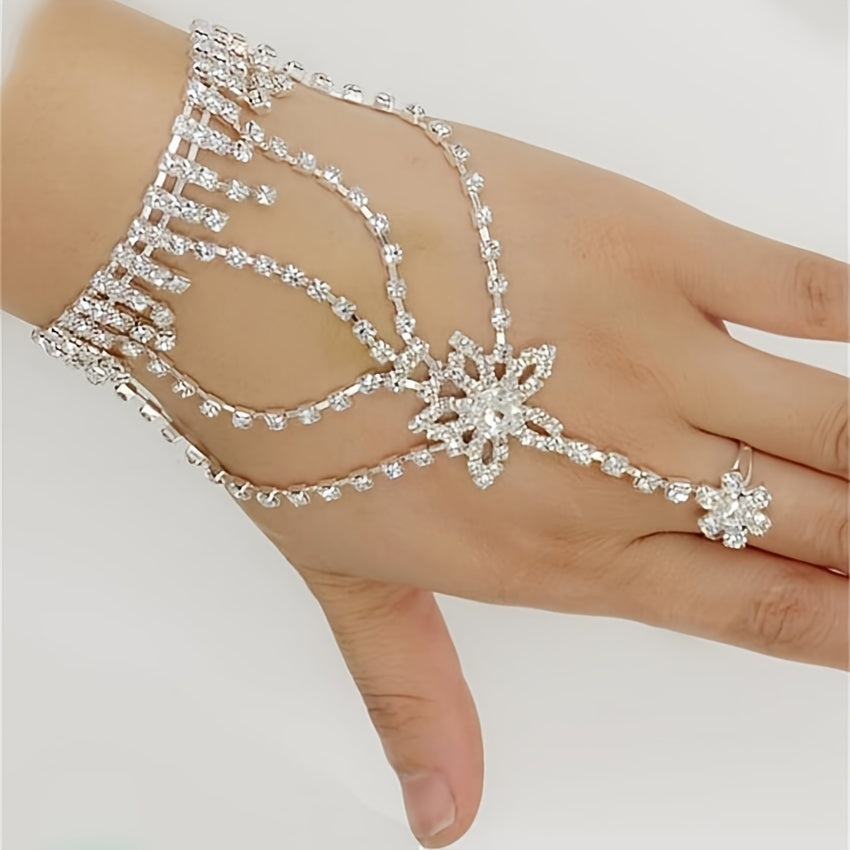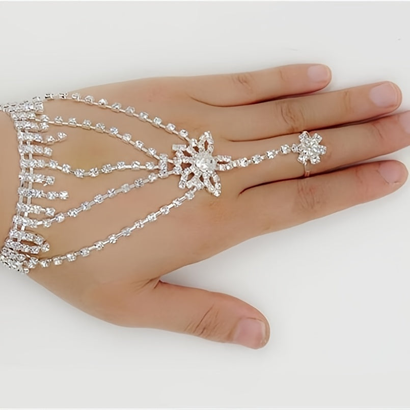 Add a touch of elegance to your wedding dress with this stunning hand jewelry featuring rhinestones. Perfect for special occasions!
