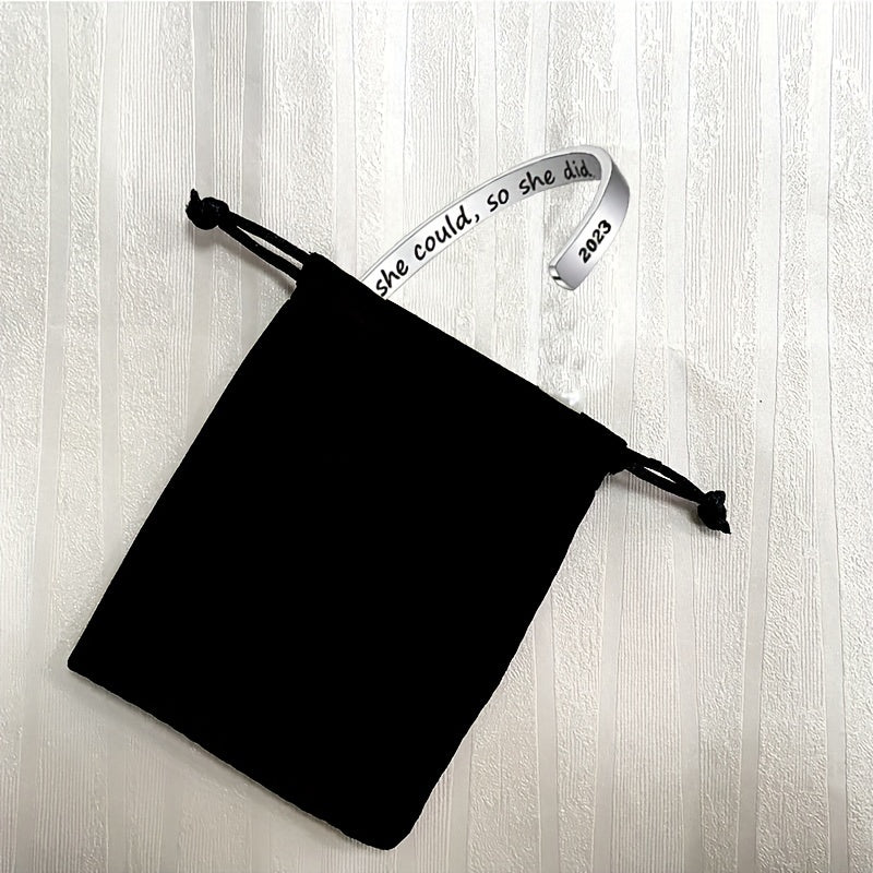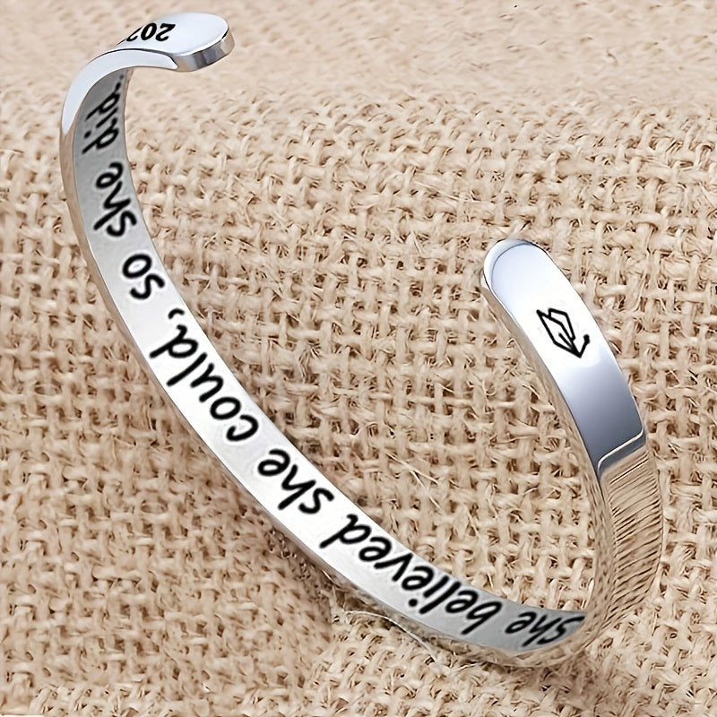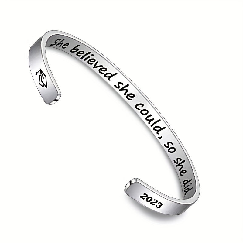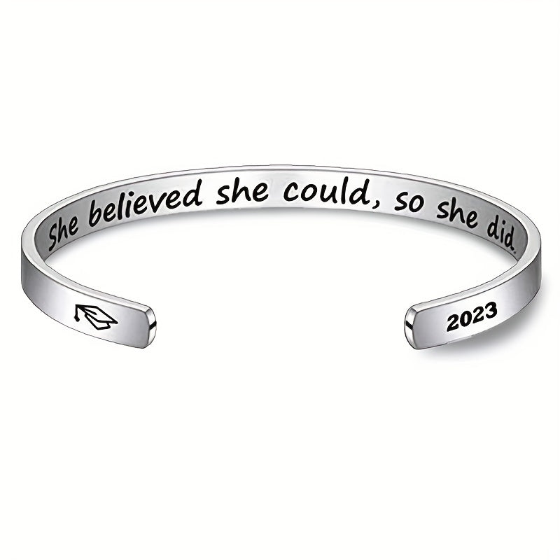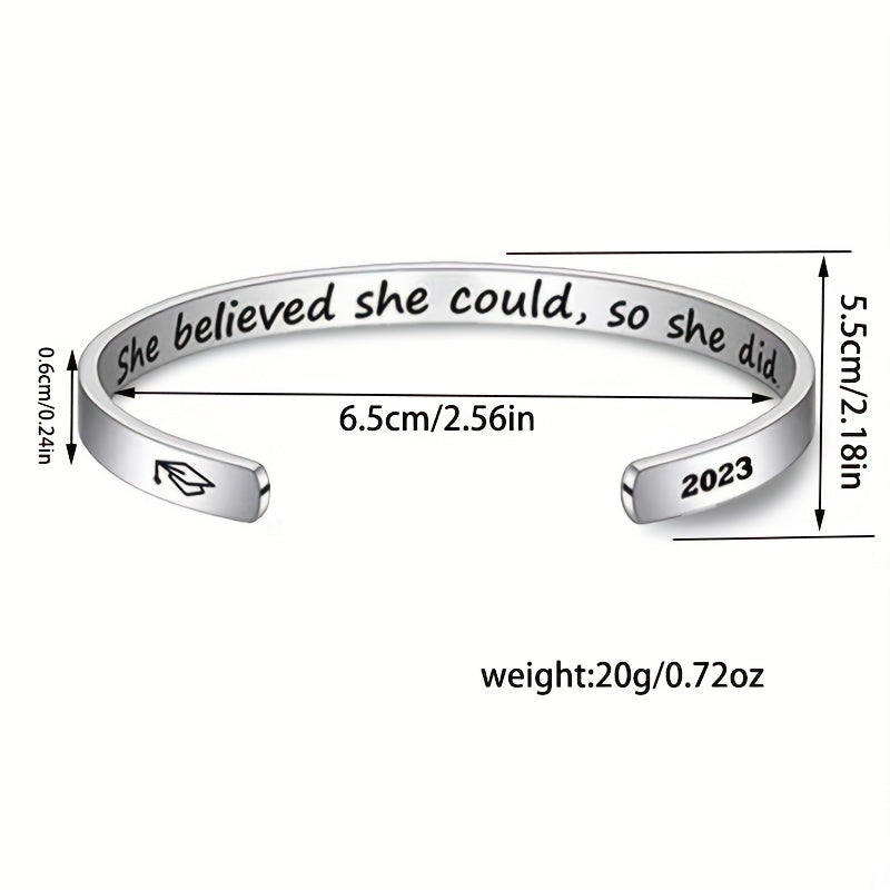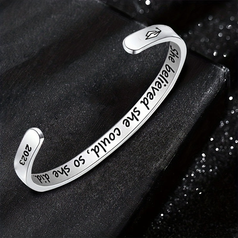 Celebrate your graduation with this elegant stainless steel open bangle featuring the inspiring text 'She Believe She Could So She Did'. The adjustable design ensures a perfect fit for any wrist size.