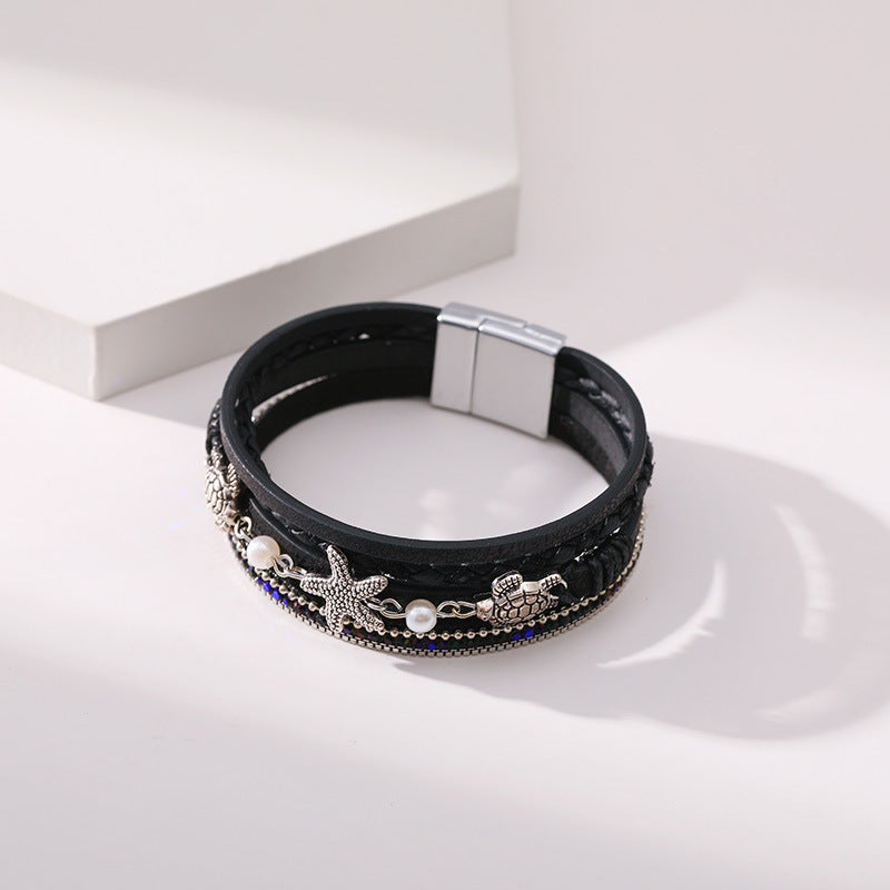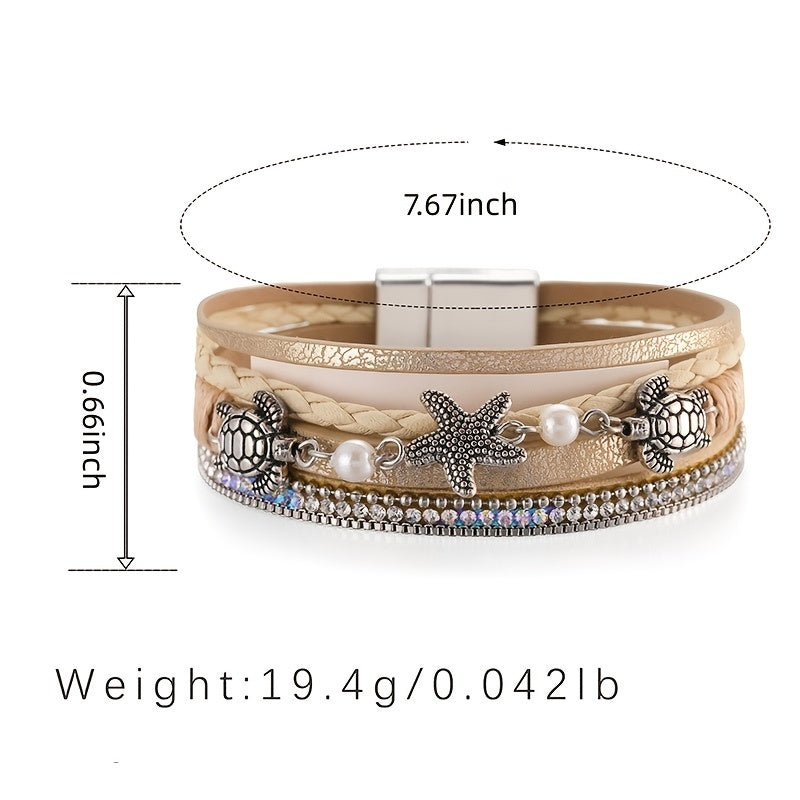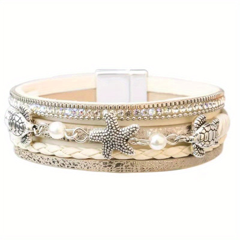 Elevate your holiday style with this multilayer braided bracelet featuring a starfish magnetic clasp. The bangle is inlaid with sparkling rhinestones and made of high-quality PU leather.