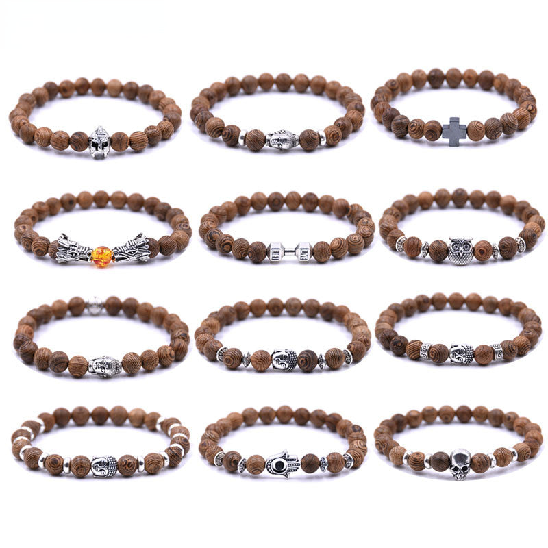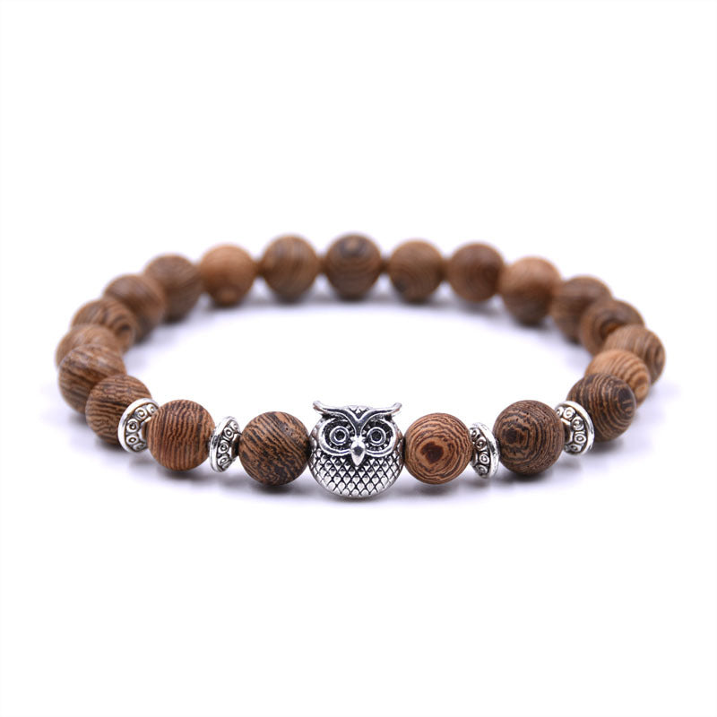 • 8mm wood beads bracelet with owl, skull, and cross accessories