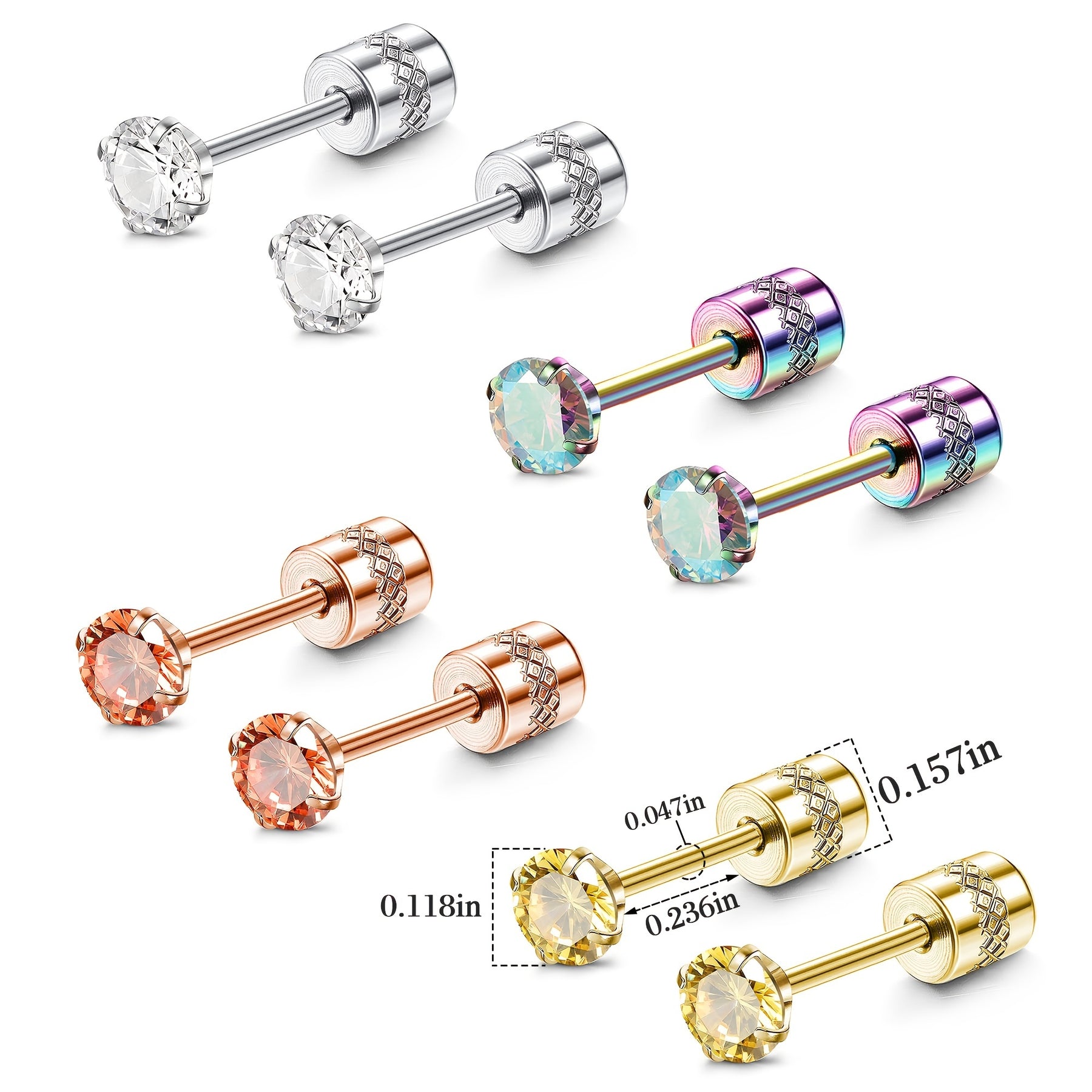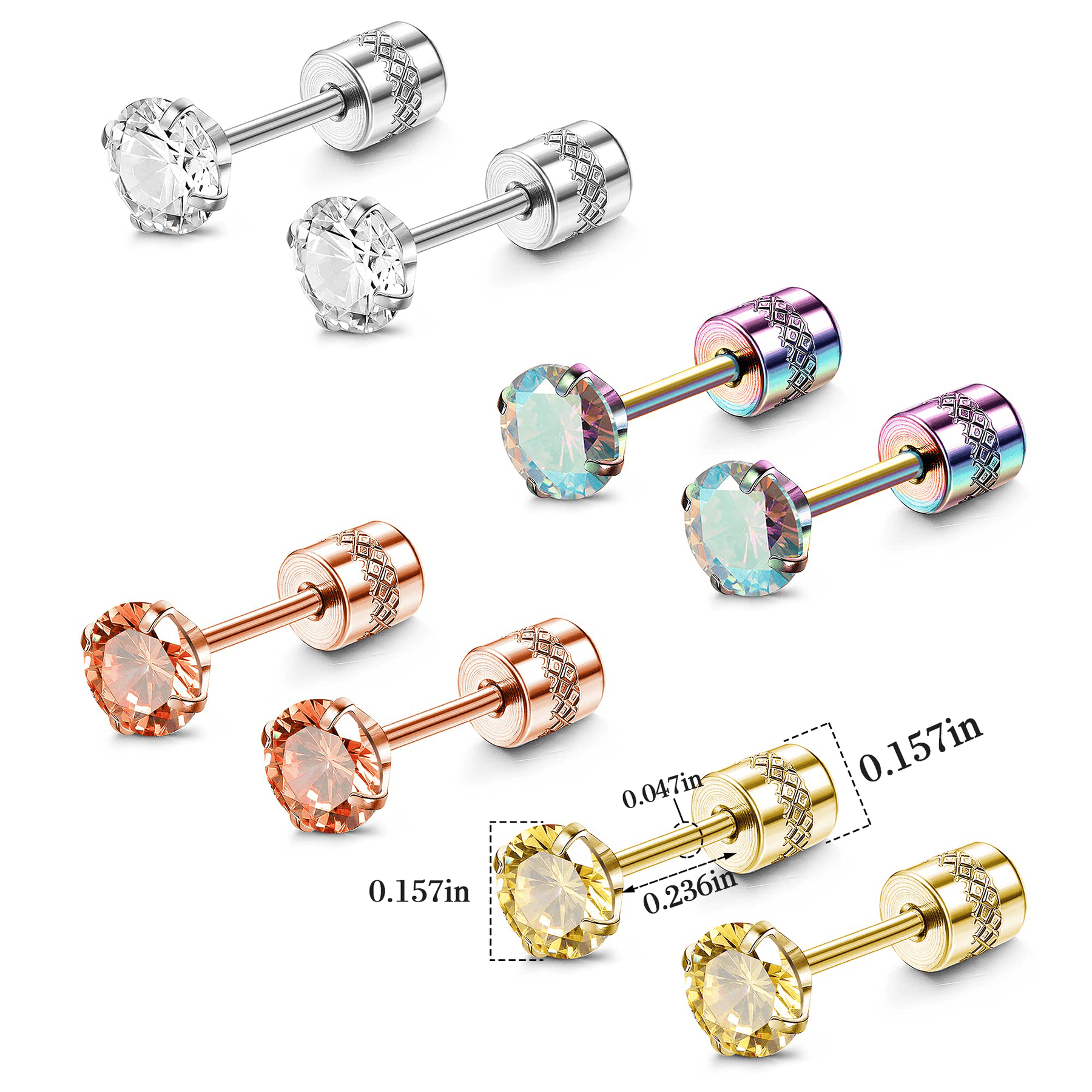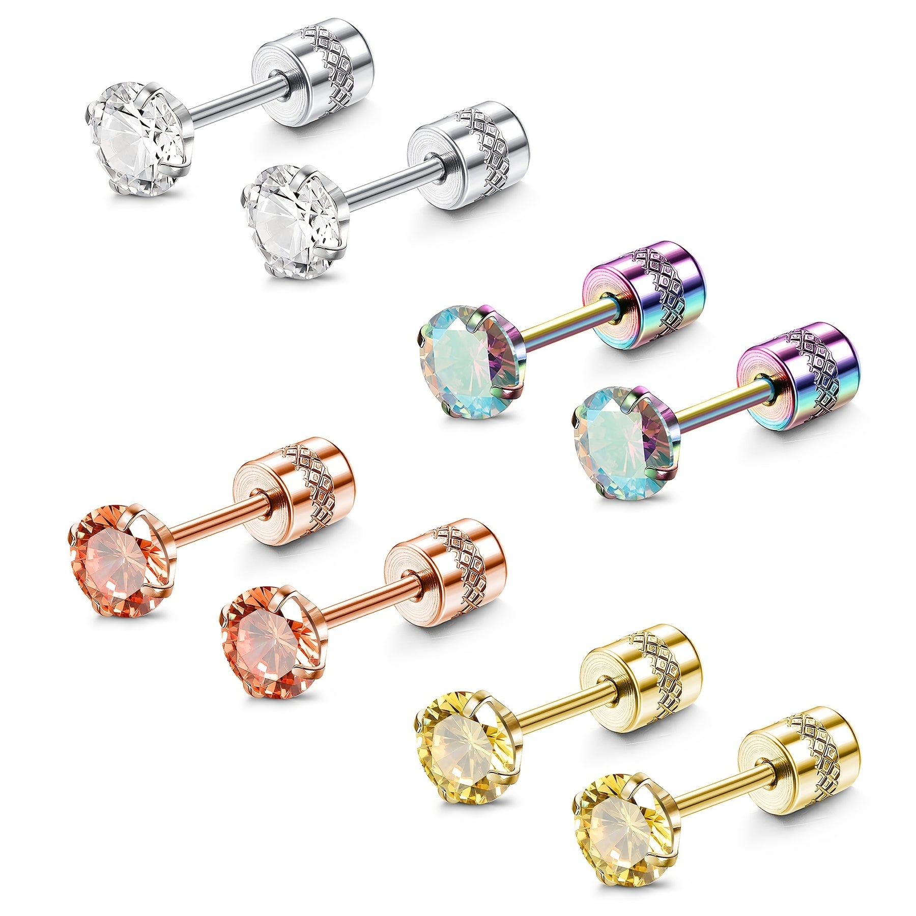 Elevate your style with this 4 pairs of stainless steel stud earrings featuring double round cubic zirconia. Perfect for cartilage piercings with screw back closure.