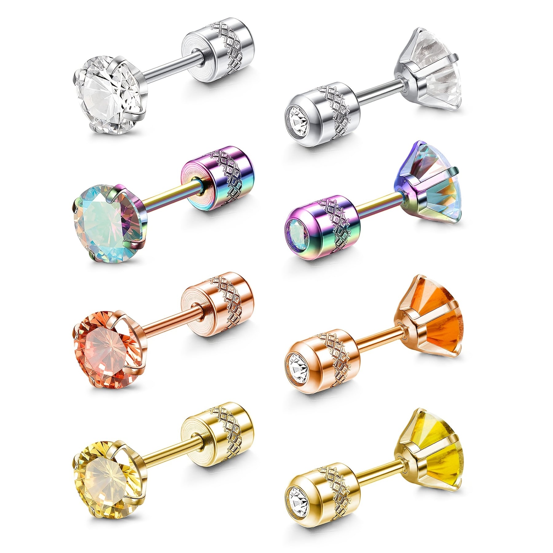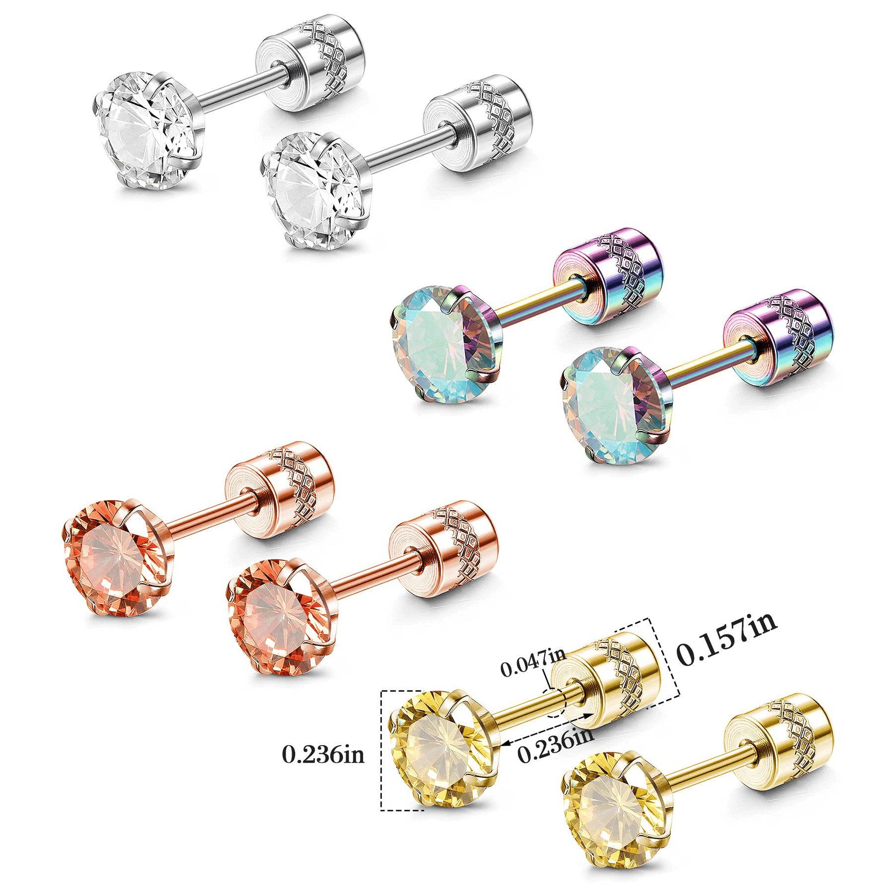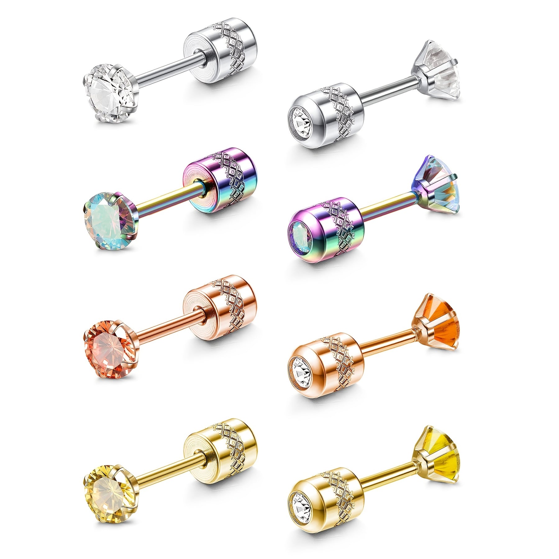 Elevate your style with this 4 pairs of stainless steel stud earrings featuring double round cubic zirconia. Perfect for cartilage piercings with screw back closure.
