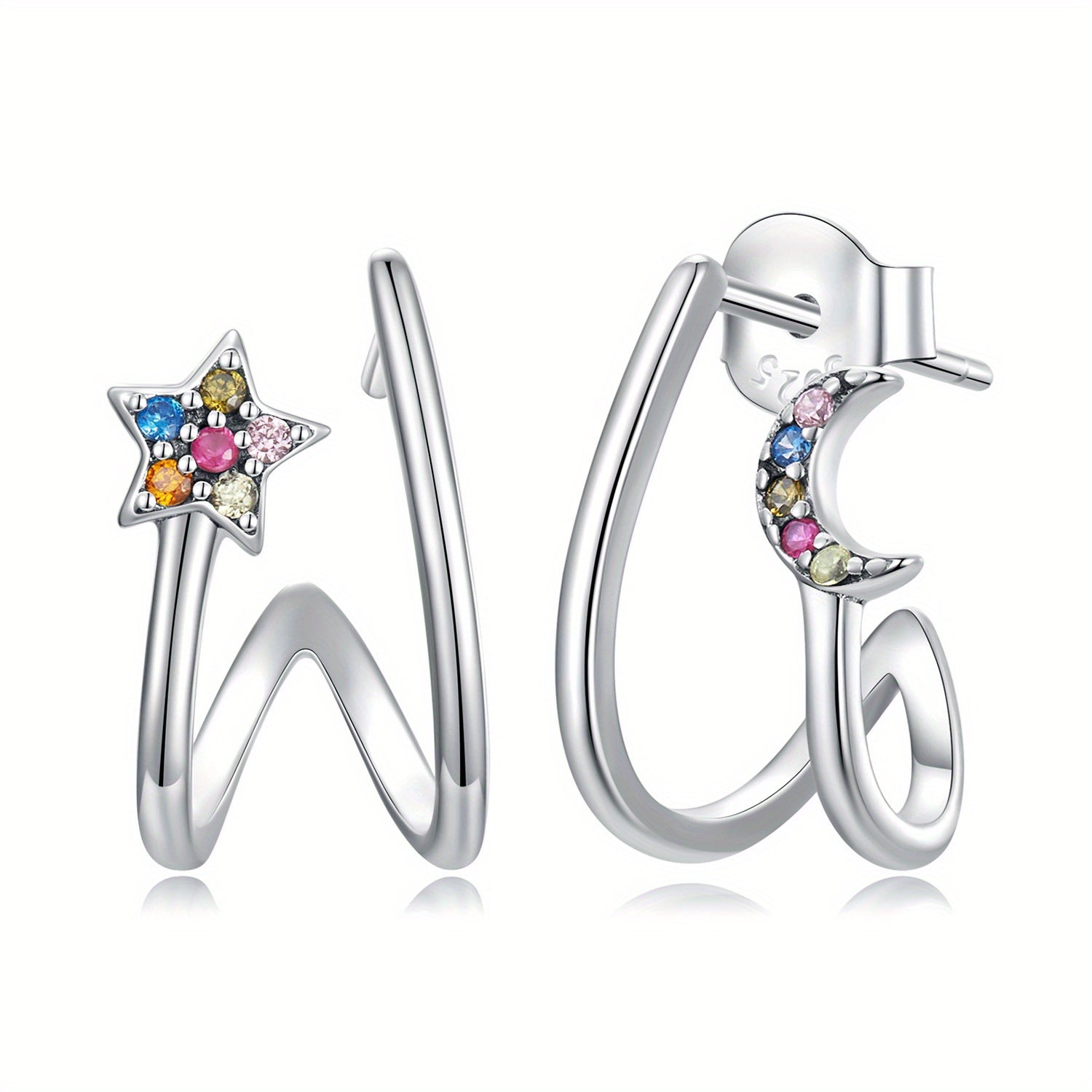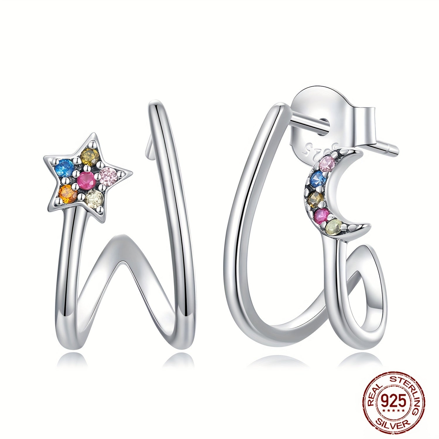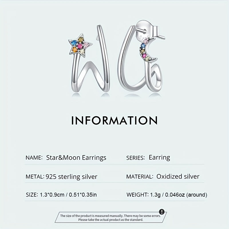 Elegant 925 sterling silver stud earrings with star and moon design, adorned with zircon for a touch of sparkle. Perfect accessory for daily wear or special occasions. Ideal gift for women who appreciate Japanese style and craftsmanship.