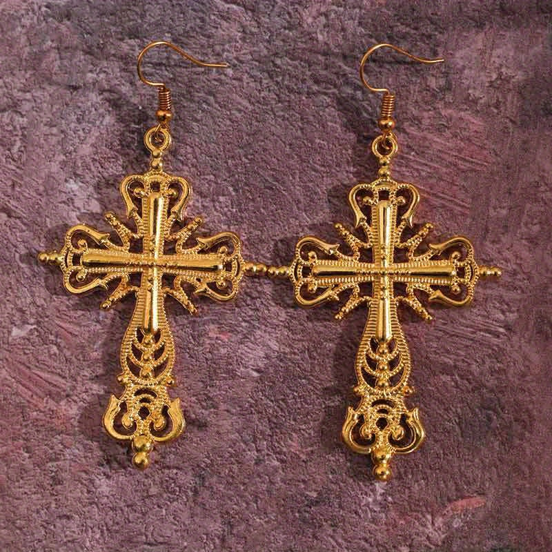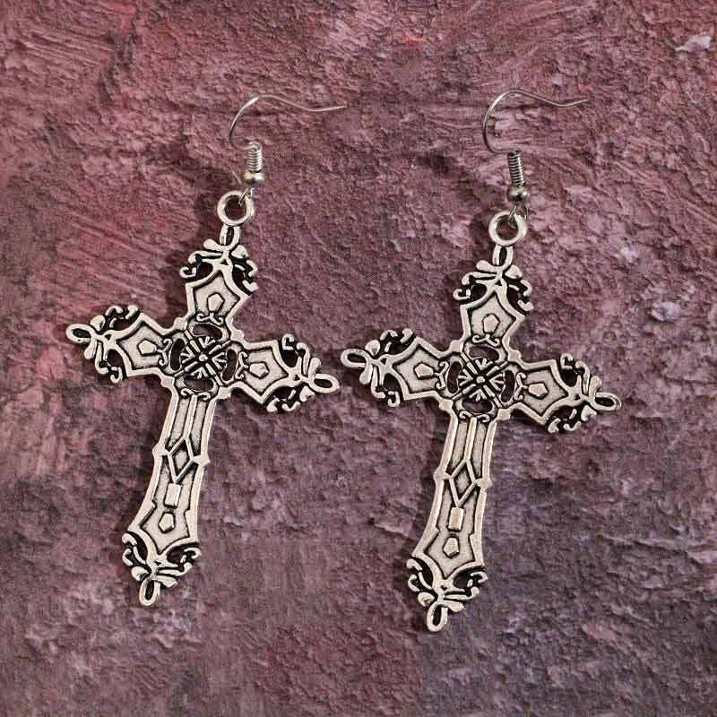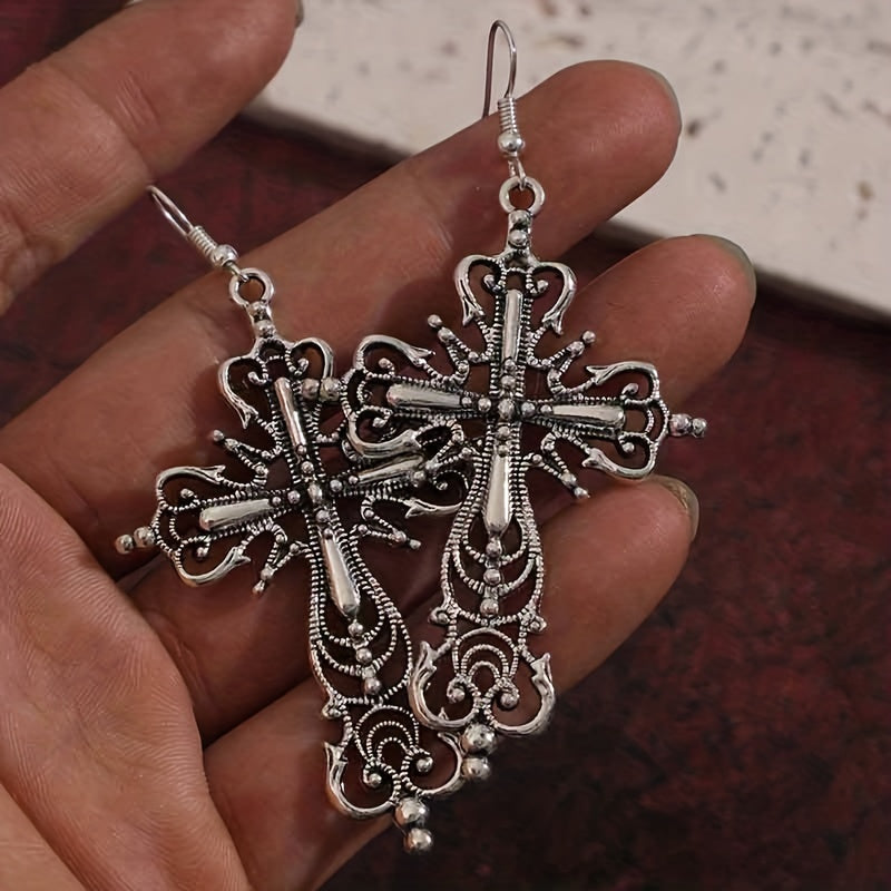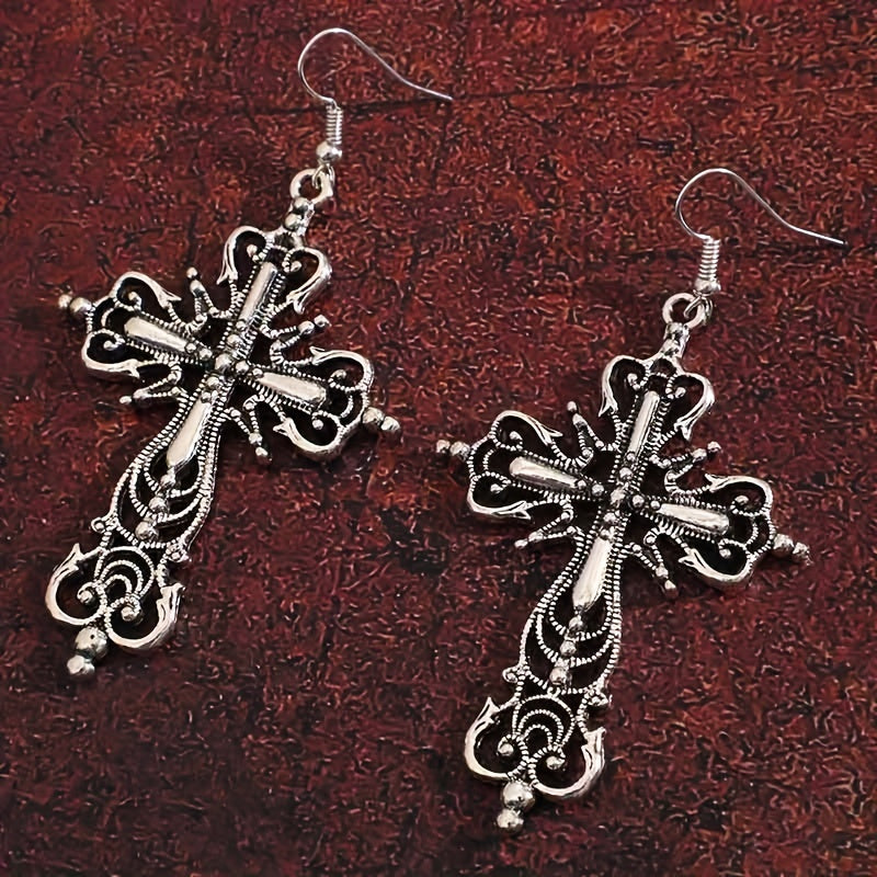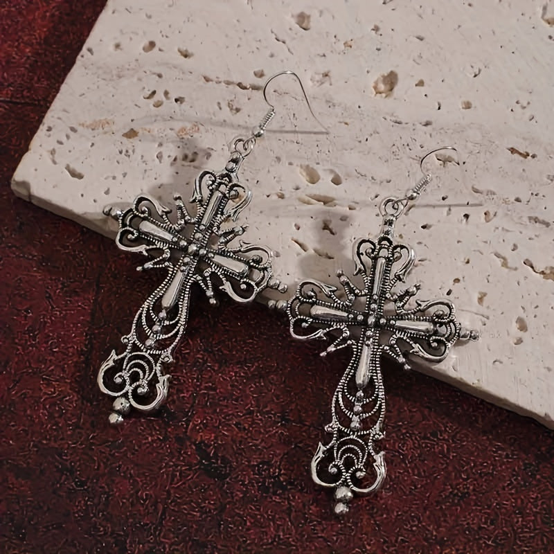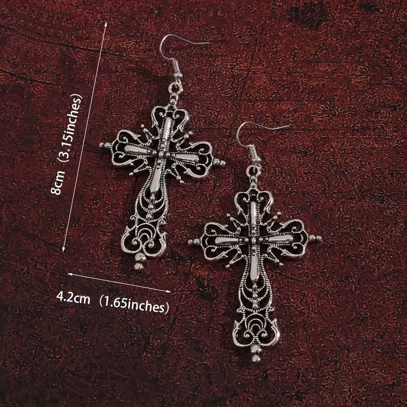 These stylish earrings feature a dark cross pendant design with a street style hollow pattern, suitable for both men and women.