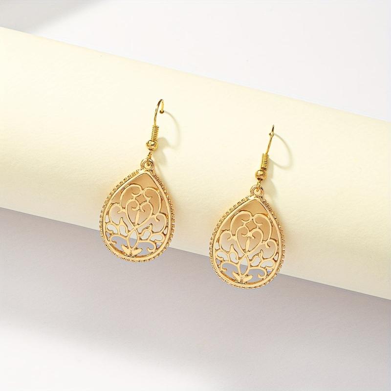 These delicate teardrop dangle earrings feature a hollow golden flower pattern. They are made of high-quality alloy with 14K gold plating, making them an elegant and stylish accessory. Perfect as a gift for a special woman.
