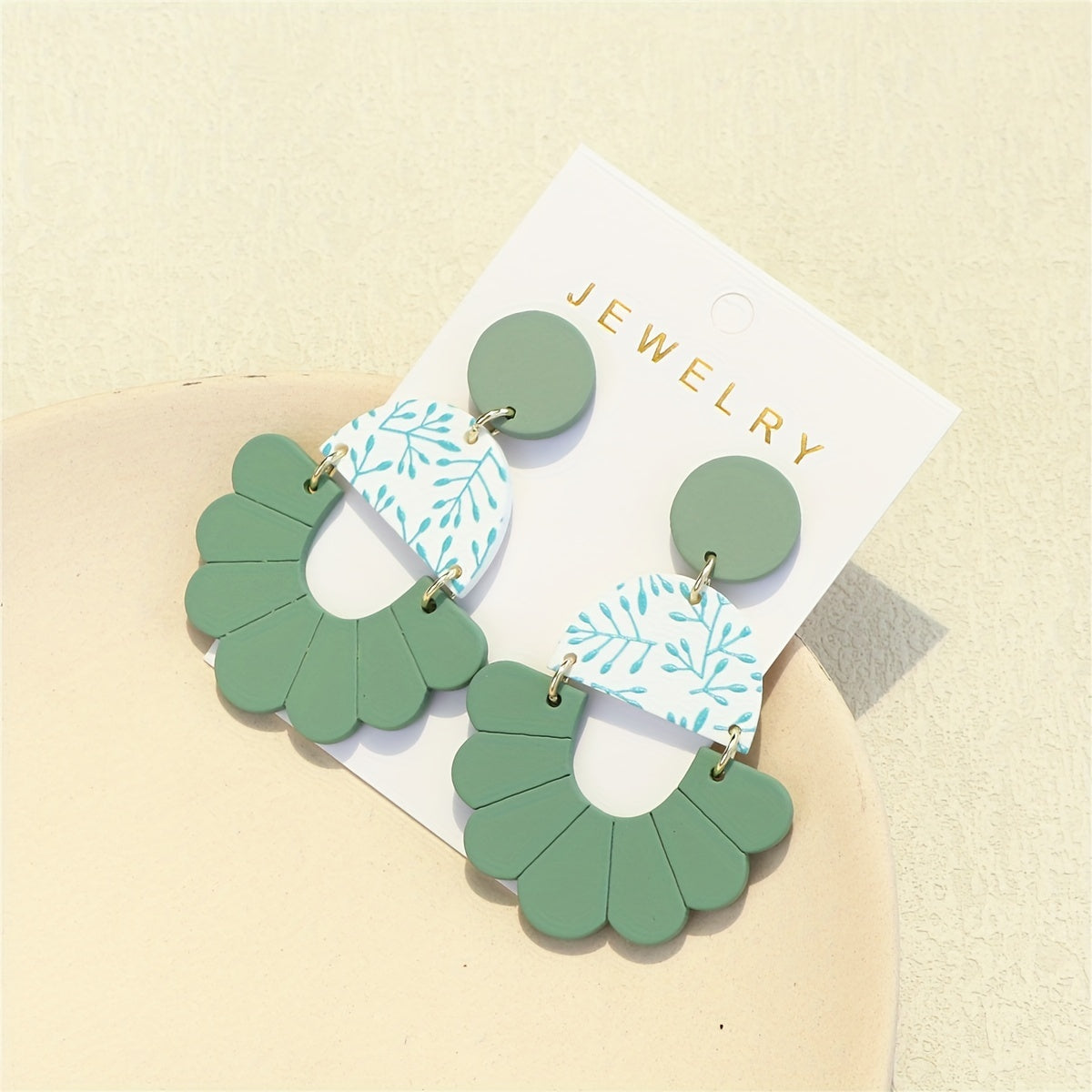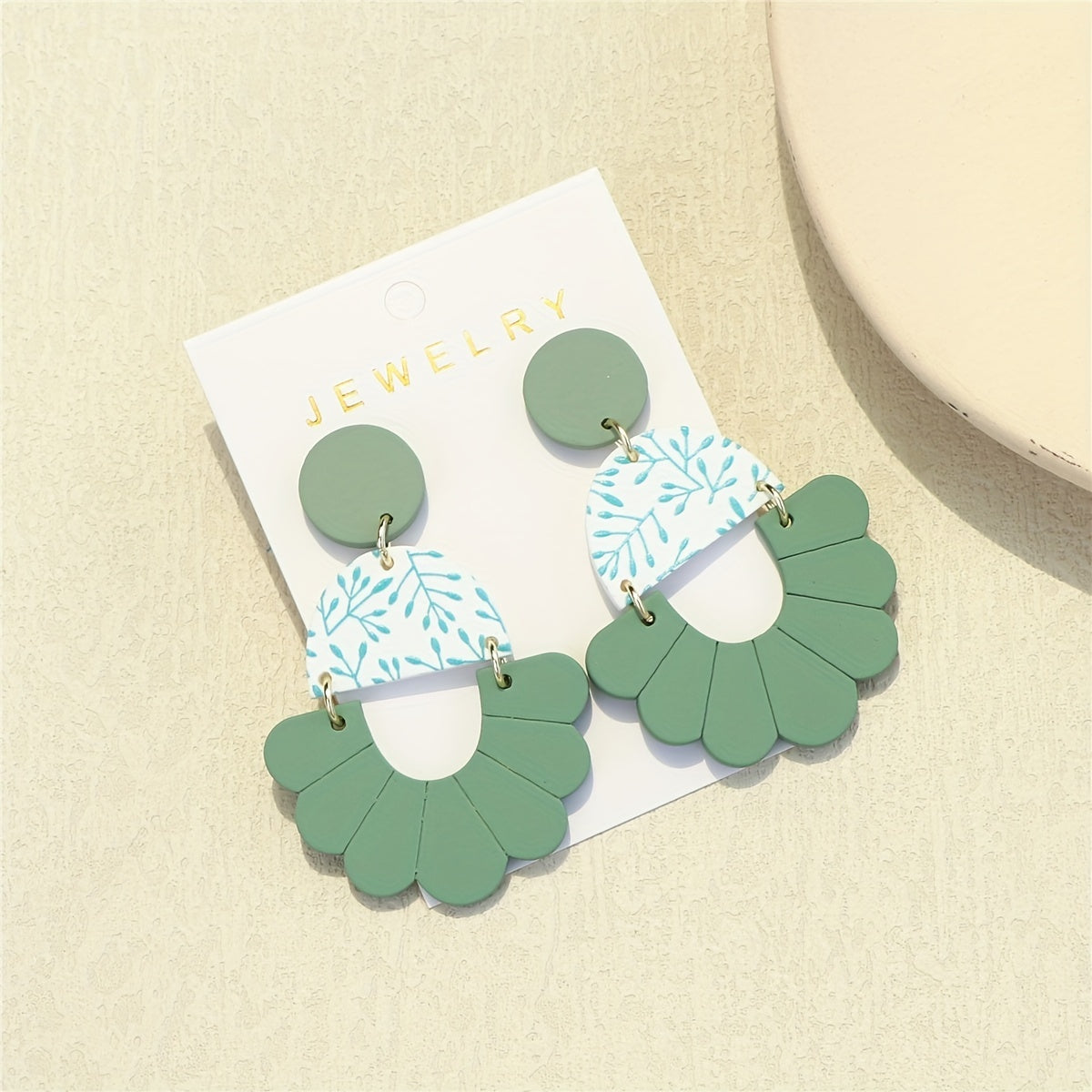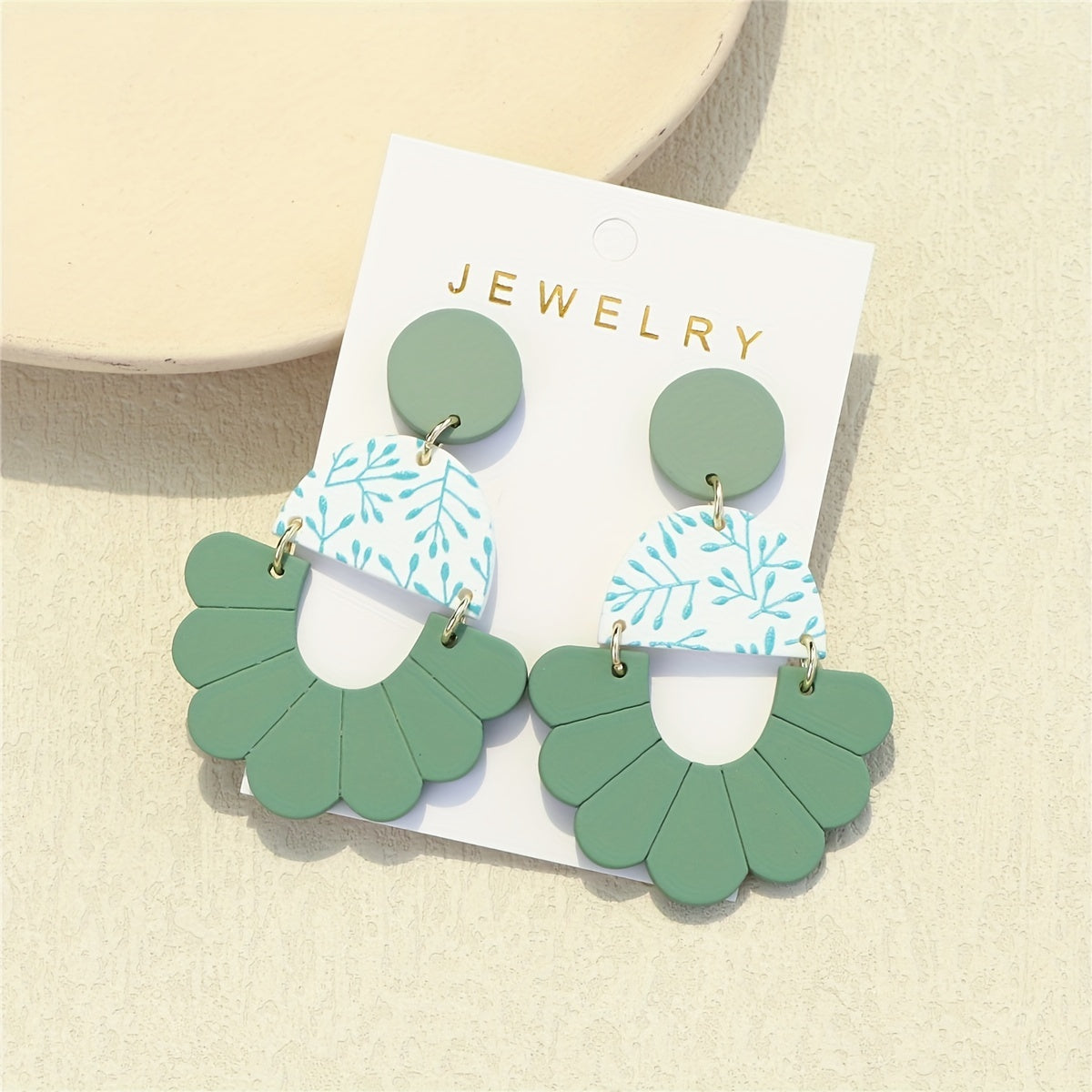 Green Flower Twig Dangle Earrings Polymer Clay Texture Style Female Gift