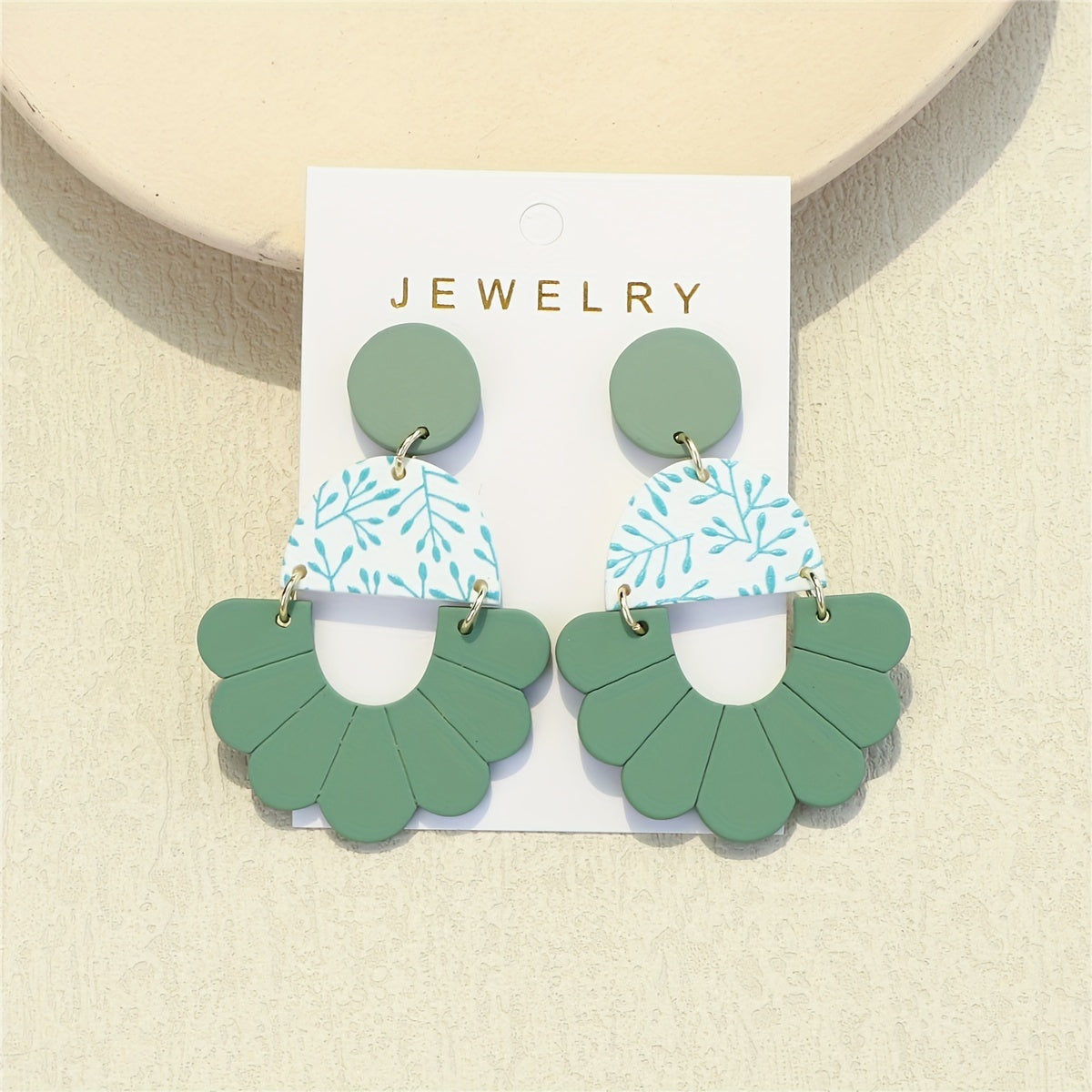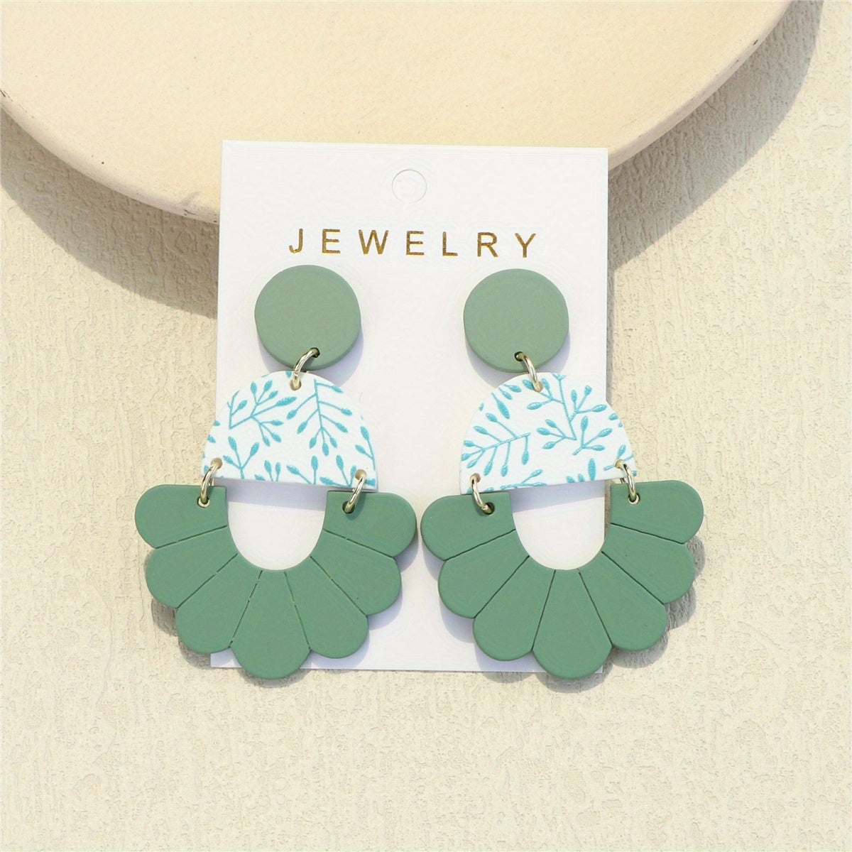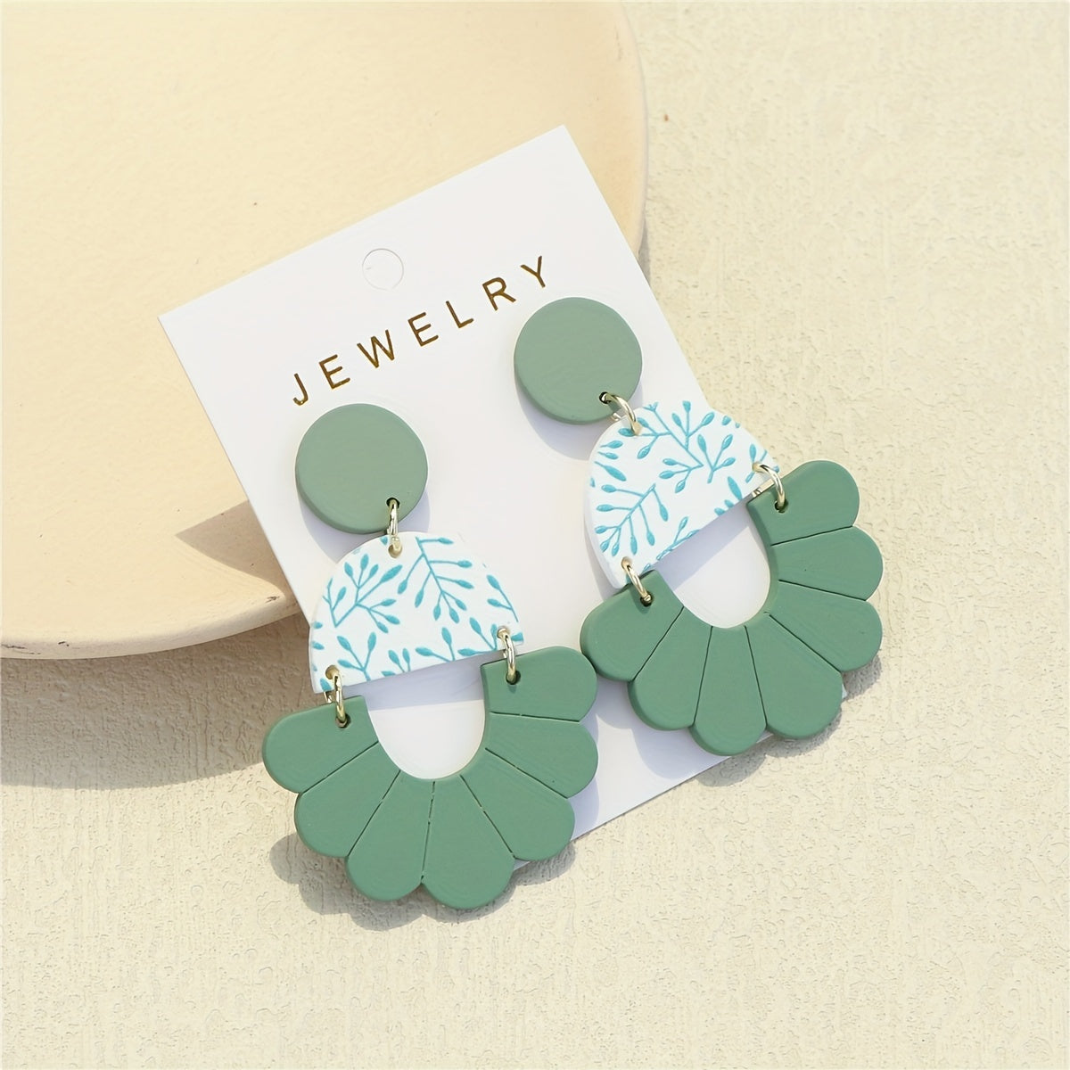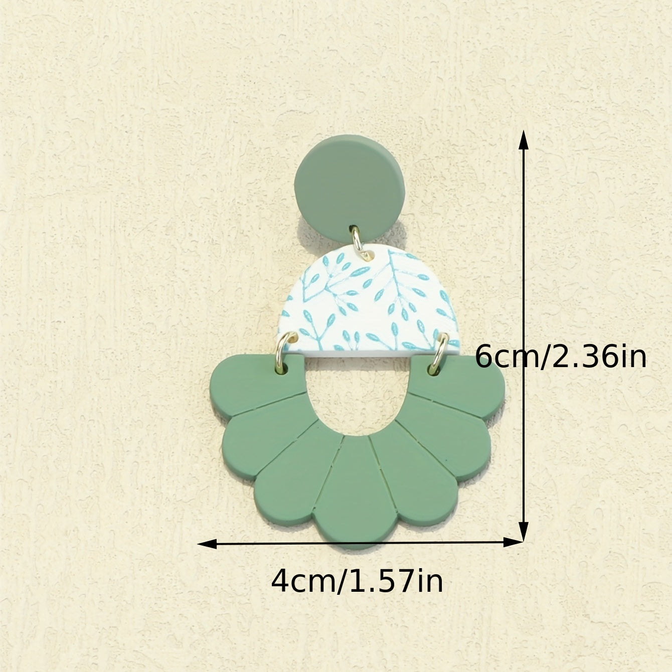 Green Flower Twig Dangle Earrings Polymer Clay Texture Style Female Gift