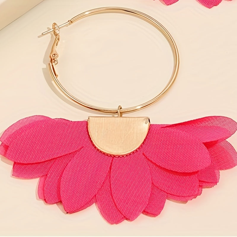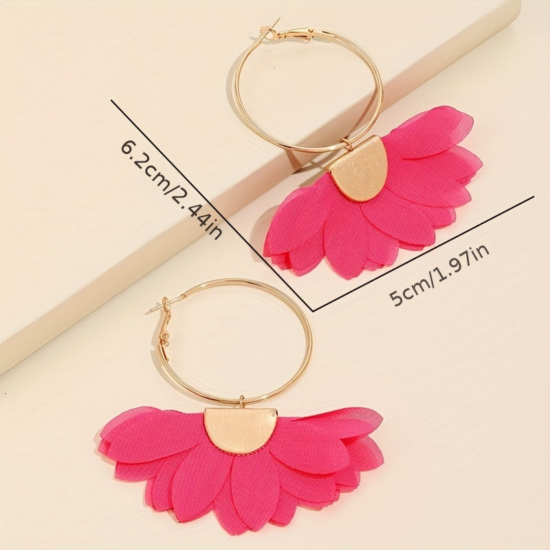 Add a touch of fun and vibrancy to your outfit with these hot pink hoop earrings featuring flower petal decoration. Perfect for vocation style and stage performances.