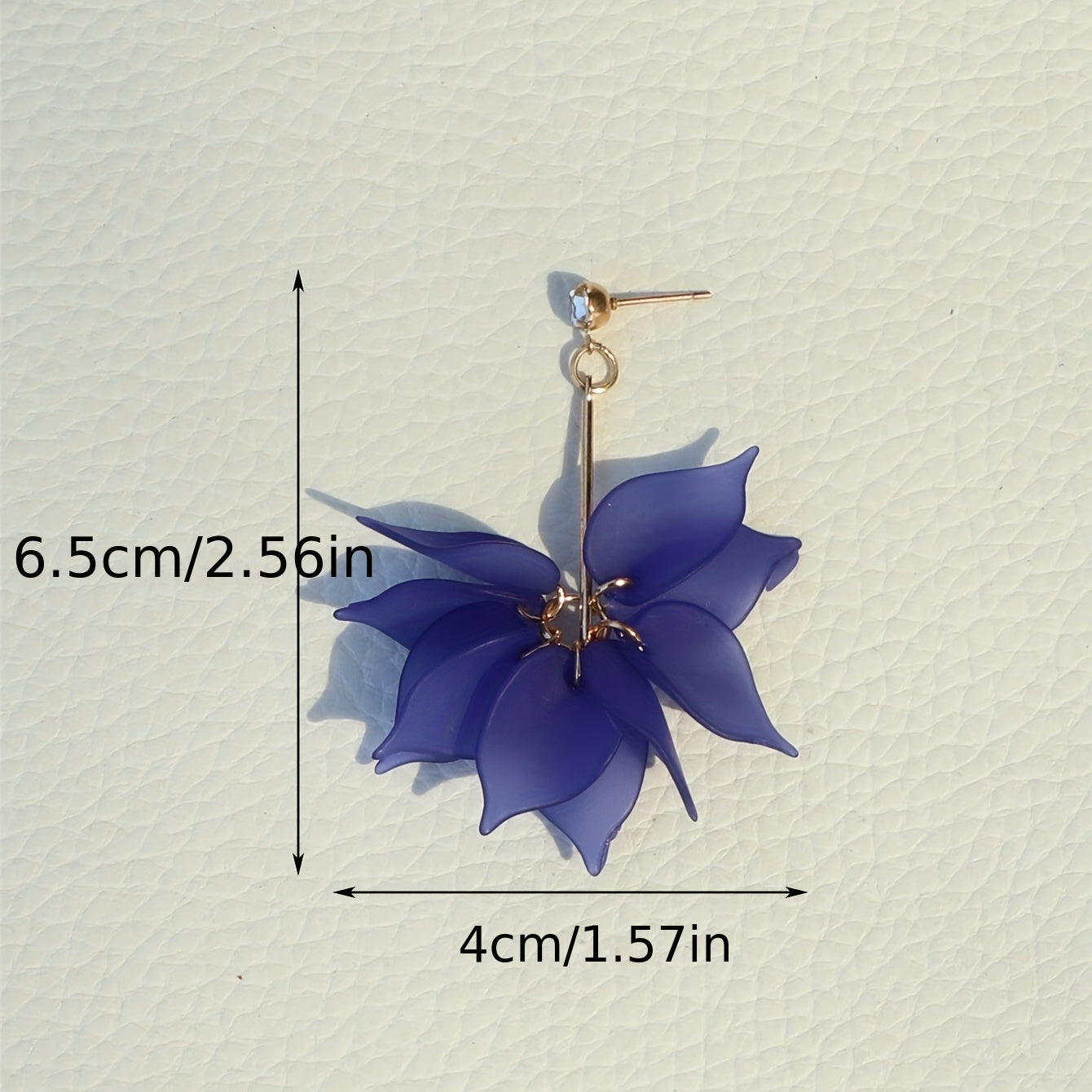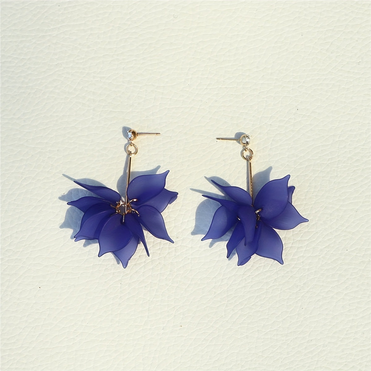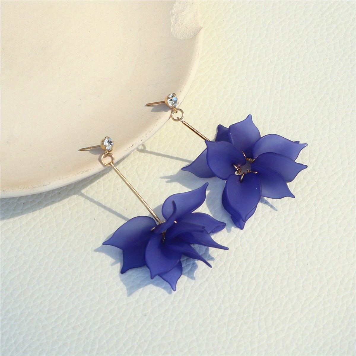 Add a touch of retro bohemian style to your look with these navy plastic flower petal dangle earrings. Perfect for wearing on vacation or any casual outing.
