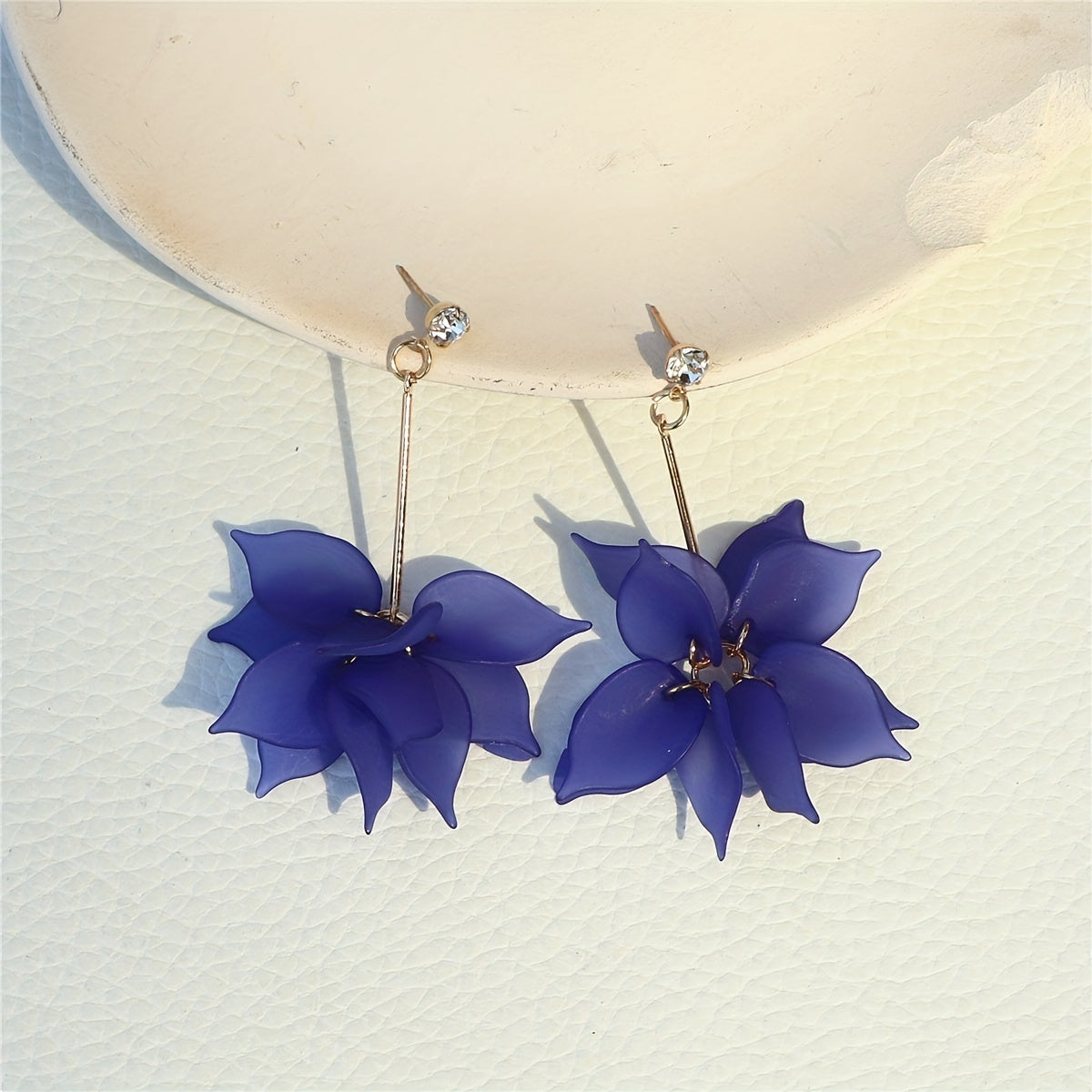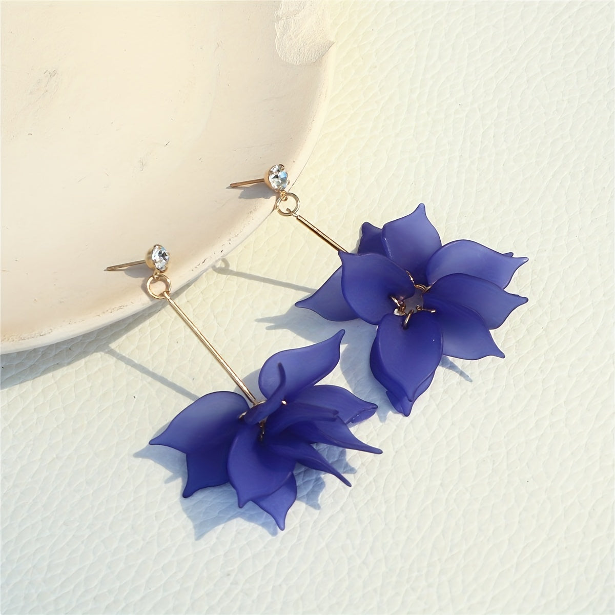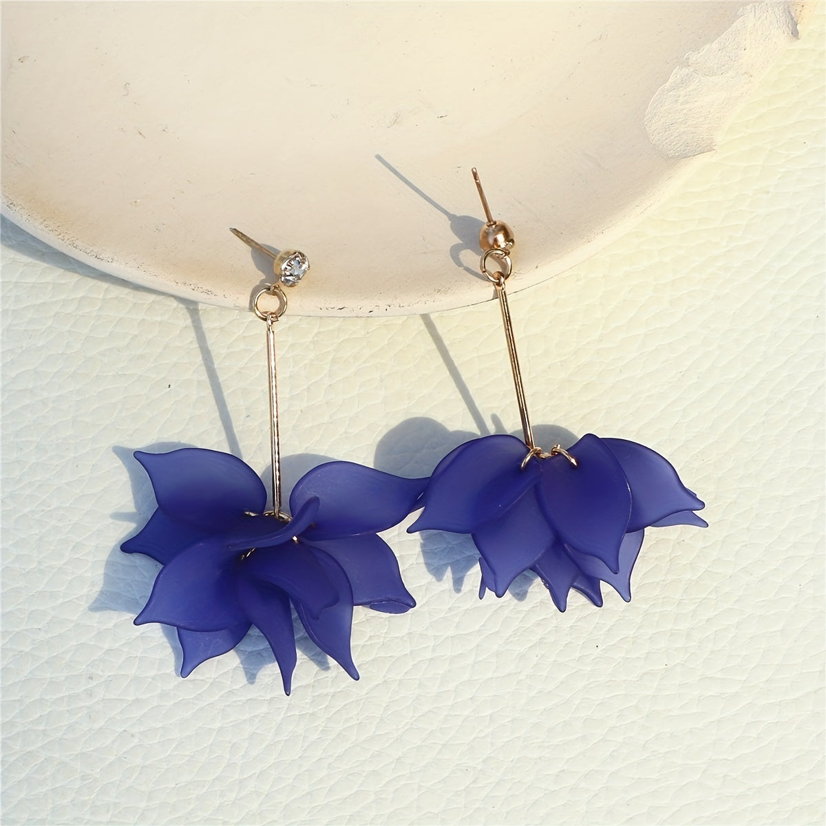 Add a touch of retro bohemian style to your look with these navy plastic flower petal dangle earrings. Perfect for wearing on vacation or any casual outing.