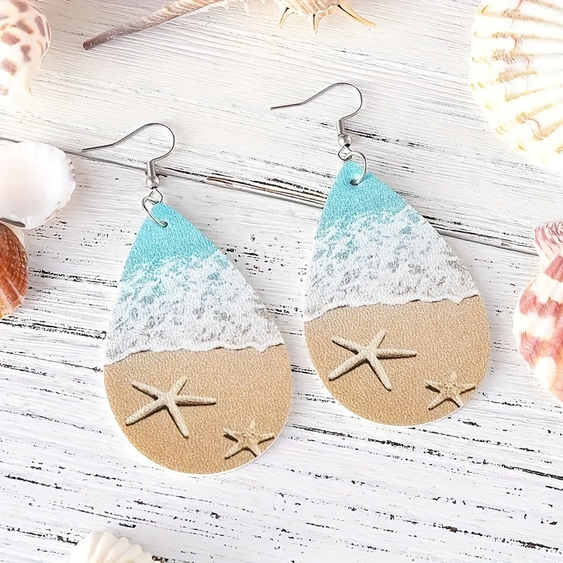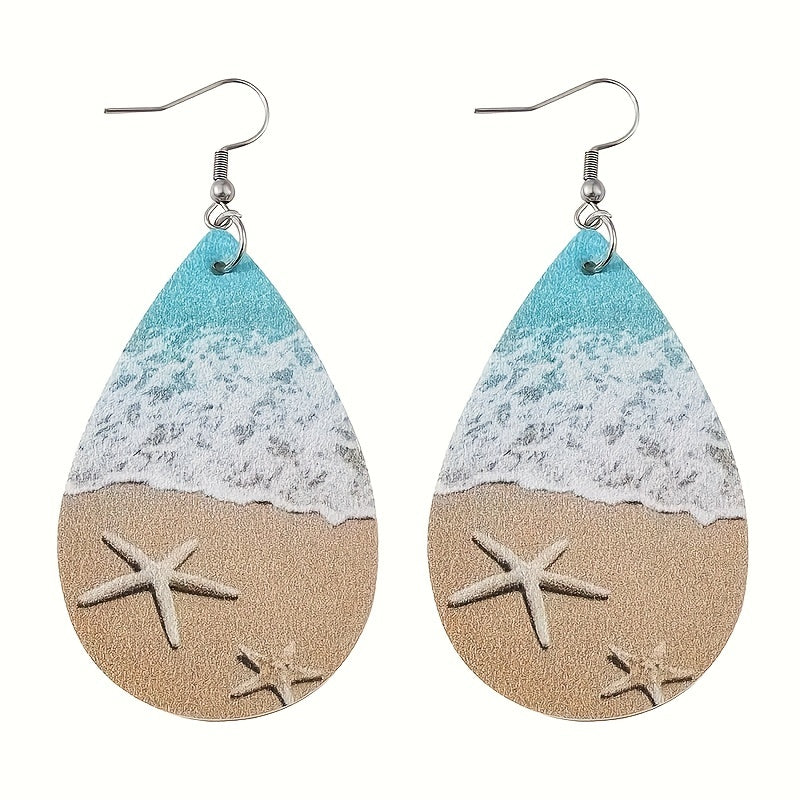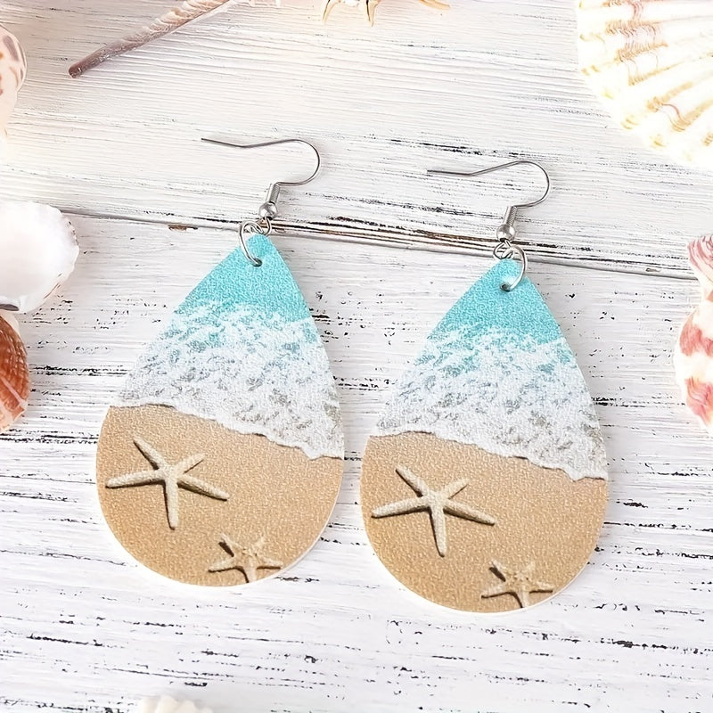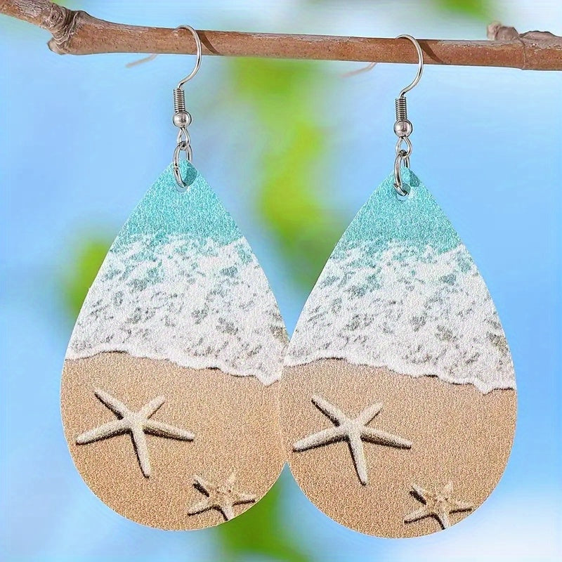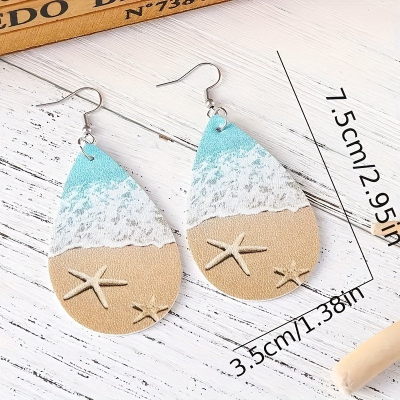 Enjoy a beach-inspired look with these ocean-themed earrings featuring starfish and waves. Made from PU material and double-sided design.