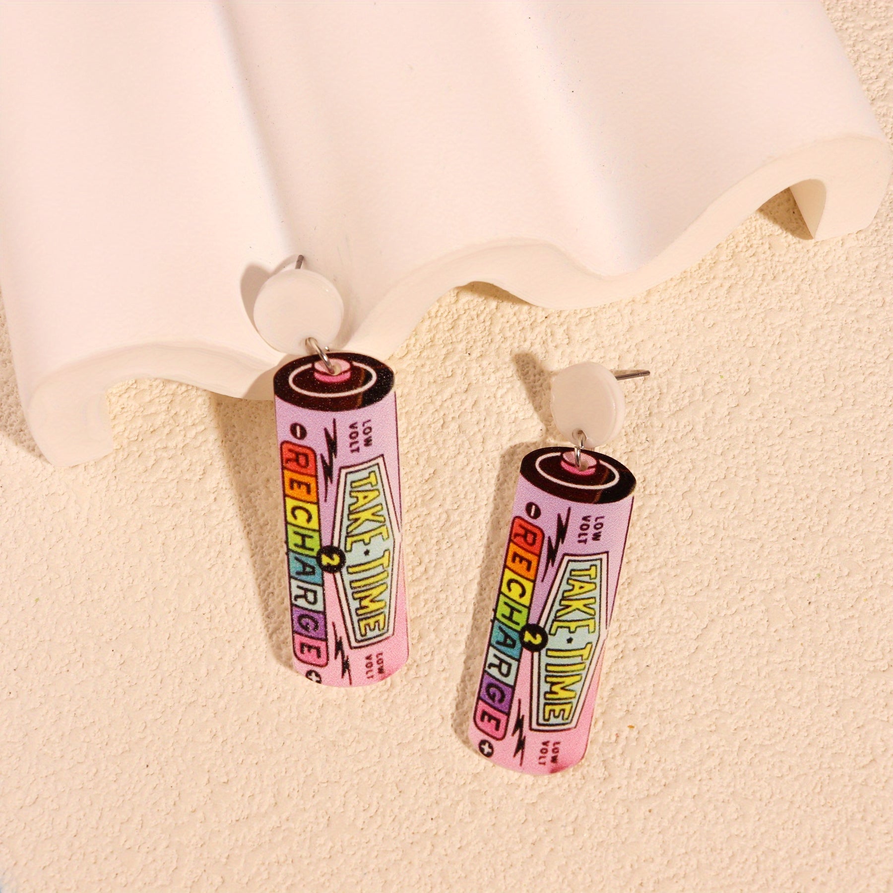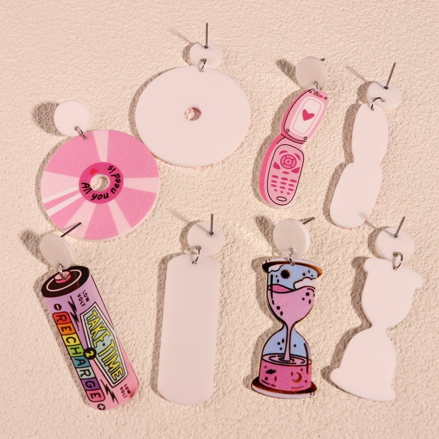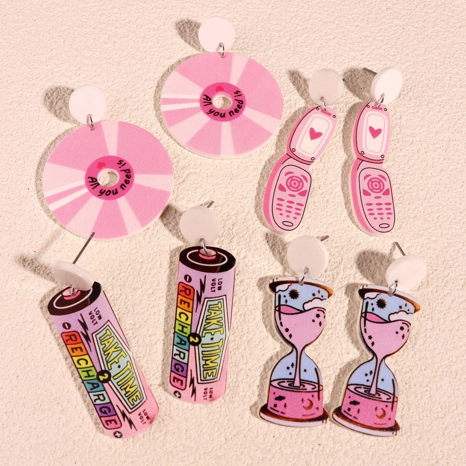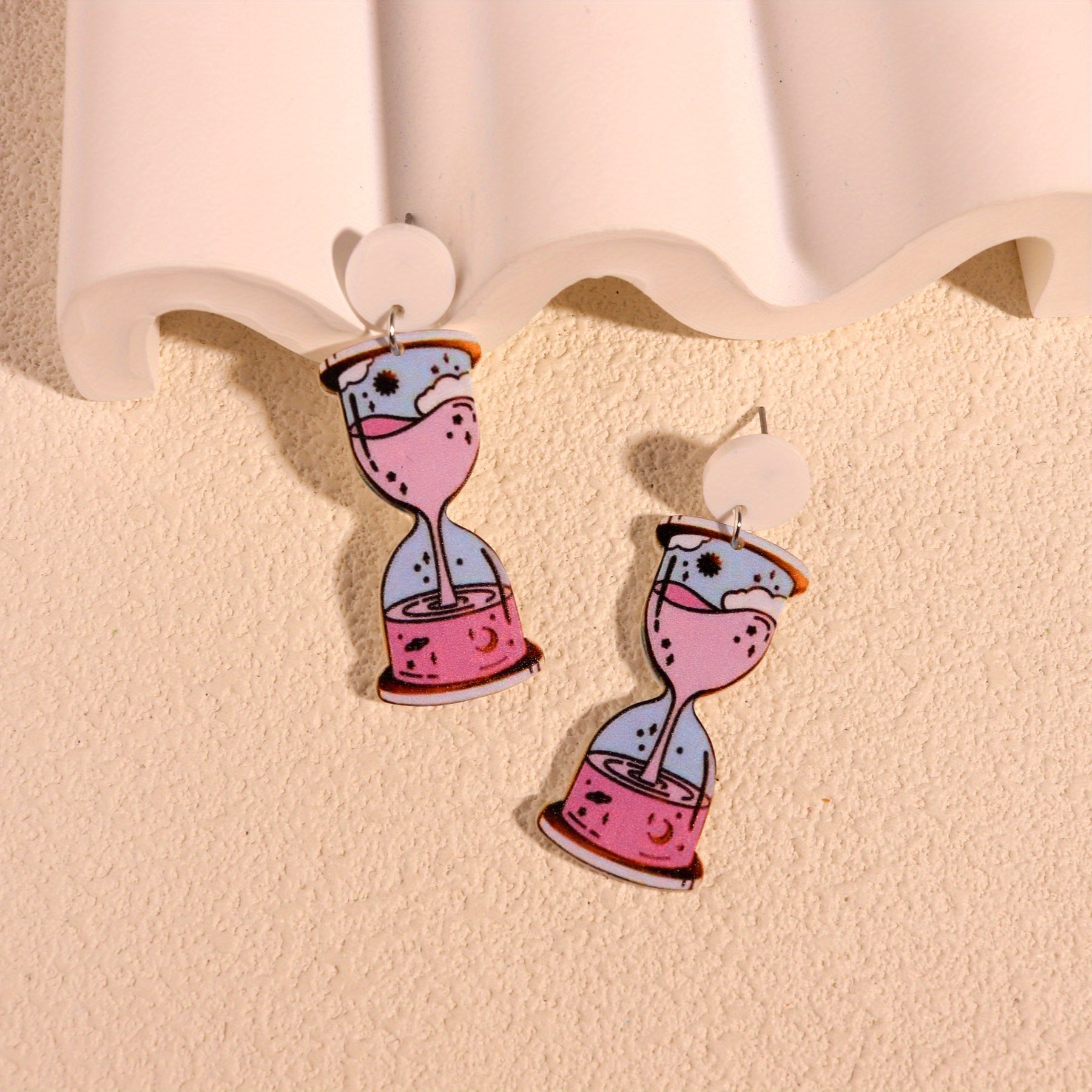 These dangle earrings feature a fun Y2K style design with graffiti cartoons and hourglass charms.