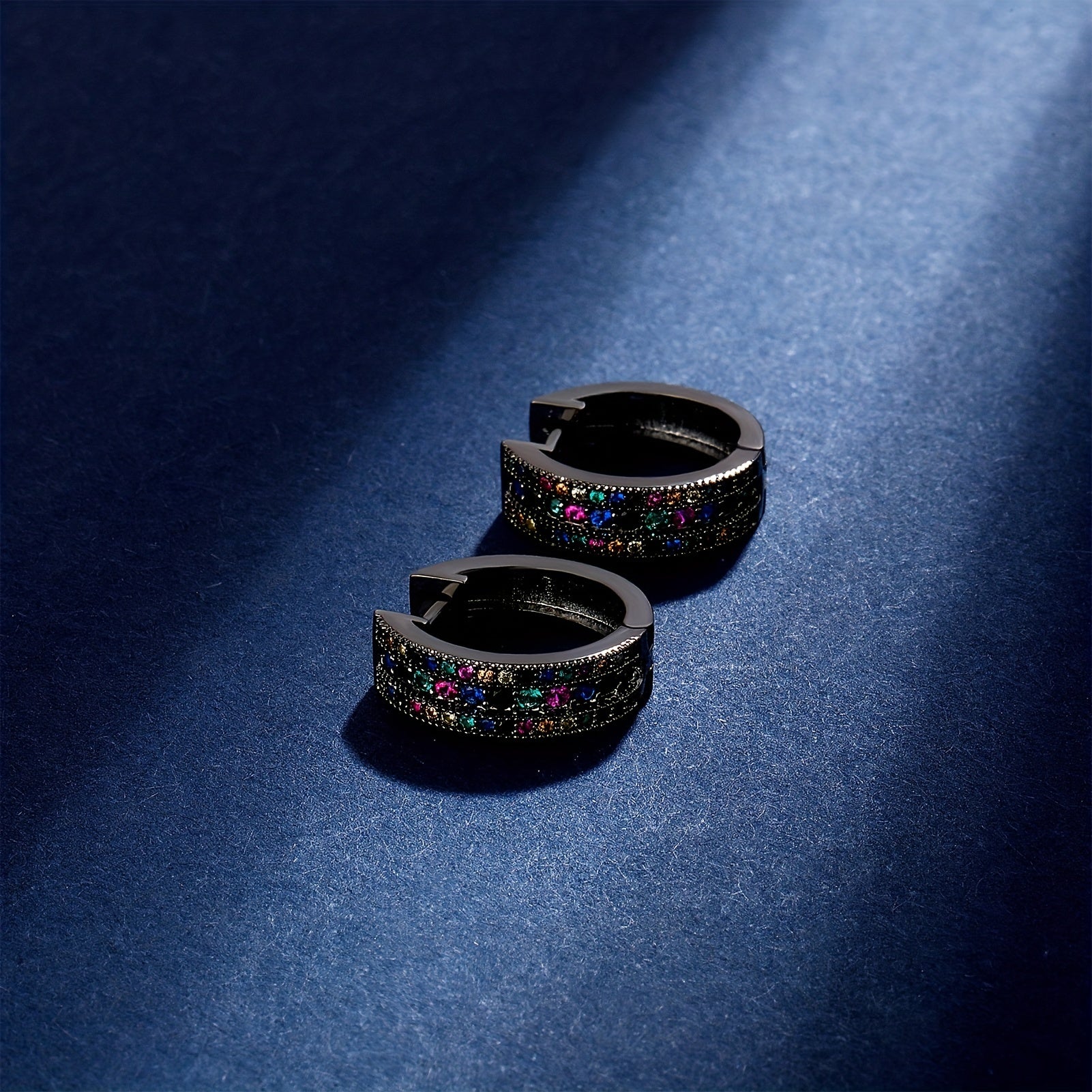 These hoop earrings feature a vibrant rainbow cubic zirconia design in a hollow out style. Perfect for adding a pop of color to any outfit. Ideal for men who love hip hop fashion.