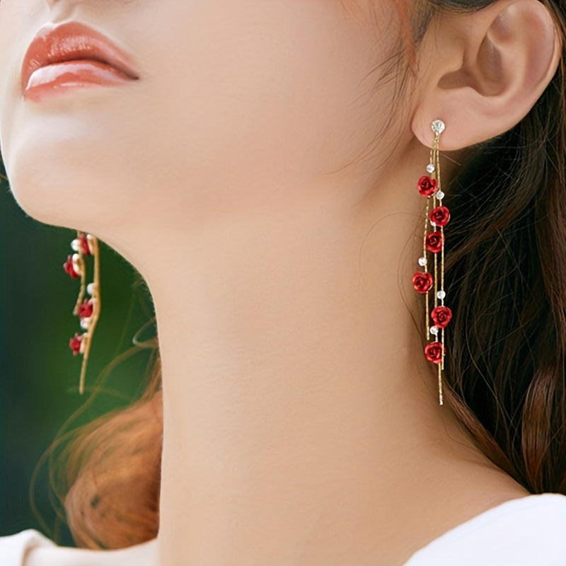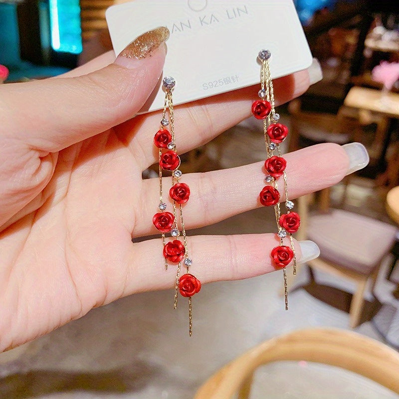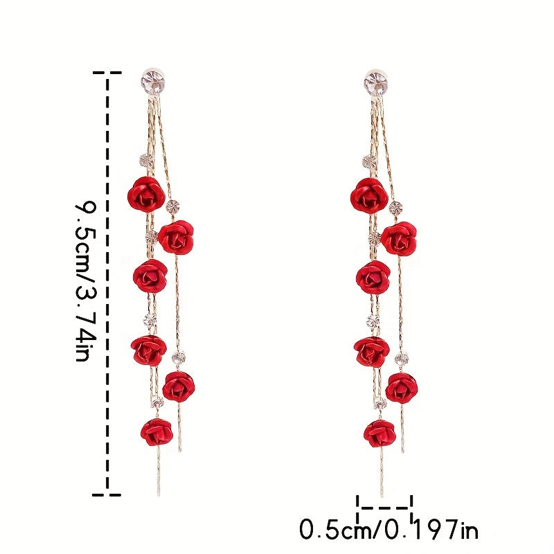 Add a touch of elegance with these red and purple rose flower tassel earrings featuring zircon accents. Perfect for weddings, banquets, and special occasions.