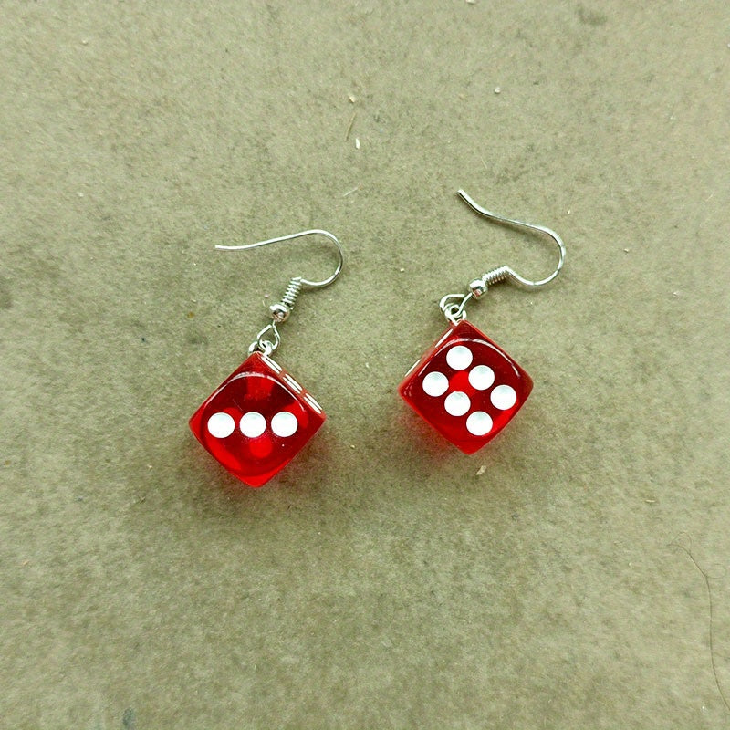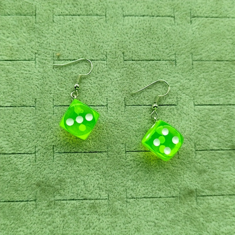 These unique earrings feature dice-shaped pendants made of resin in transparent and colored designs. Perfect for adding a fun and quirky touch to any outfit.