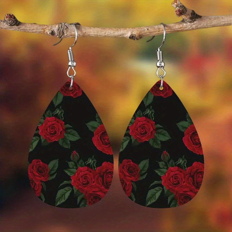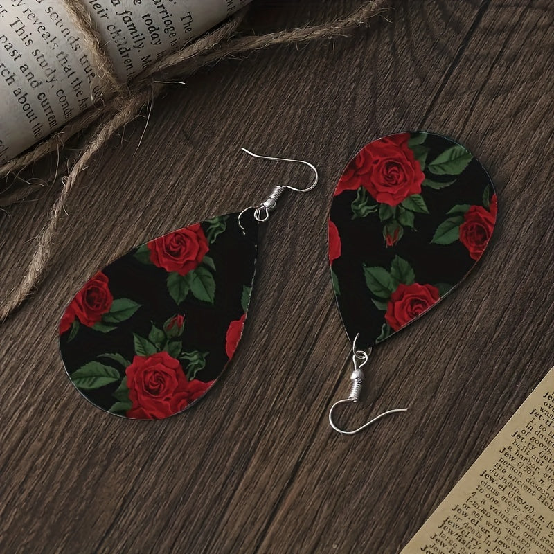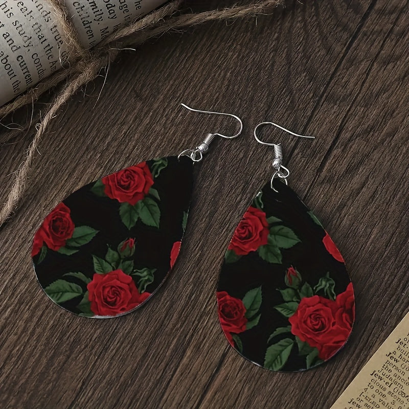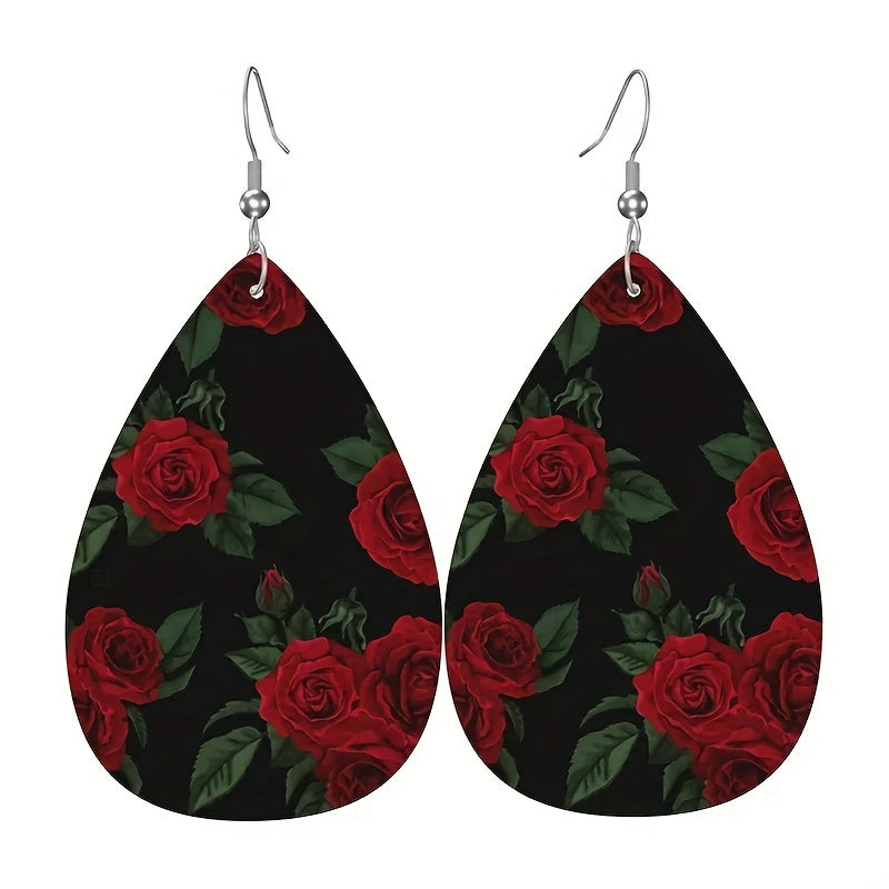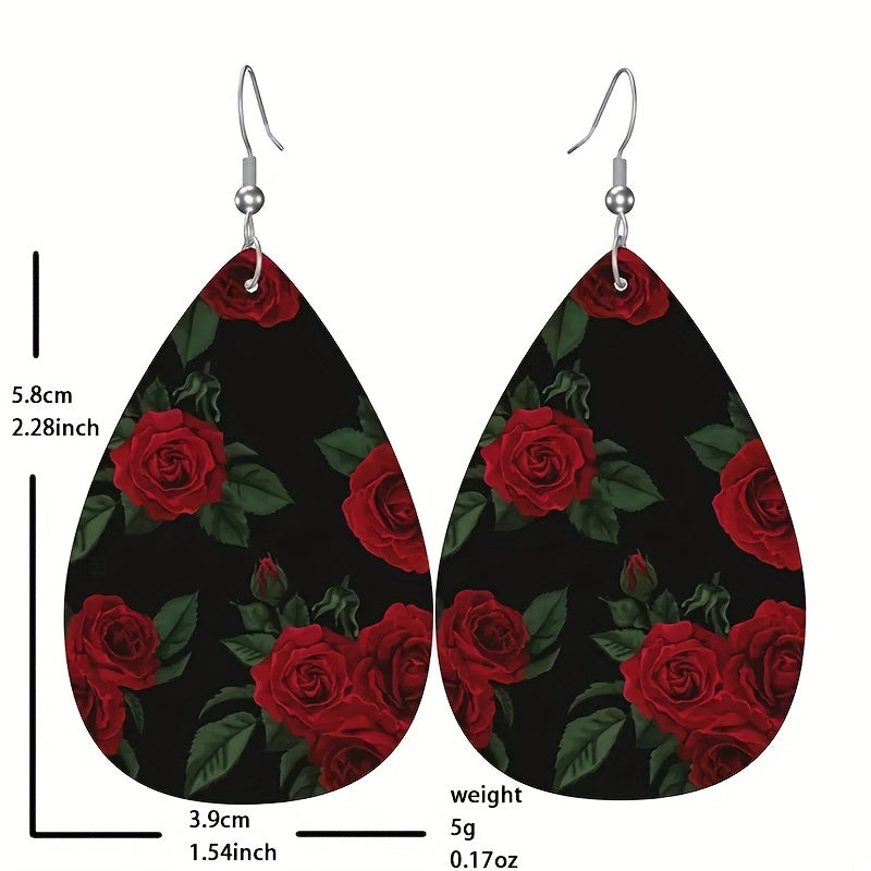 Add a touch of style and sophistication to your outfit with these stunning faux leather teardrop earrings featuring a beautiful rose flower design. Perfect for parties and special occasions.
