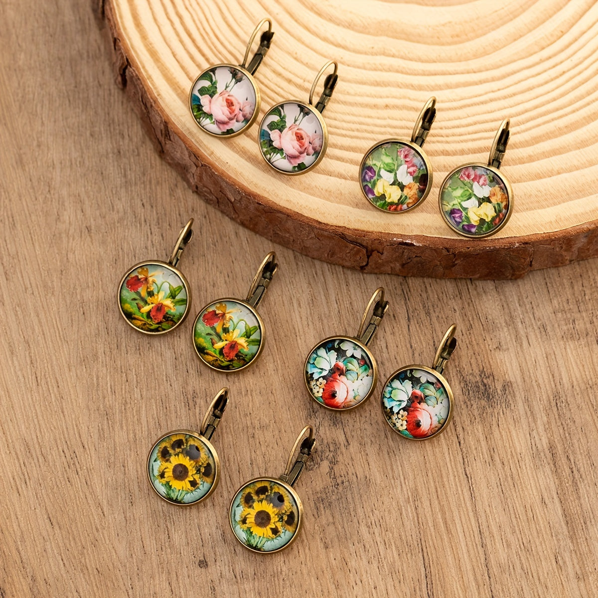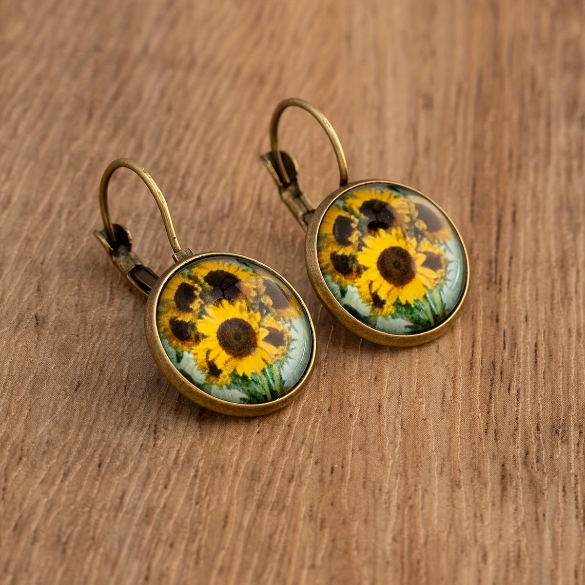 Rose Sunflower Print Round Earrings Copper Jewelry Female Gift