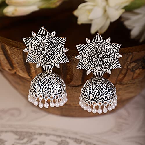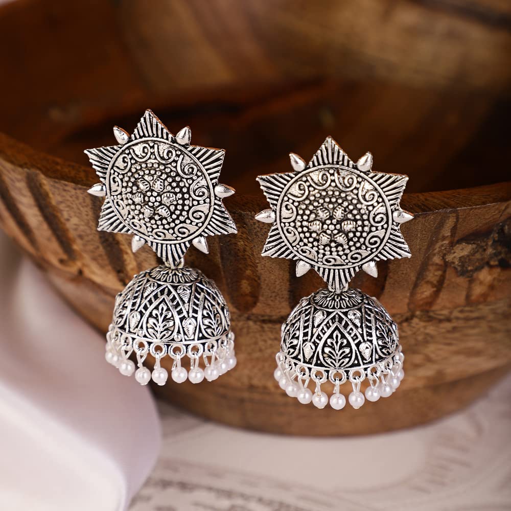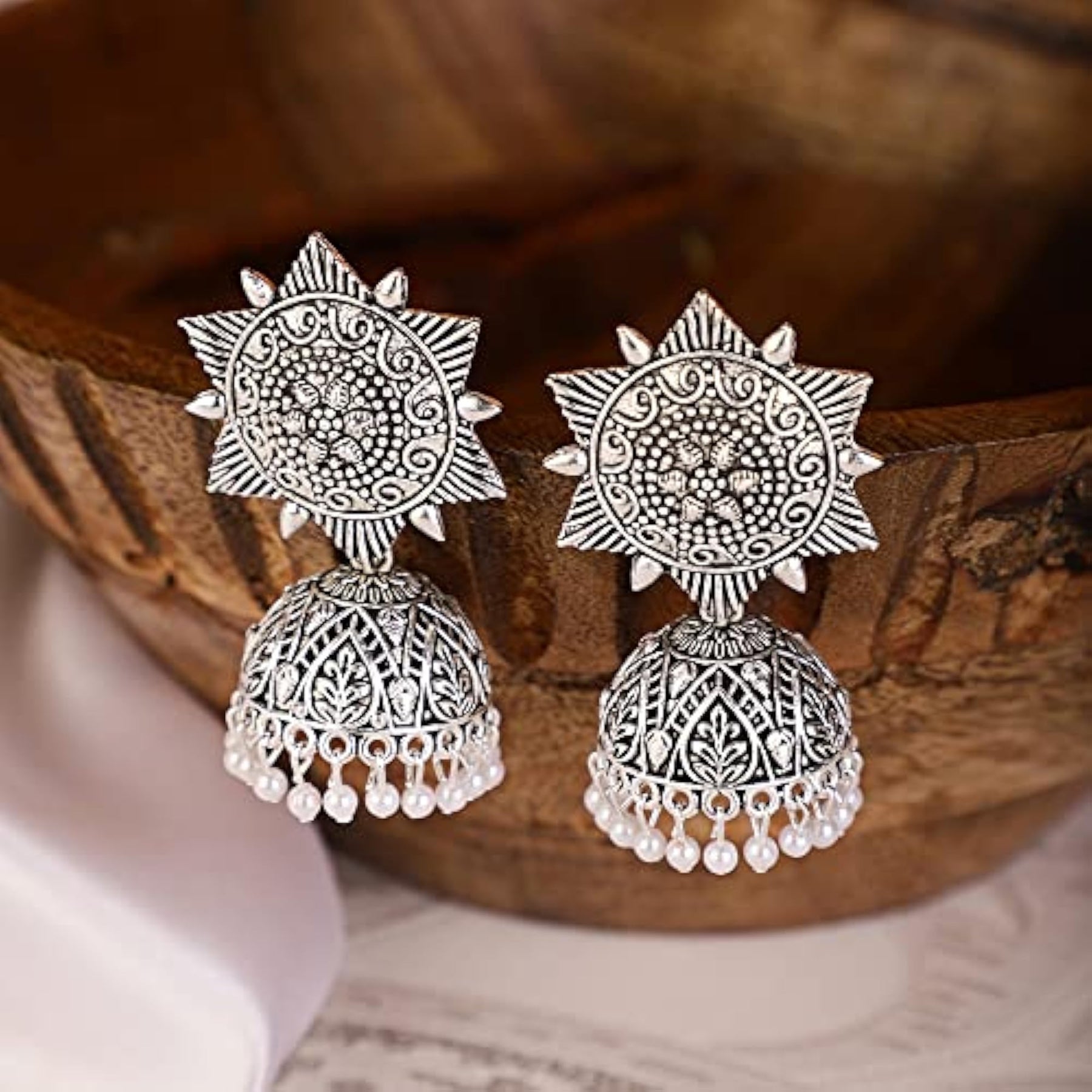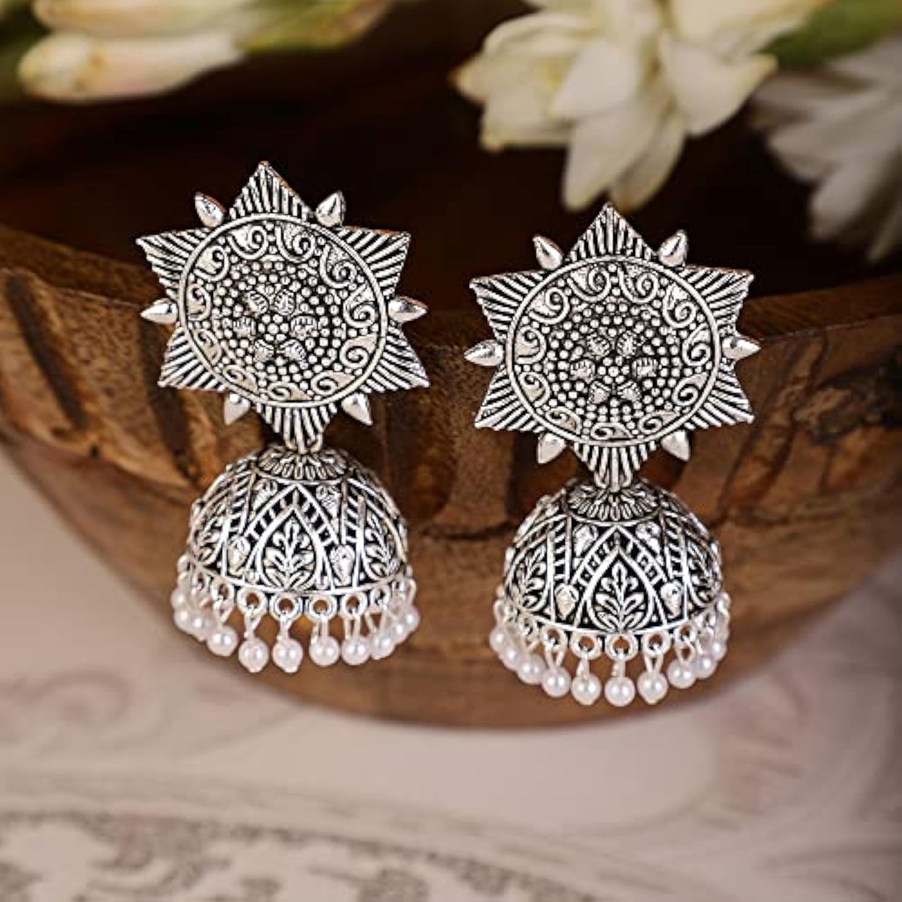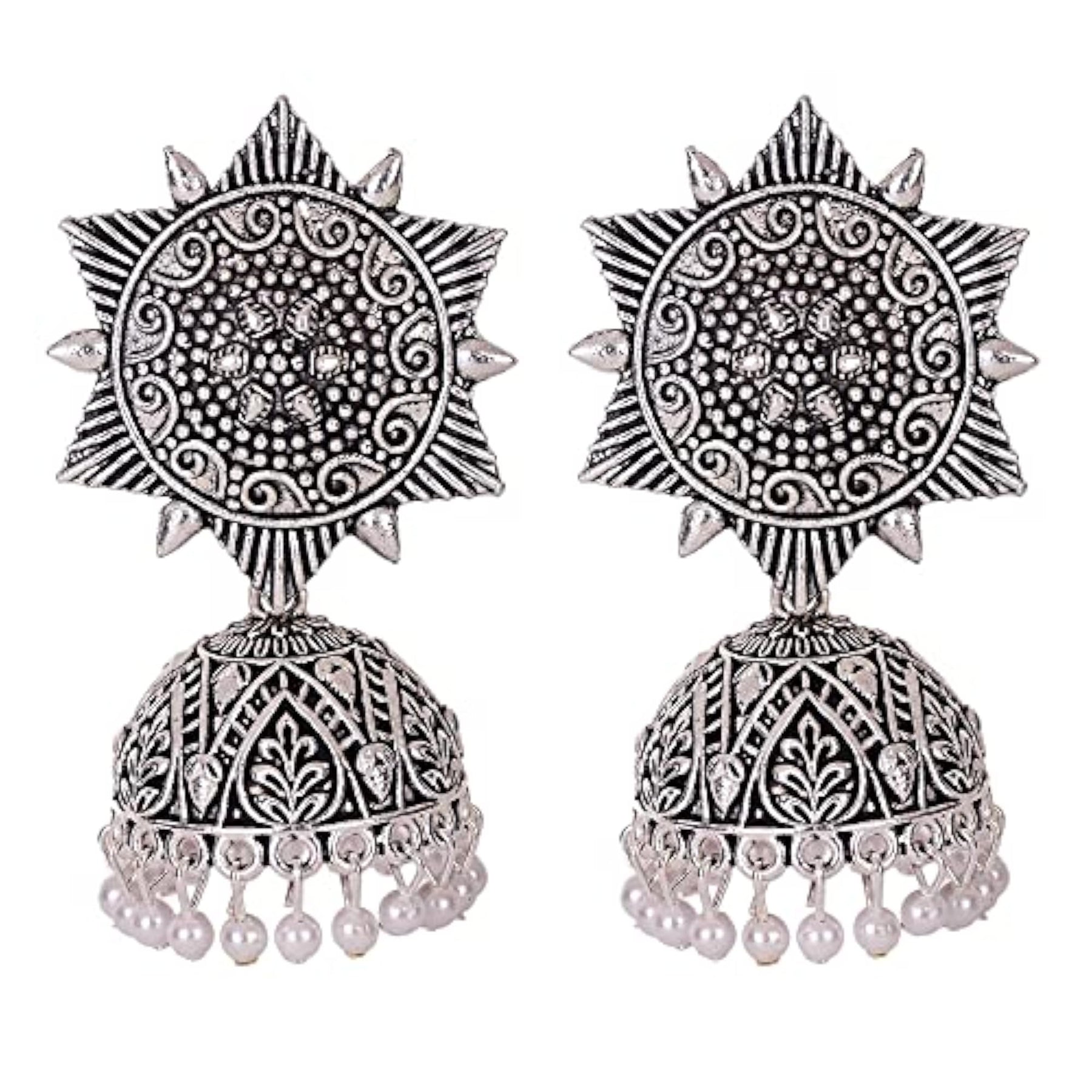 Elevate your ethnic look with these stylish jhumki earrings. Featuring a traditional antique plating, these earrings add a touch of elegance to any outfit.