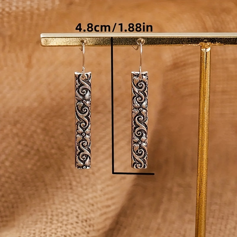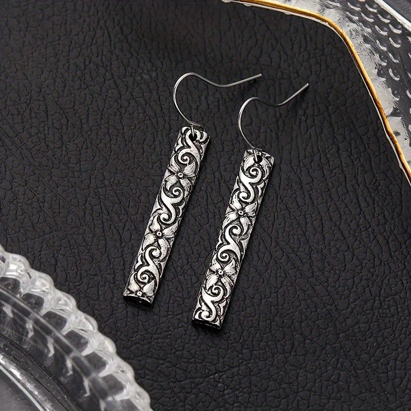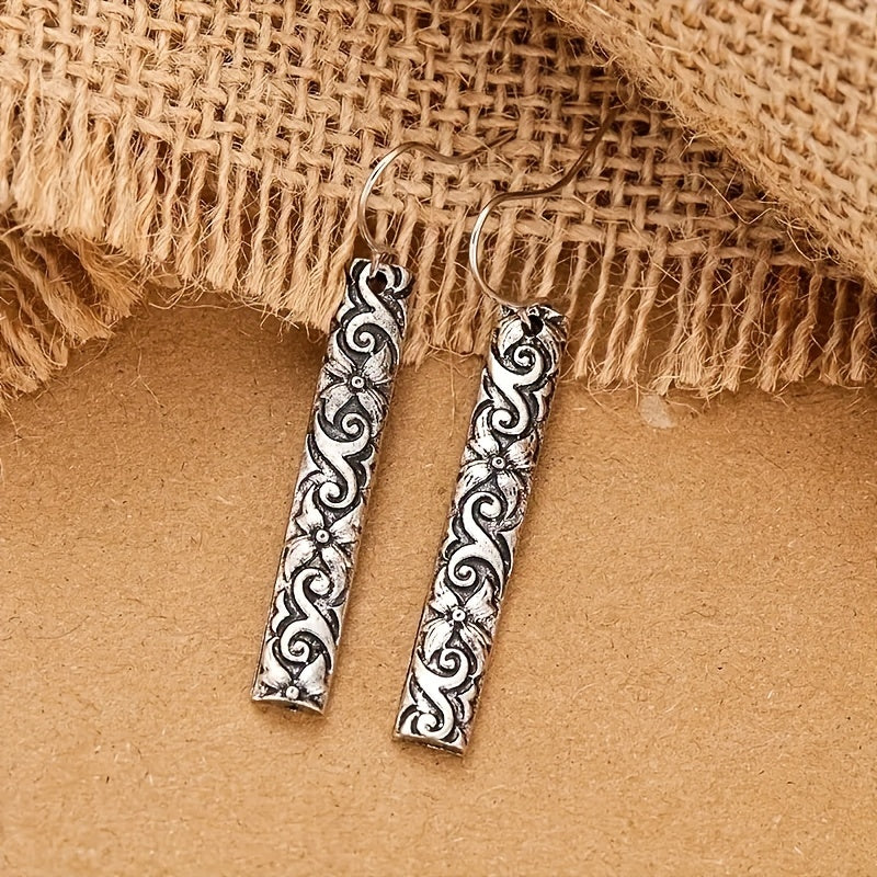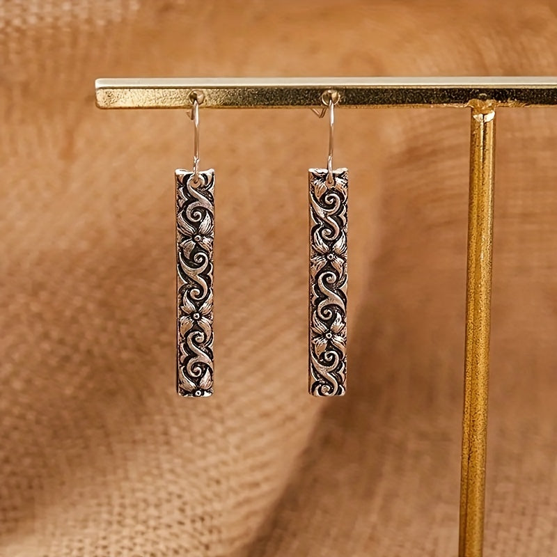 These elegant dangle earrings feature a vintage geometric design with intricate carvings. Perfect for weddings, engagements, or anniversaries.