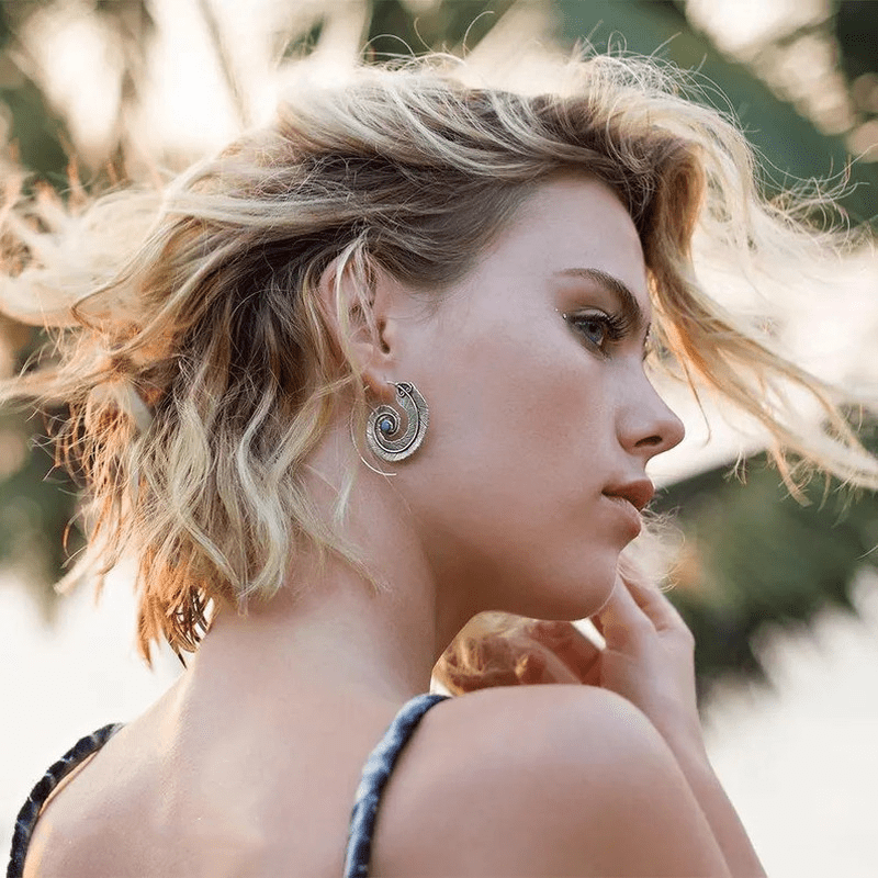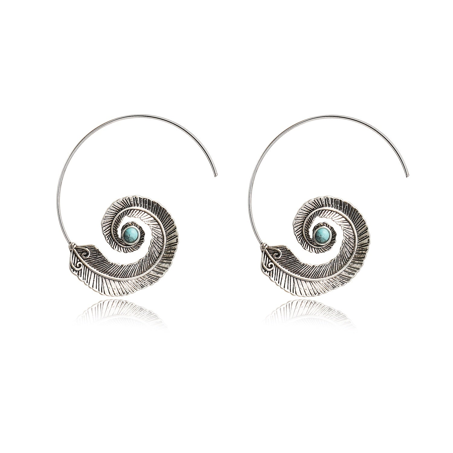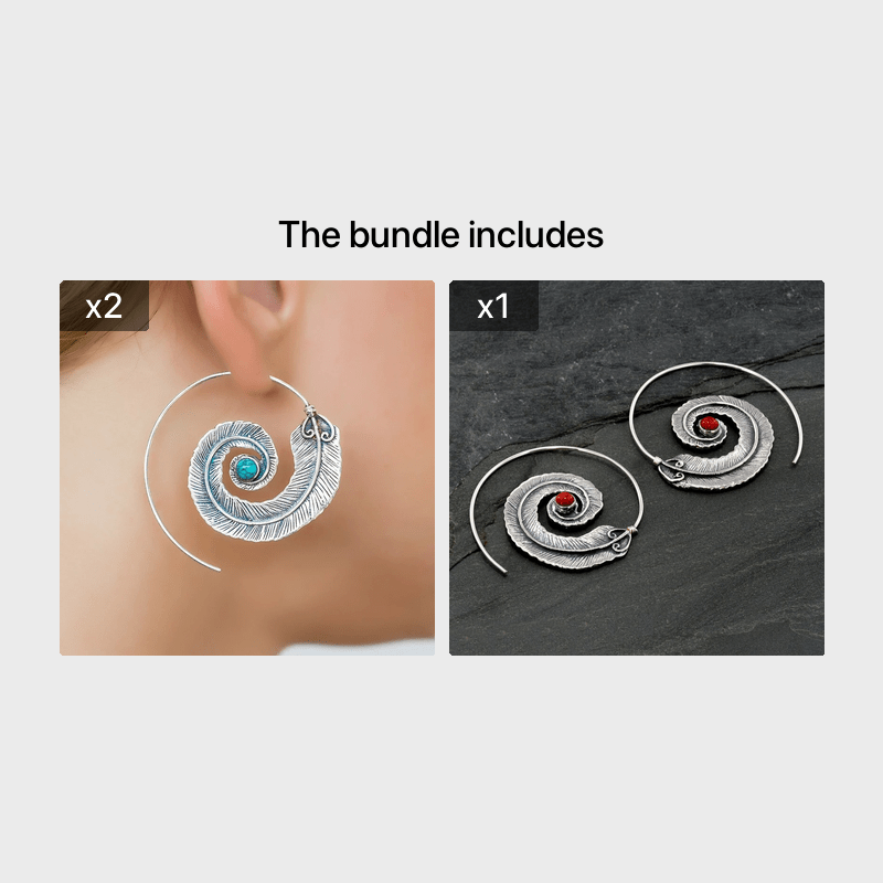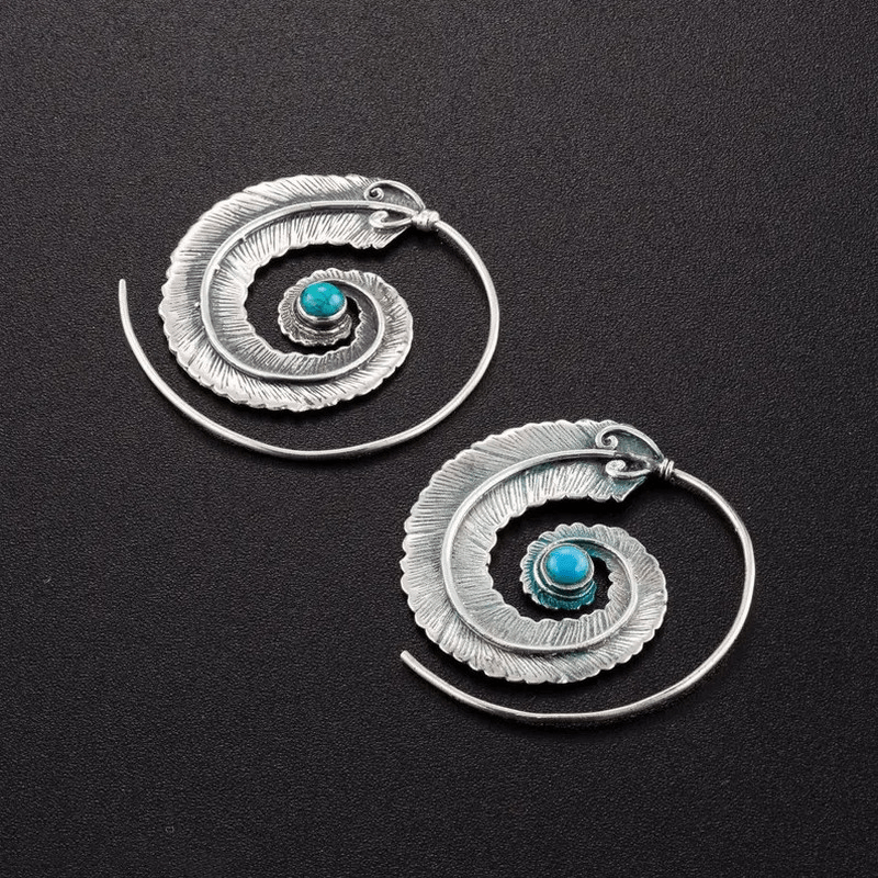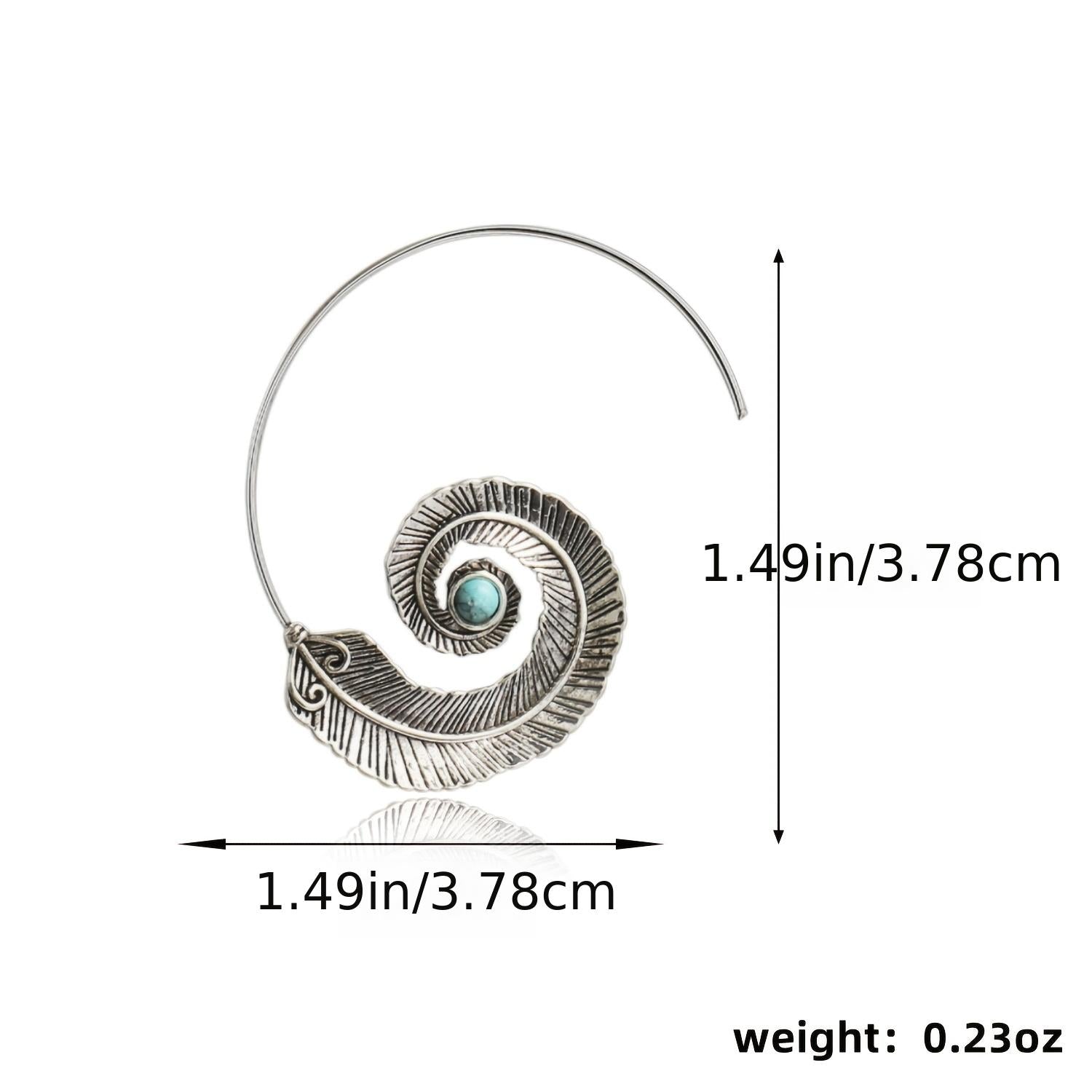 These vintage dangle earrings feature a geometric spiral feather design with intricate metal engravings. Perfect for your wife or friends, these earrings add a touch of bohemian style to any outfit.