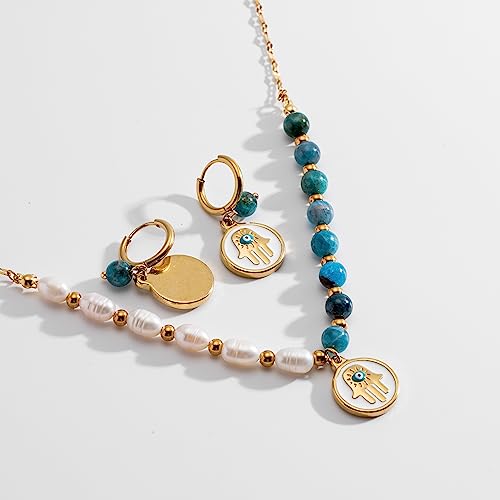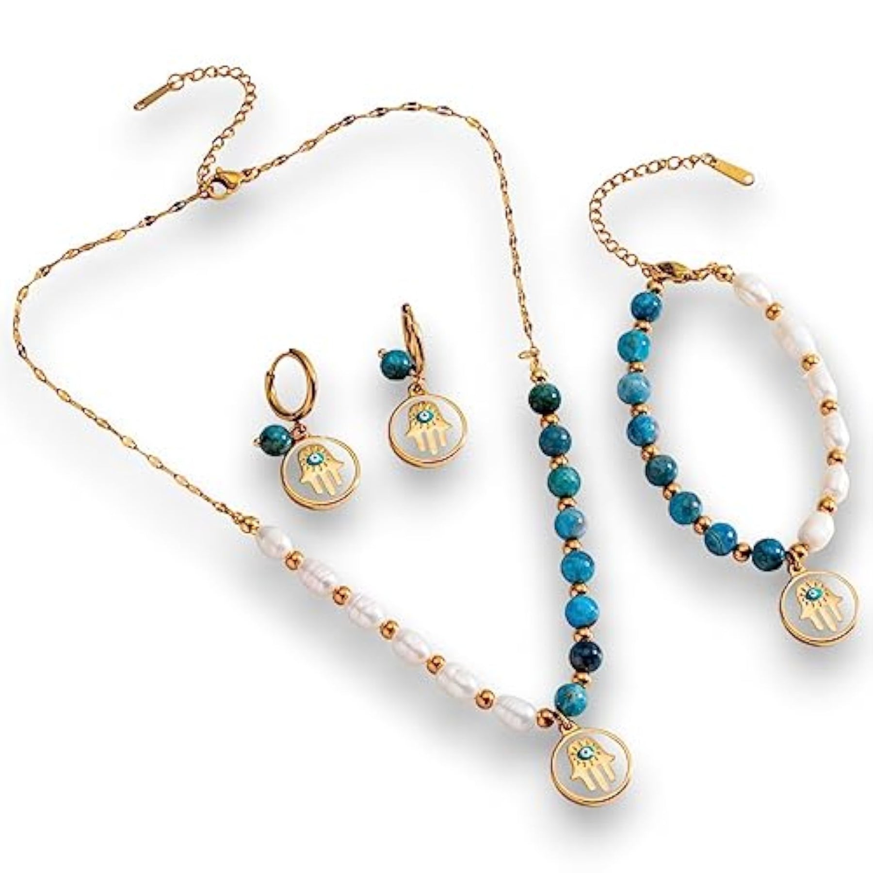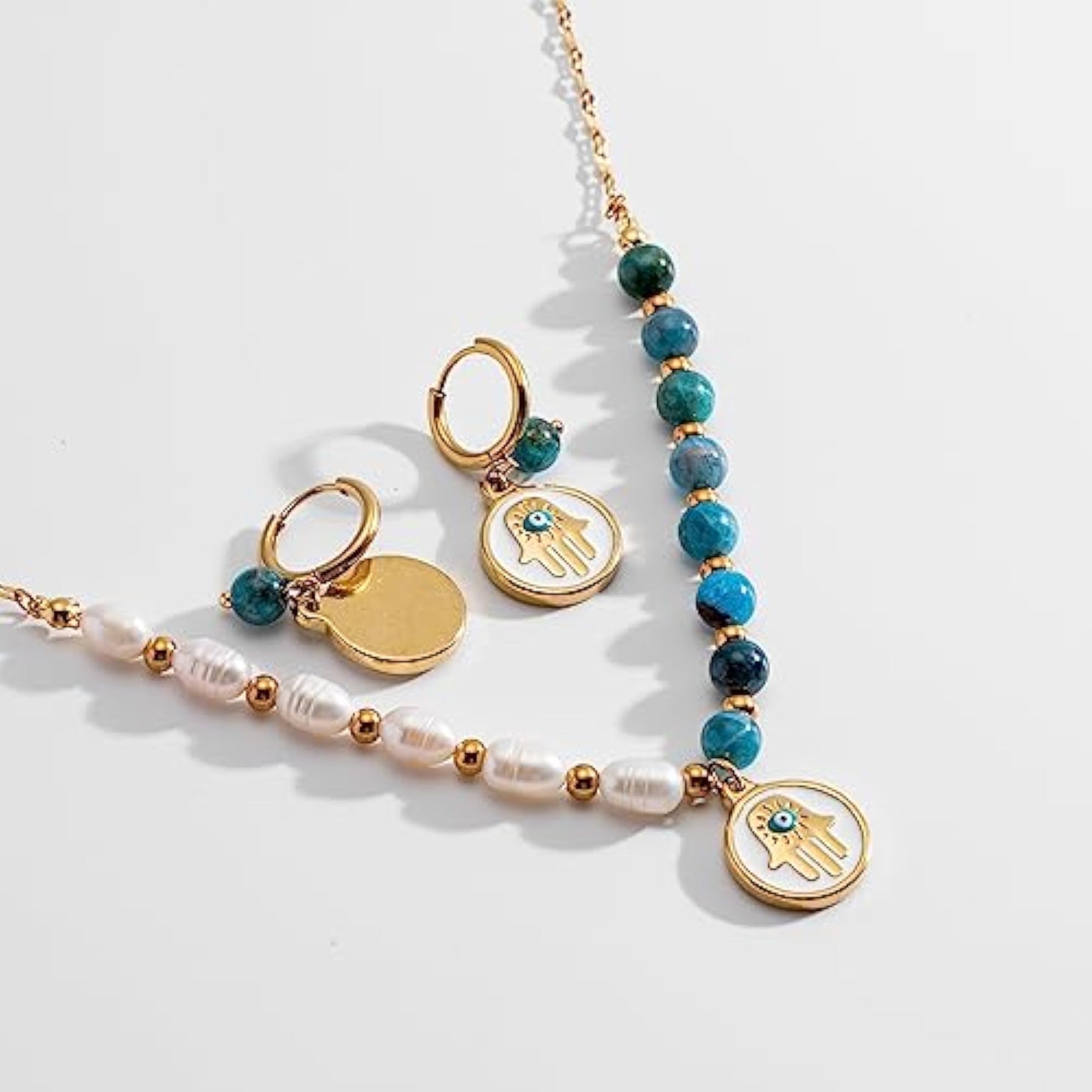 Stay protected with this stunning Evil Eye Hamsa Hand jewelry set featuring a natural stone bracelet, necklace, and earrings.