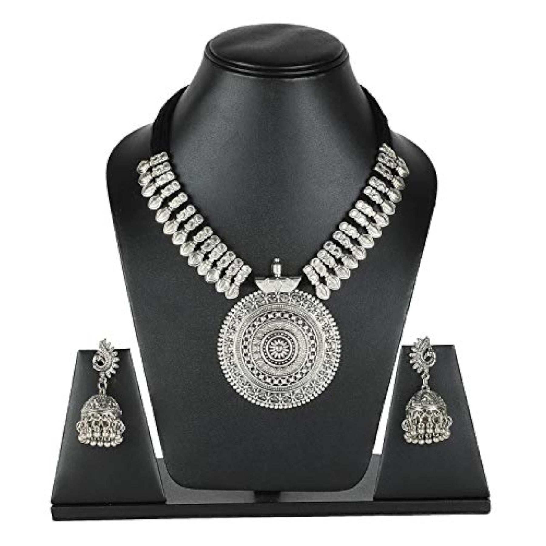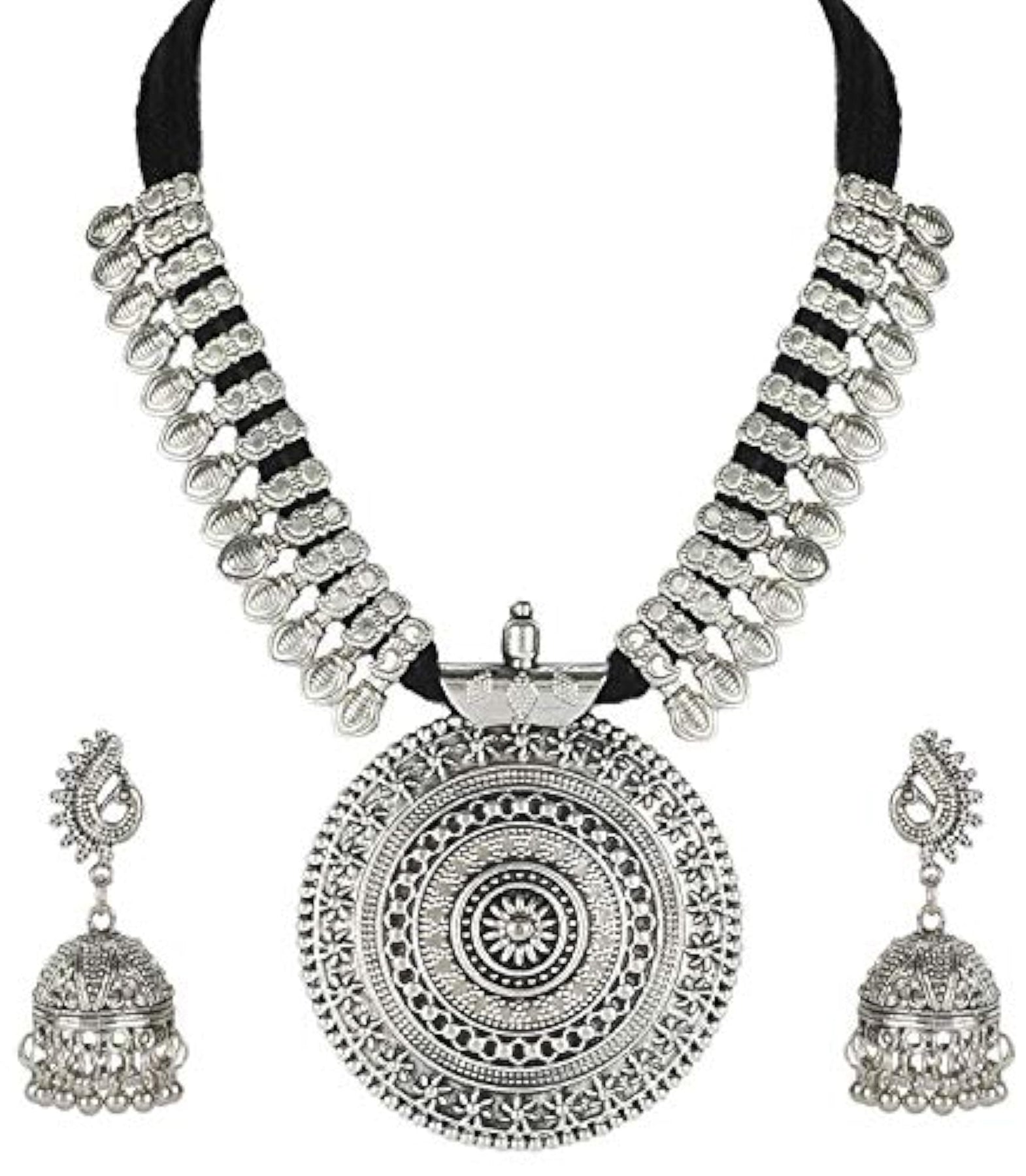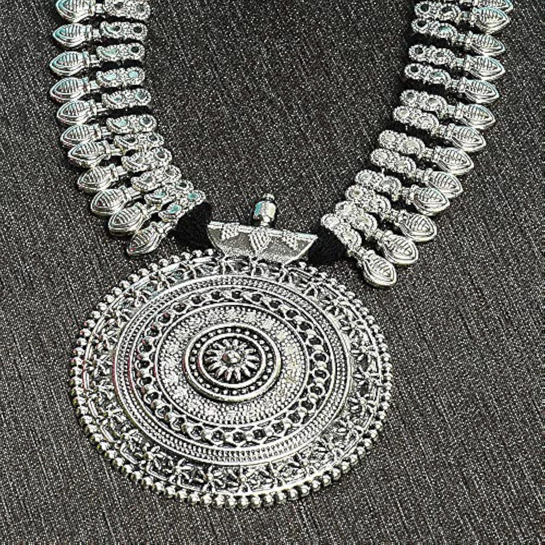 Elegant oxidised silver necklace set with intricate design.