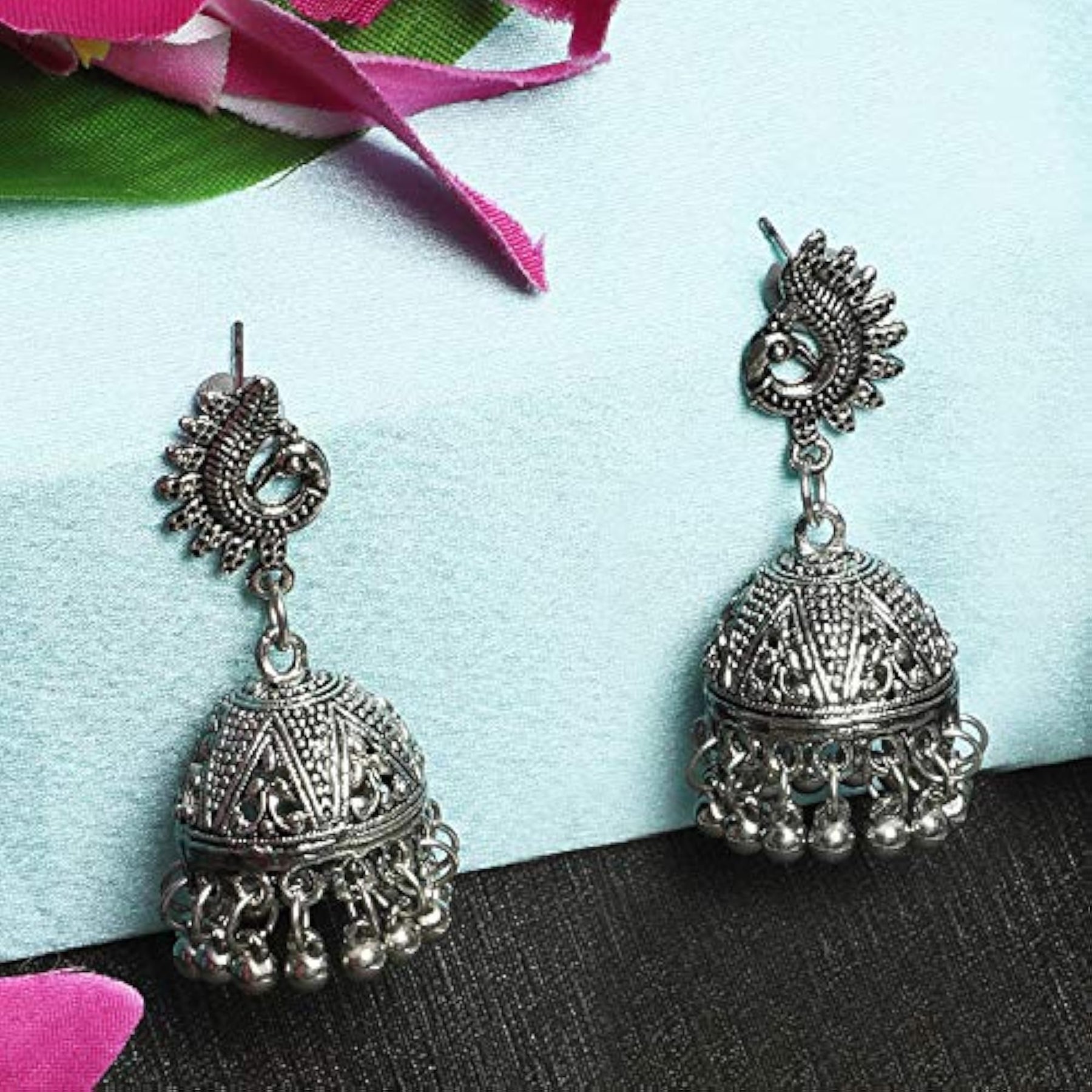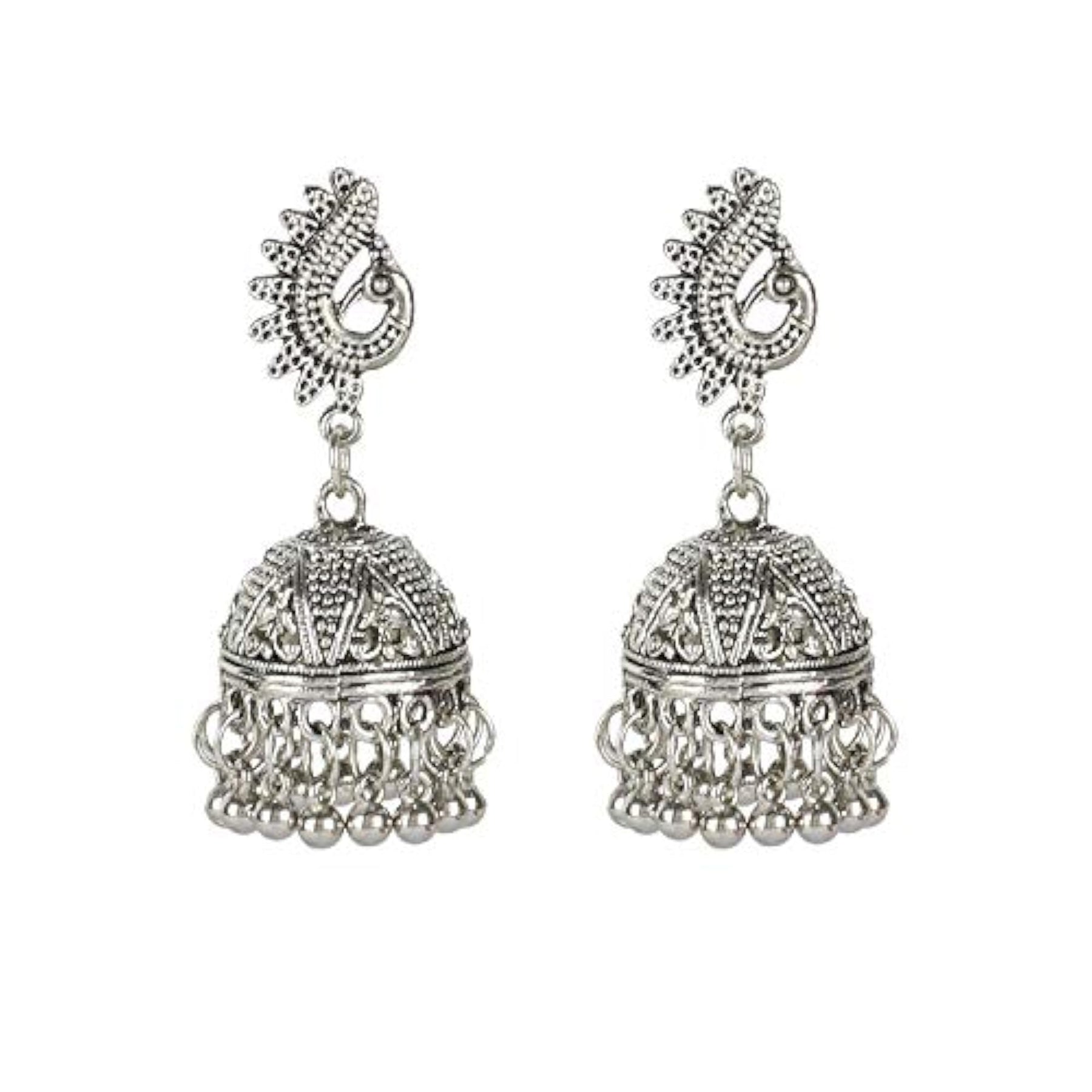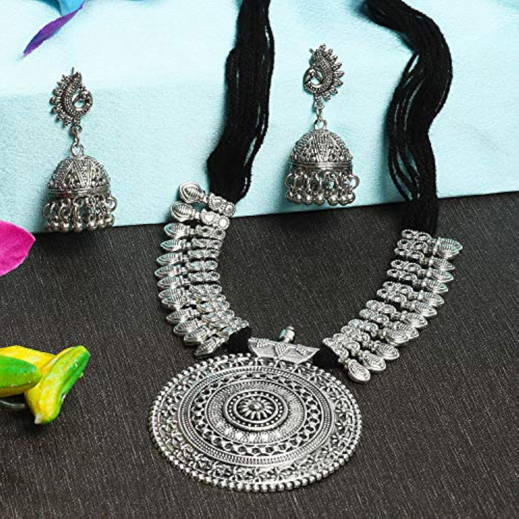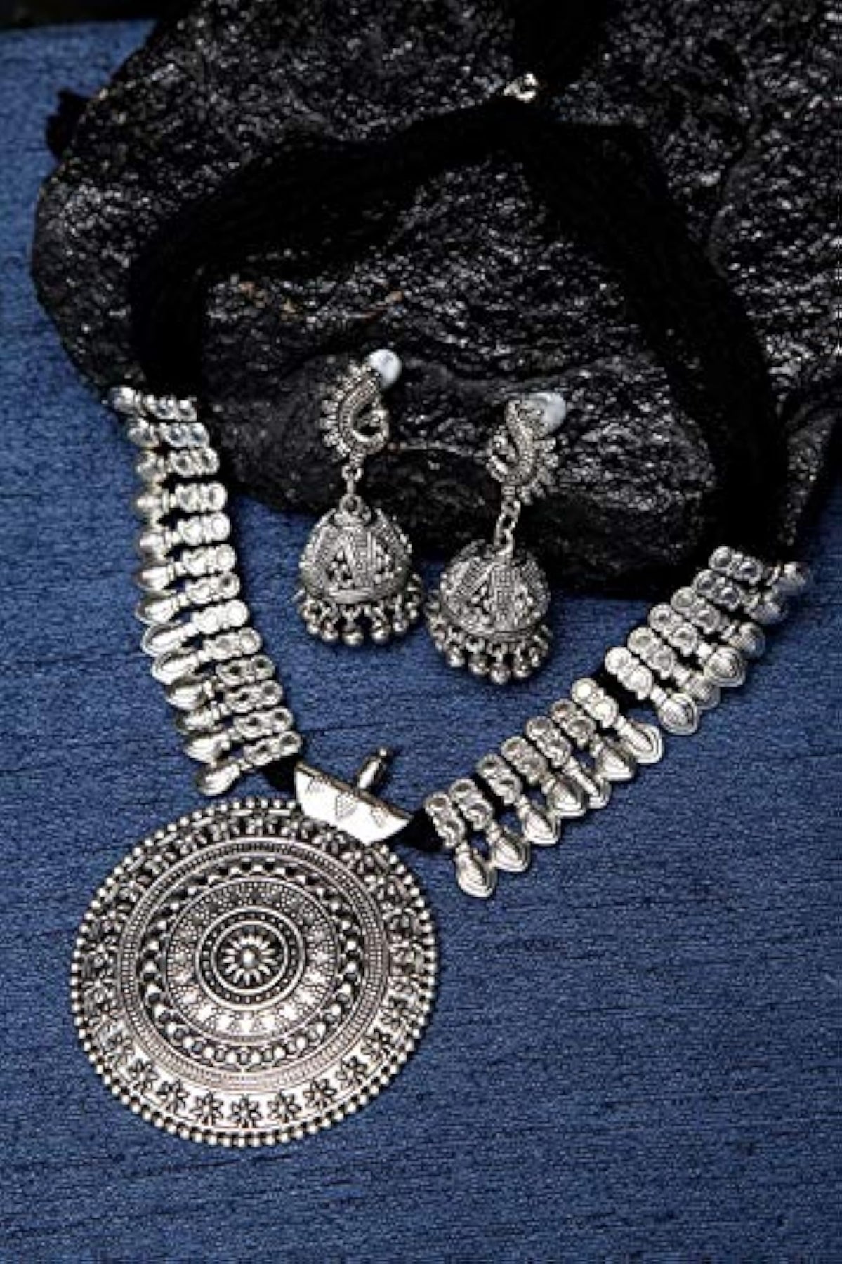 Elegant oxidised silver necklace set with intricate design.