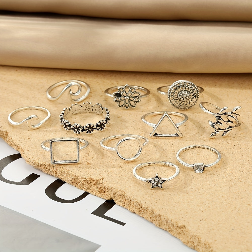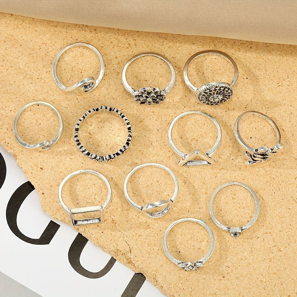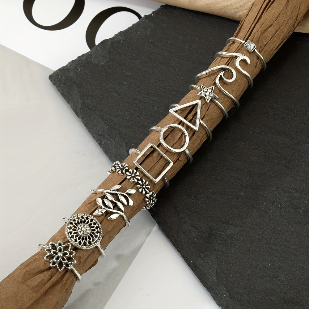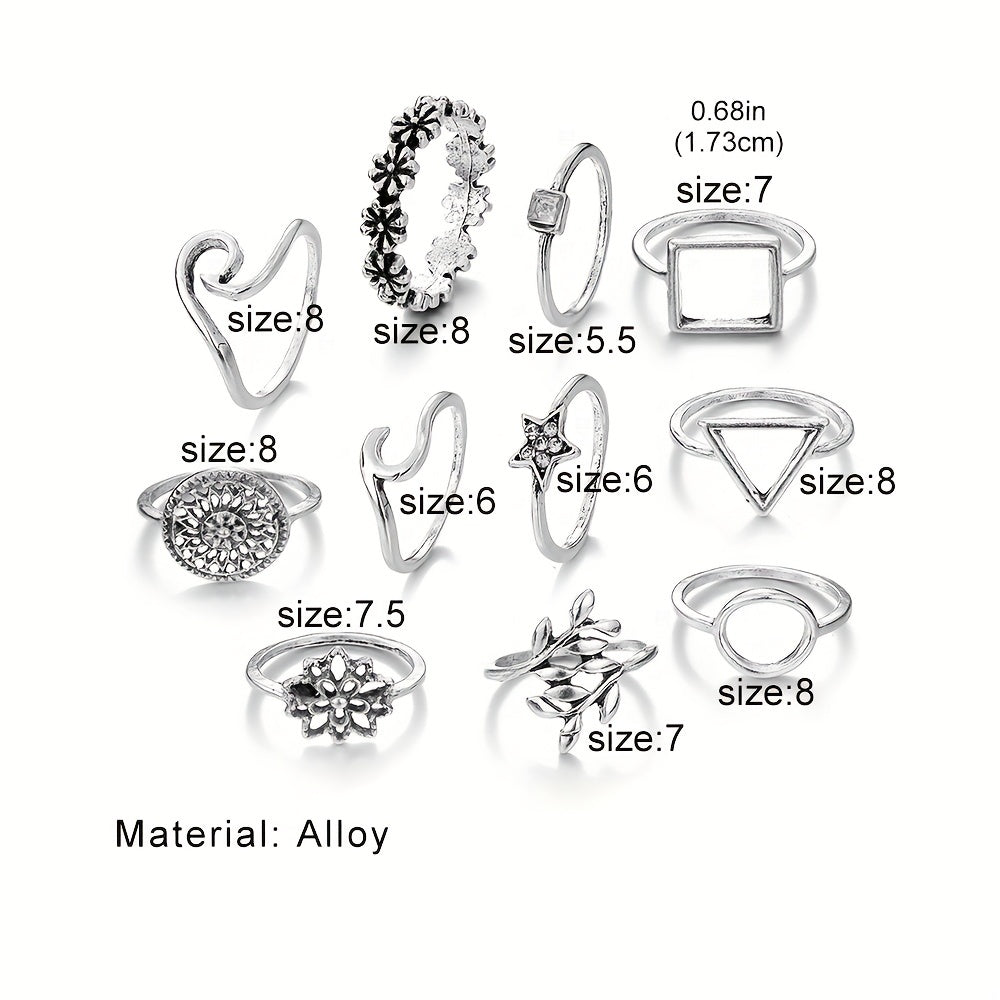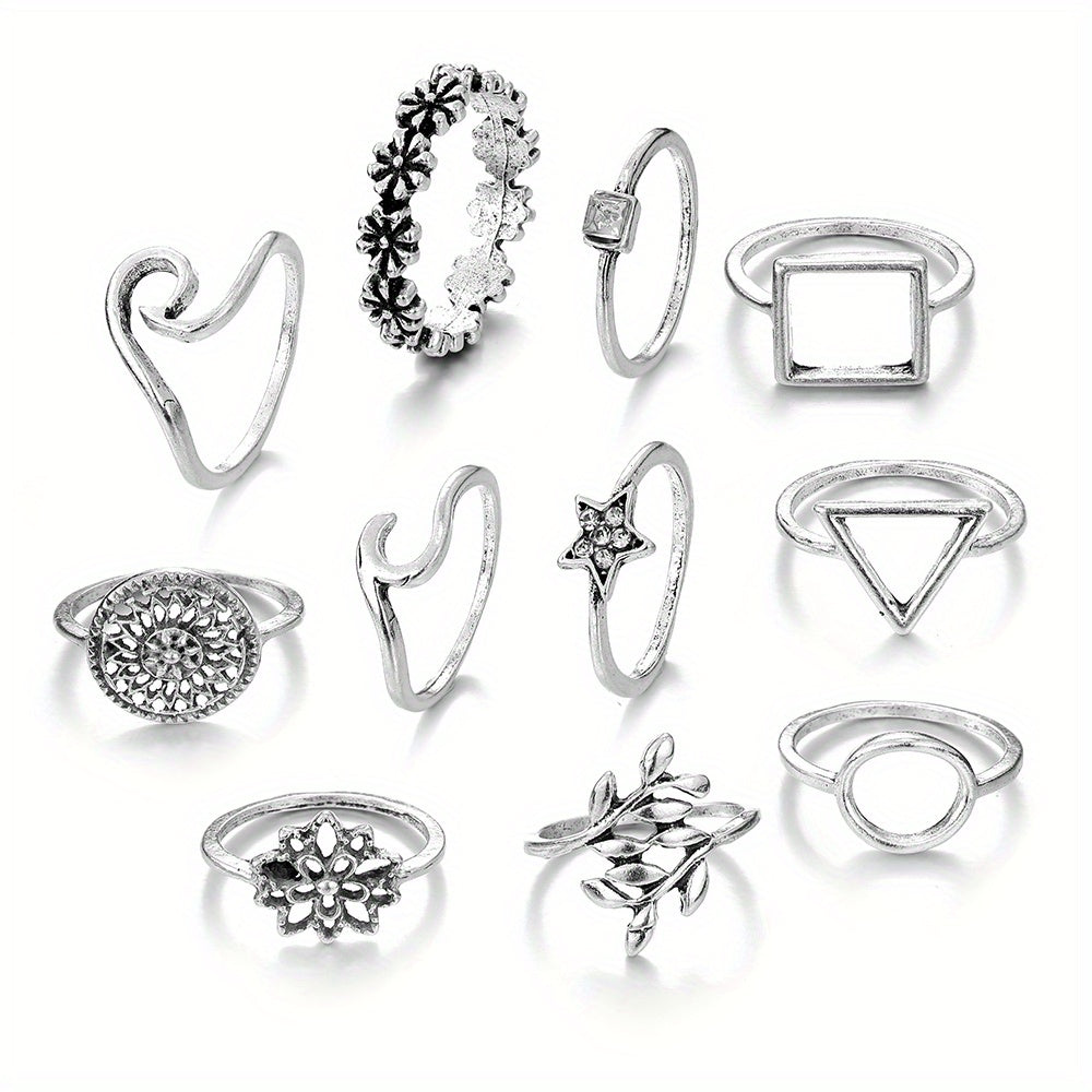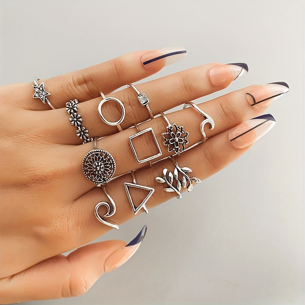 Add a touch of gothic elegance to your look with this set of 11 stacking rings featuring star, flower, and vine shapes. Made of zinc alloy, these rings can be mixed and matched to create your own unique style.
