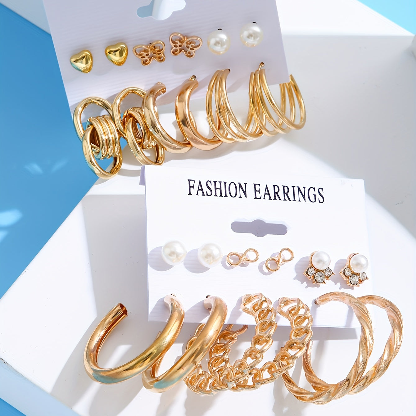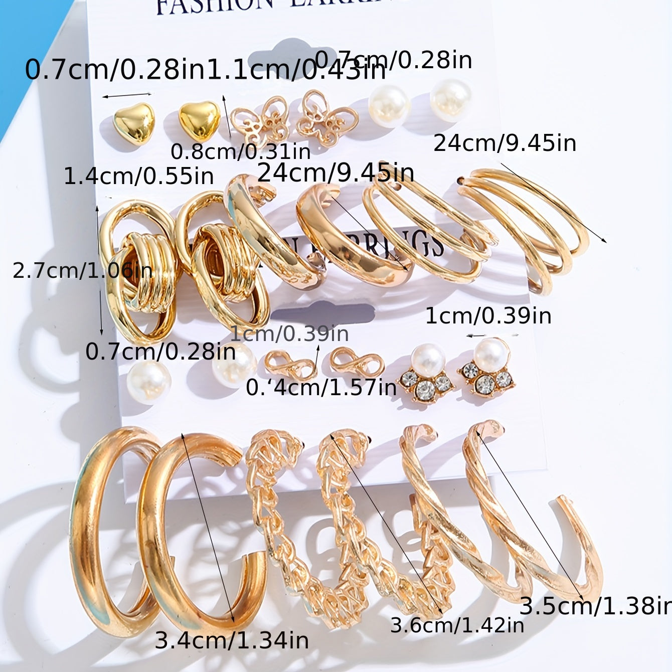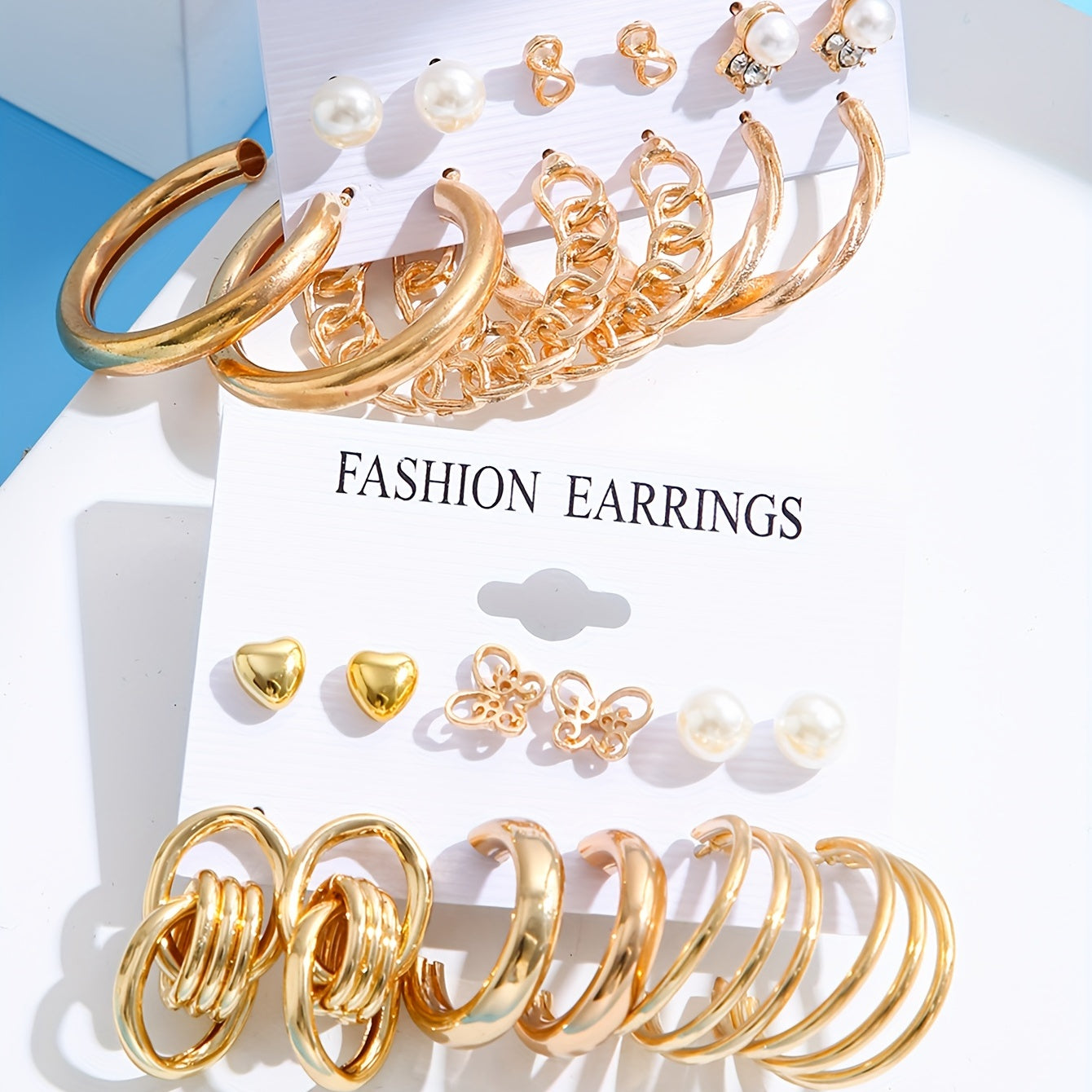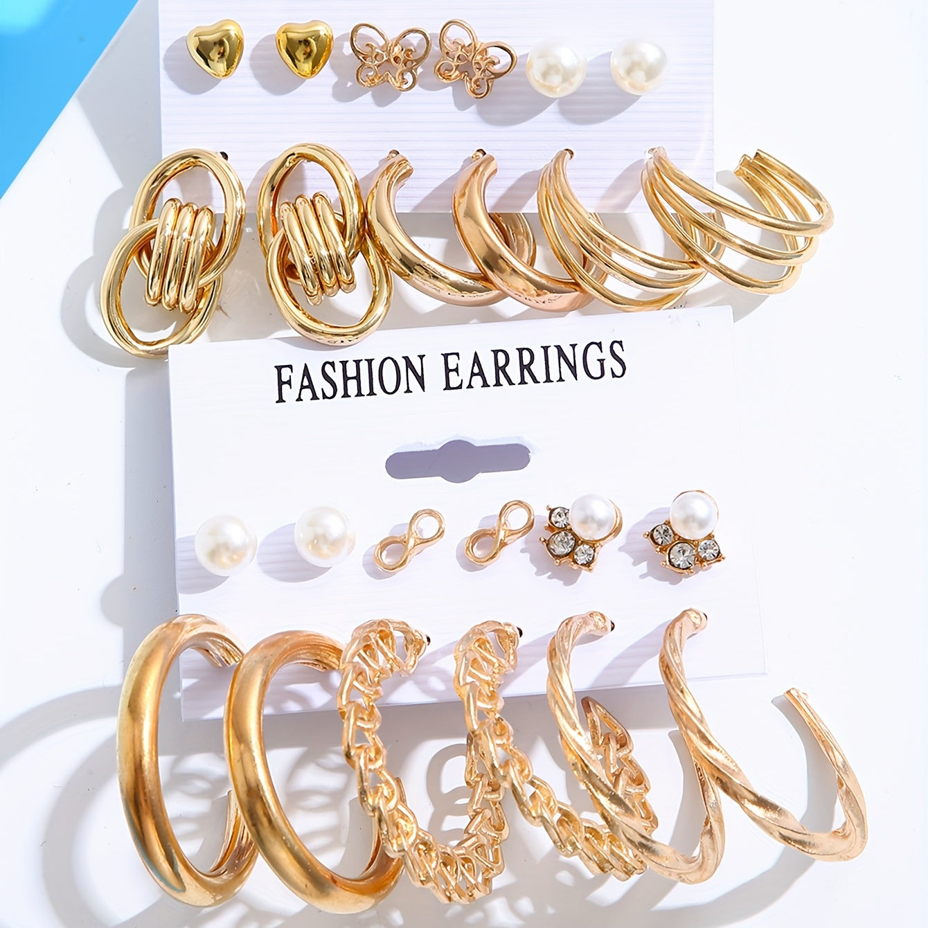 This set includes 12 pairs of golden stud earrings and hoop earrings, made of zinc alloy. Ideal gift for women.