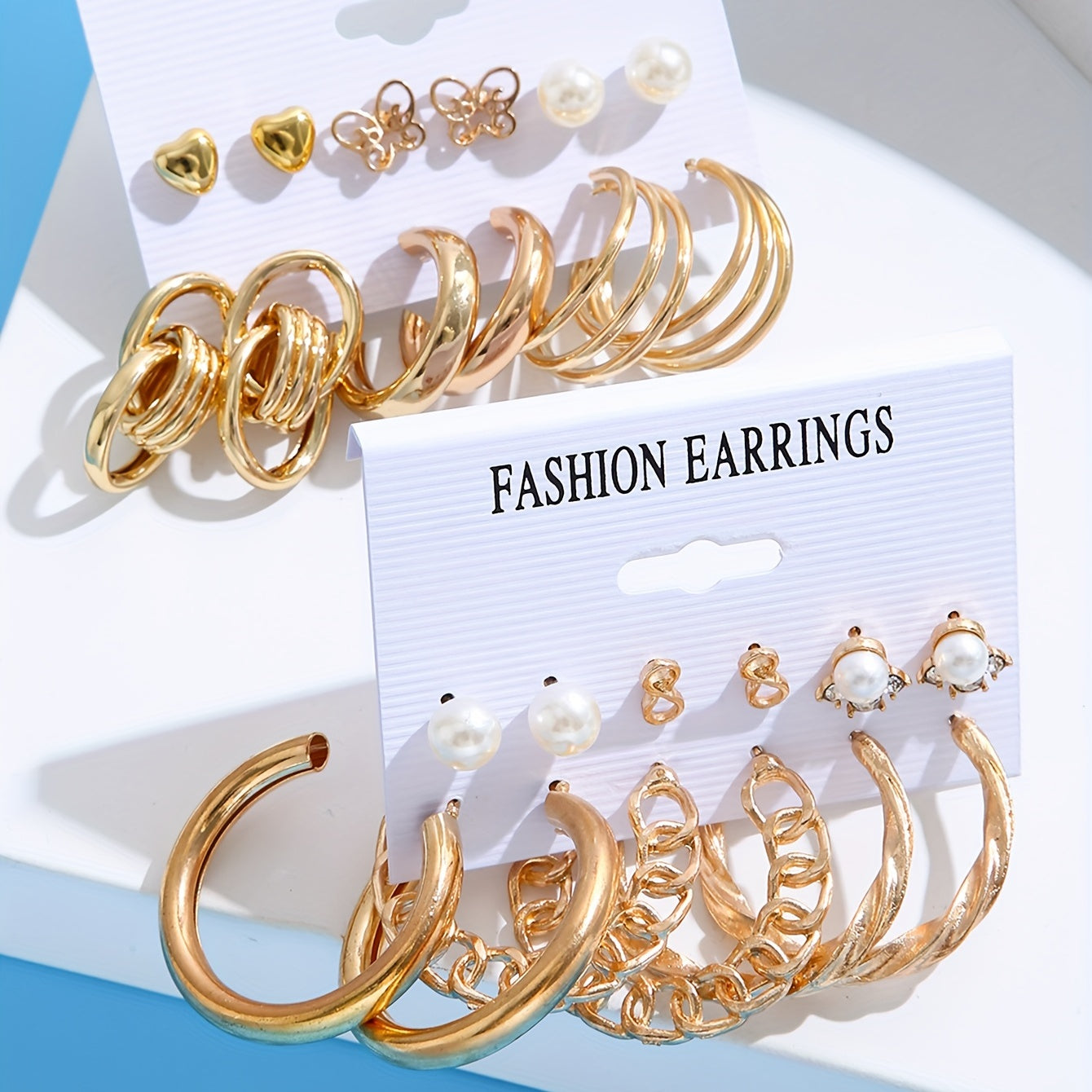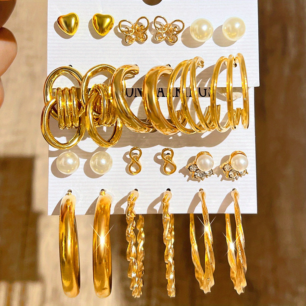 12 Pairs Golden Stud & Hoop Earring Set Fashion Jewelry Gift