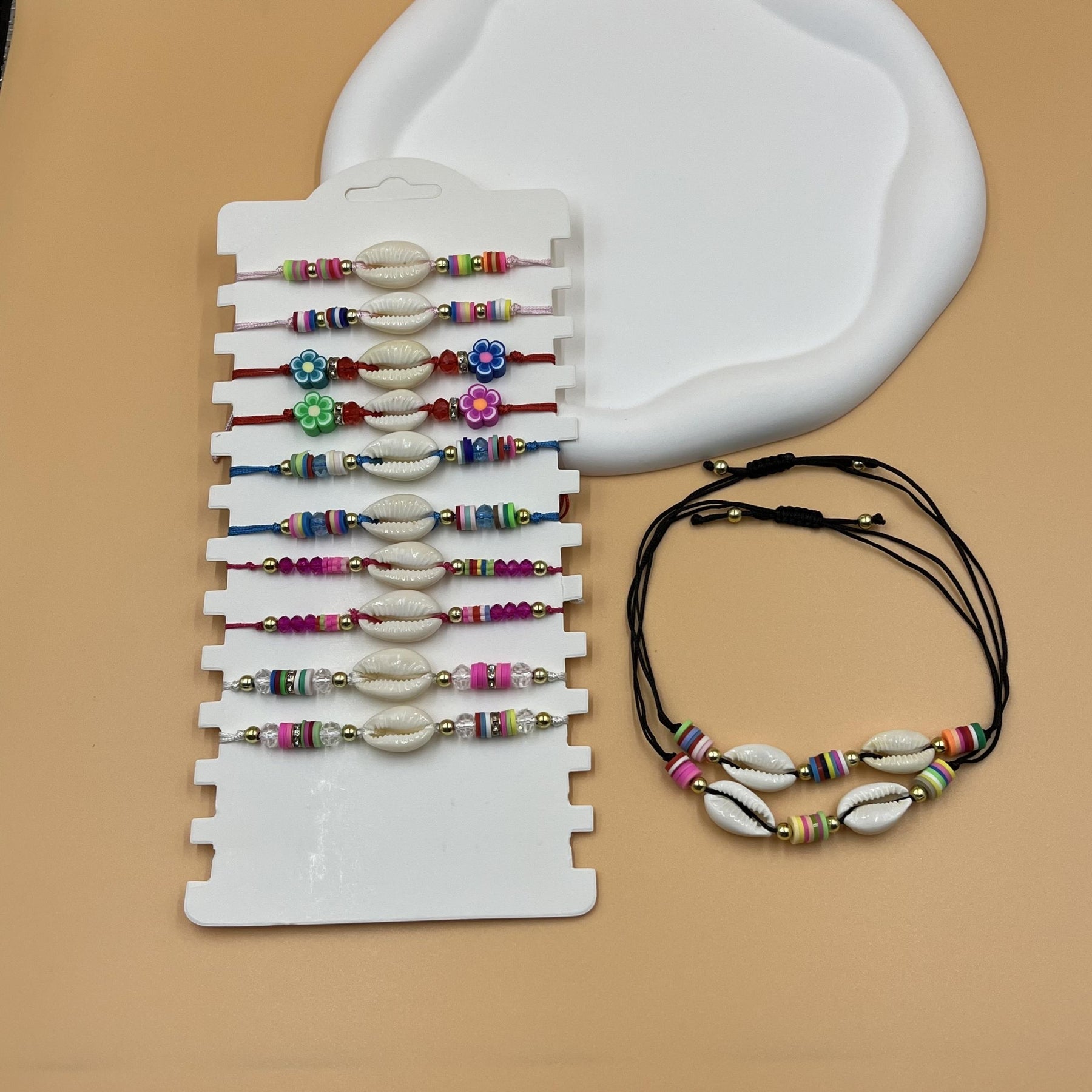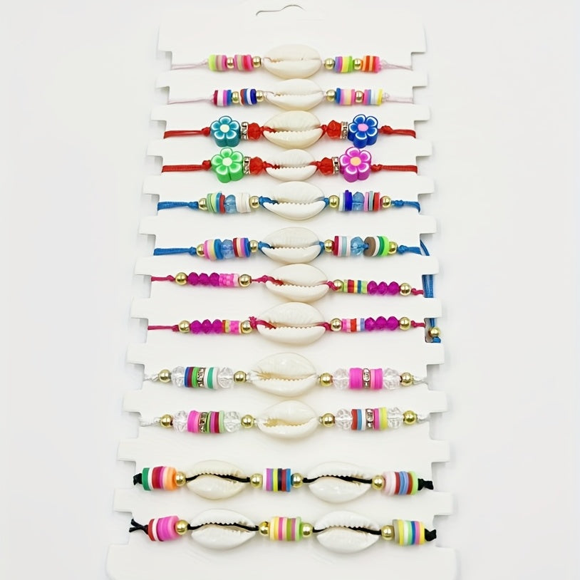 Get summer-ready with this set of 12 bohemian soft pottery flower shell beads friendship bracelets. Perfect for adding a touch of ocean style to your hand jewelry collection or to give as a holiday gift to women.