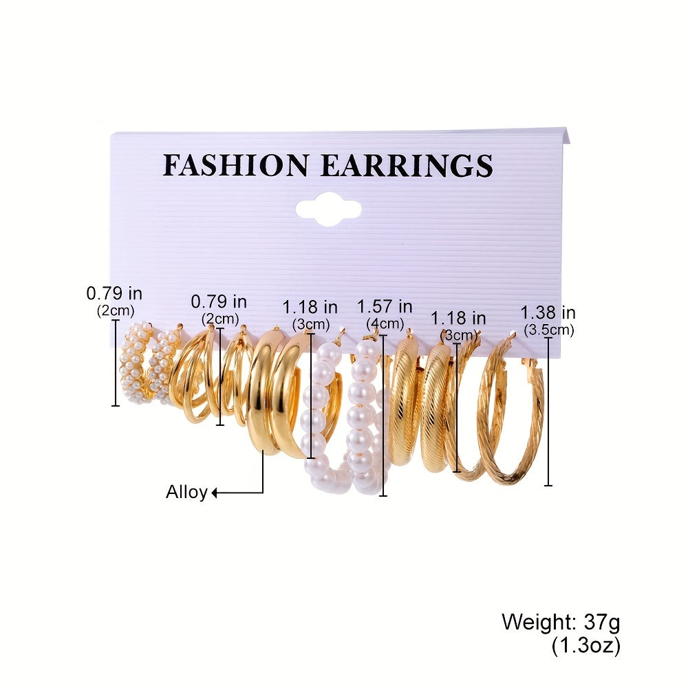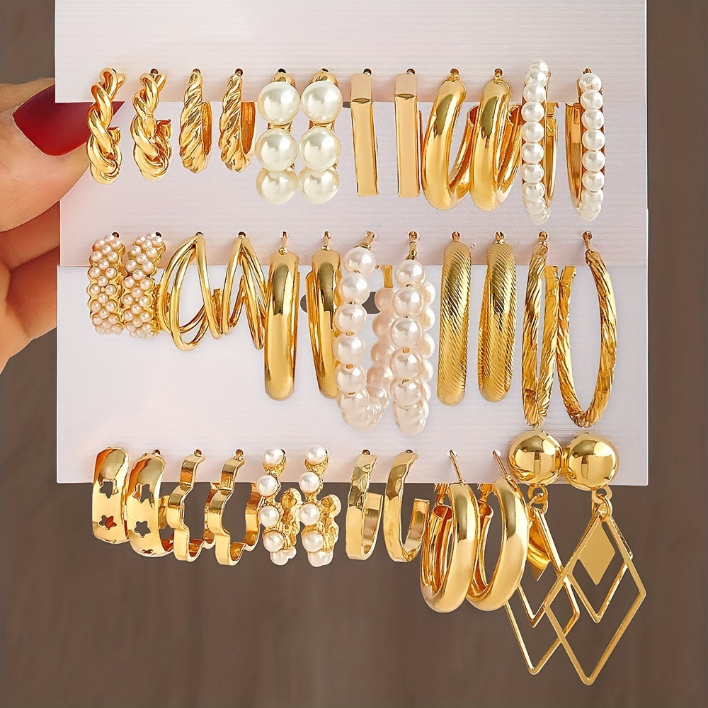• 18 pairs of golden hoop earrings with faux pearl decor