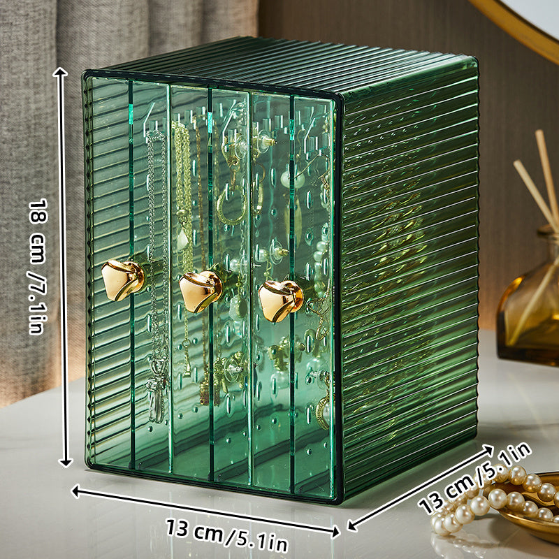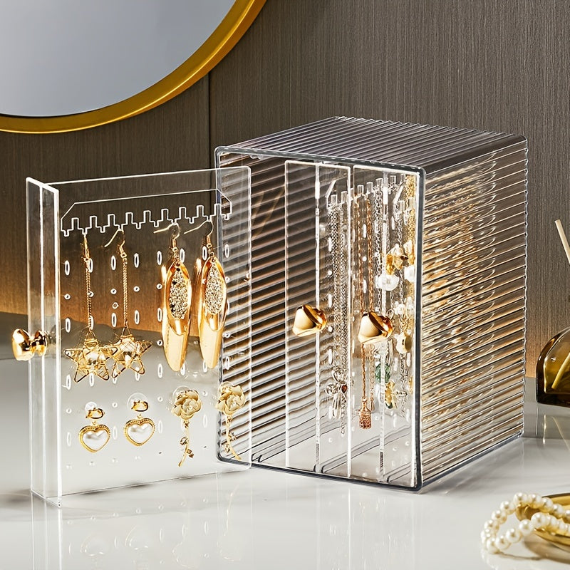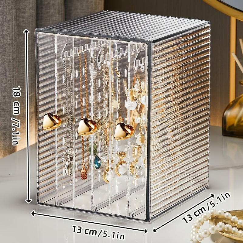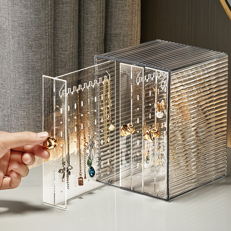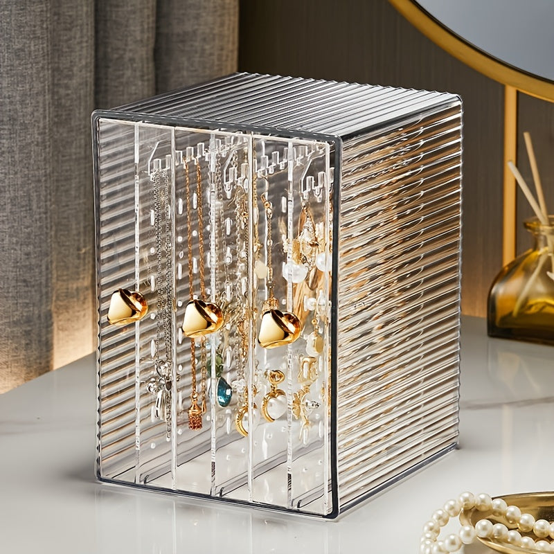 This transparent plastic box can hold earrings, necklaces, bracelets, and rings. It has a large capacity and is perfect for organizing your jewelry accessories.