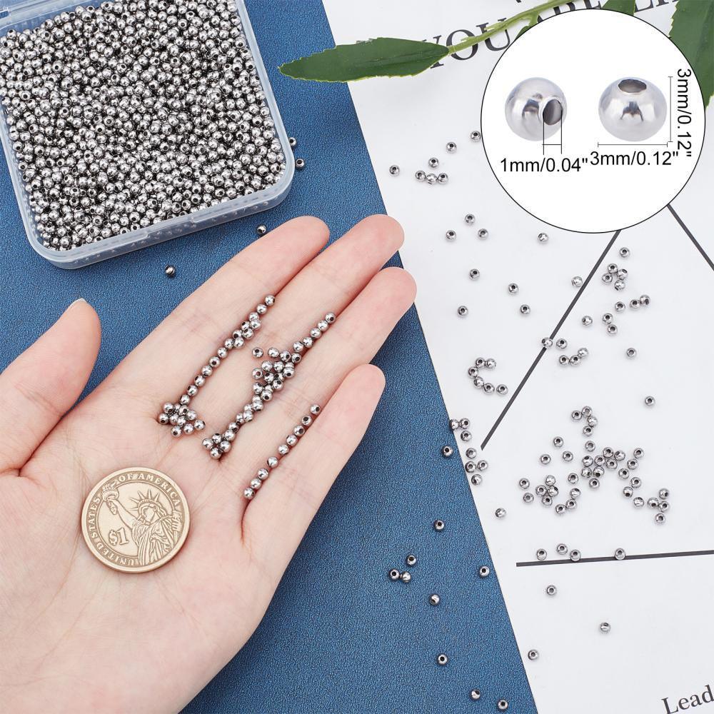 This box contains 2000pcs of stainless steel beads, perfect for jewelry craft making. Each bead is hollow round with a size of 3x3mm and a hole diameter of 1mm.